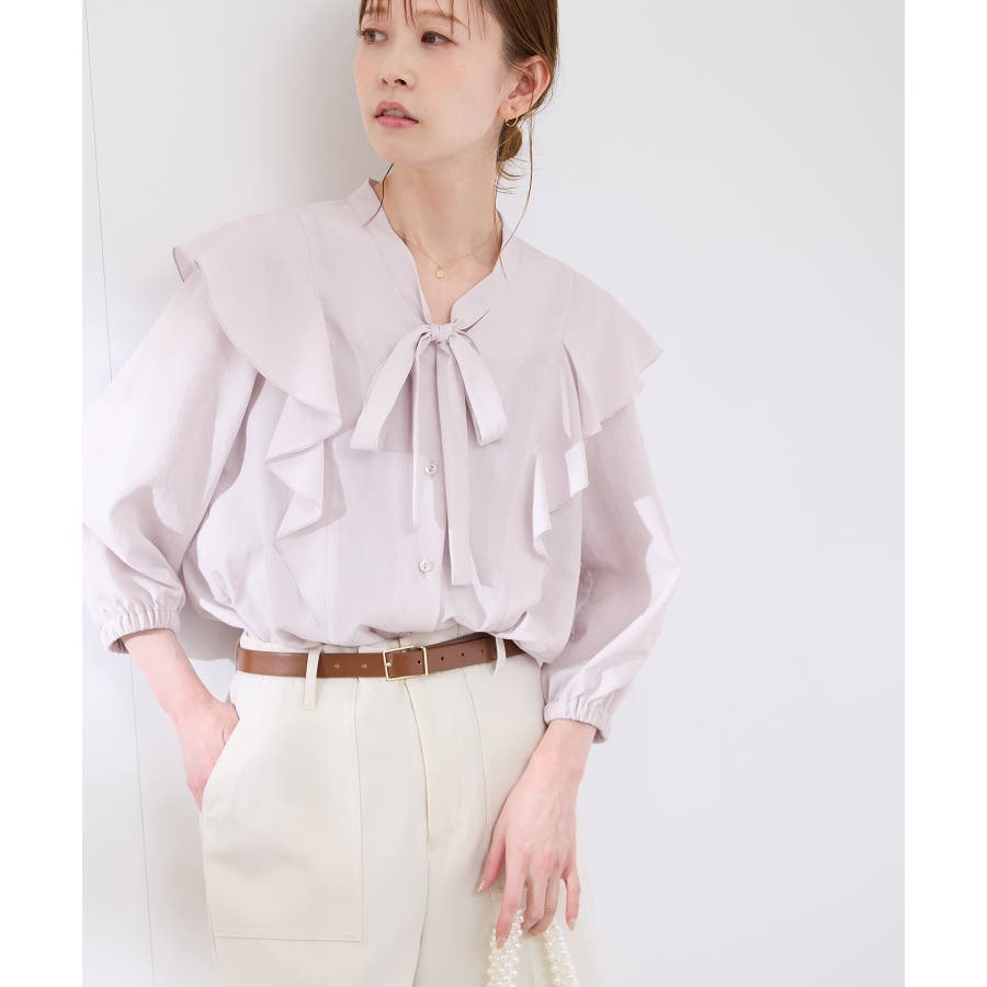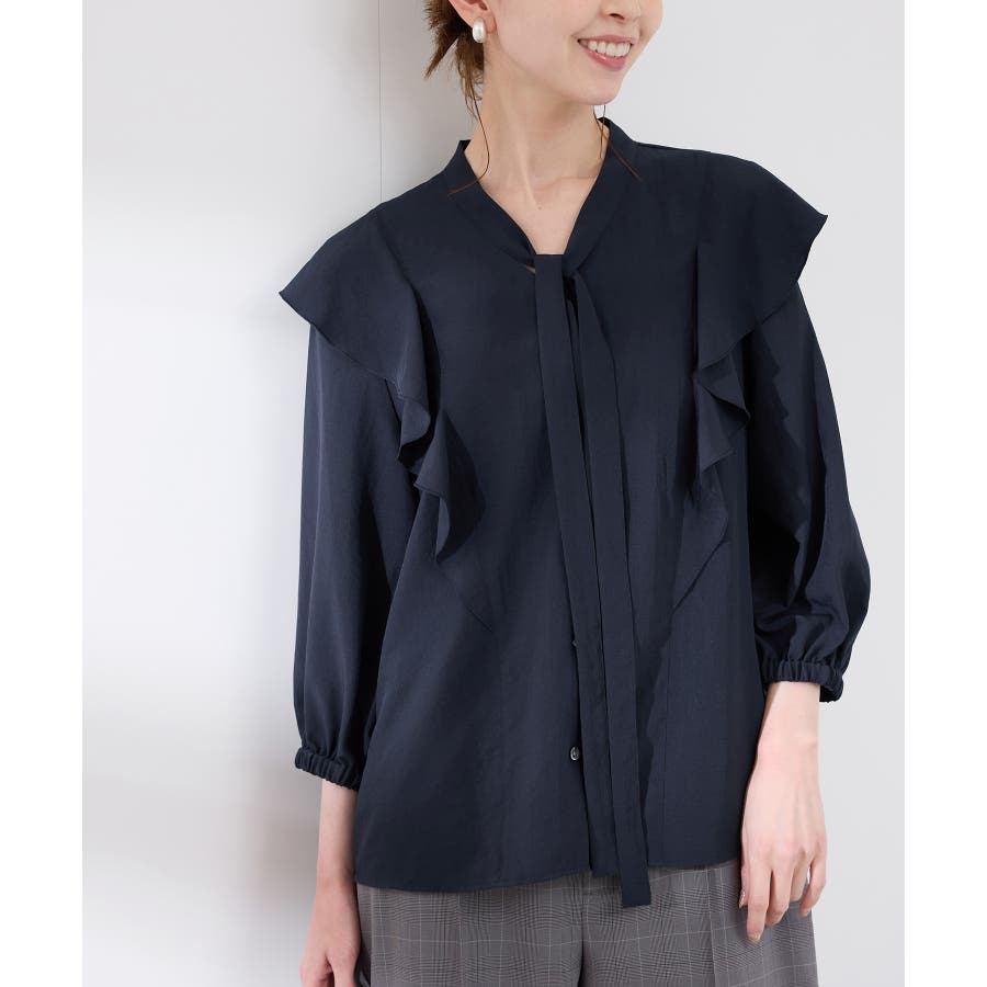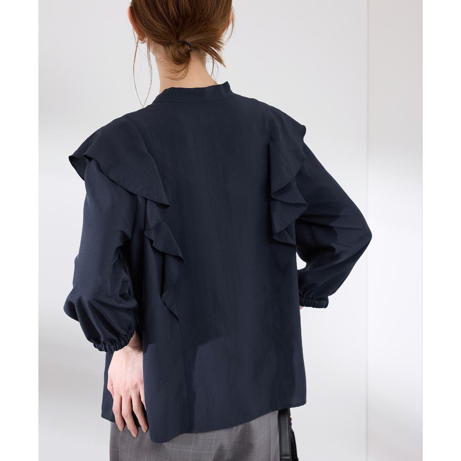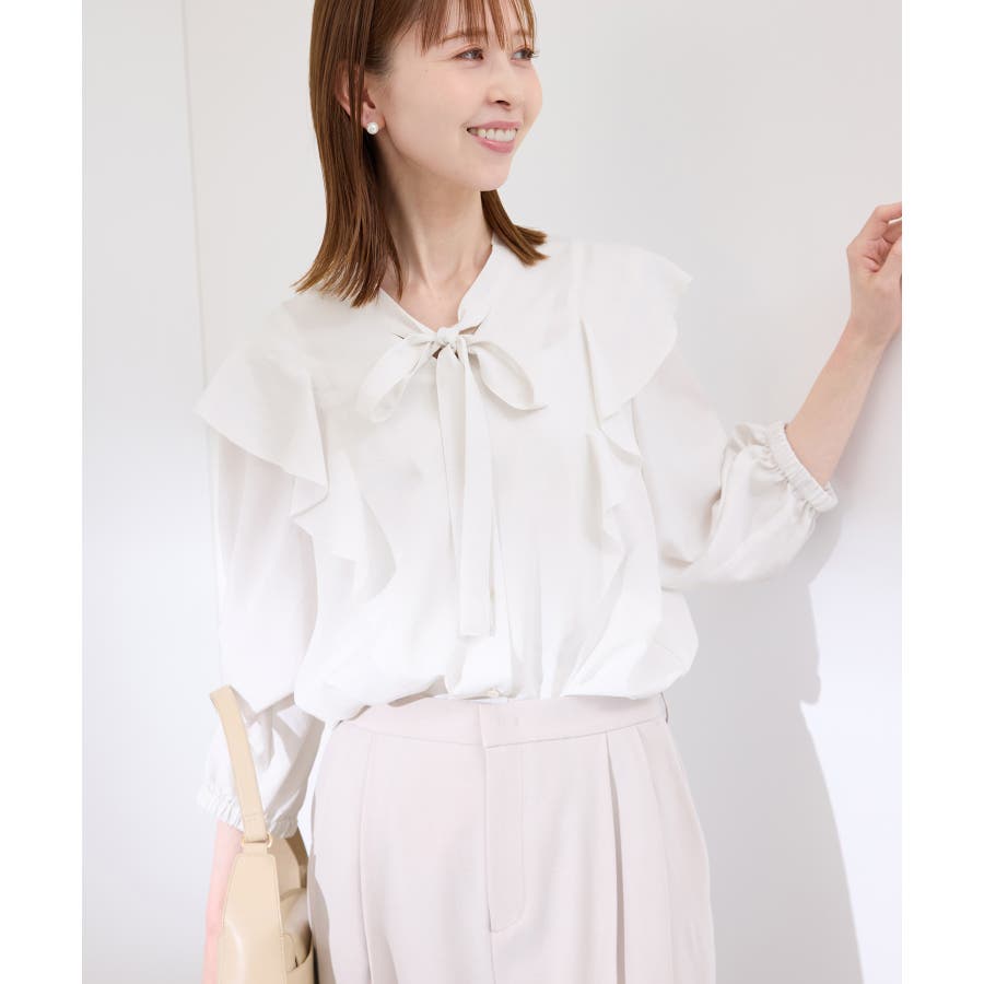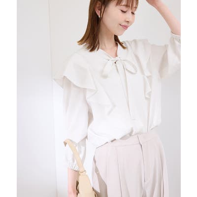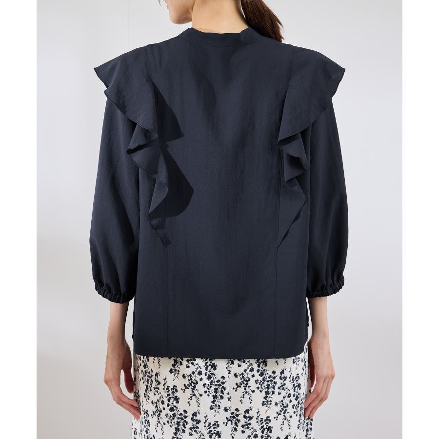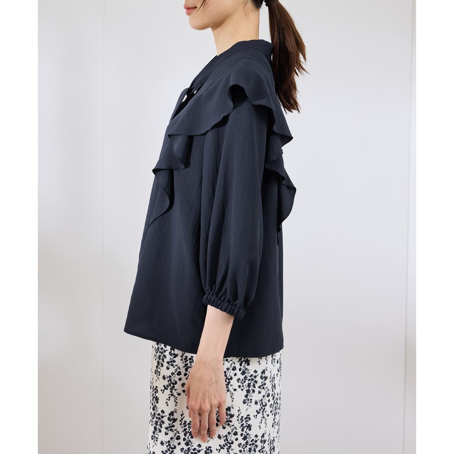 ・肩から身頃にかけてラッフルがあしらわれた華やぎブラウス。