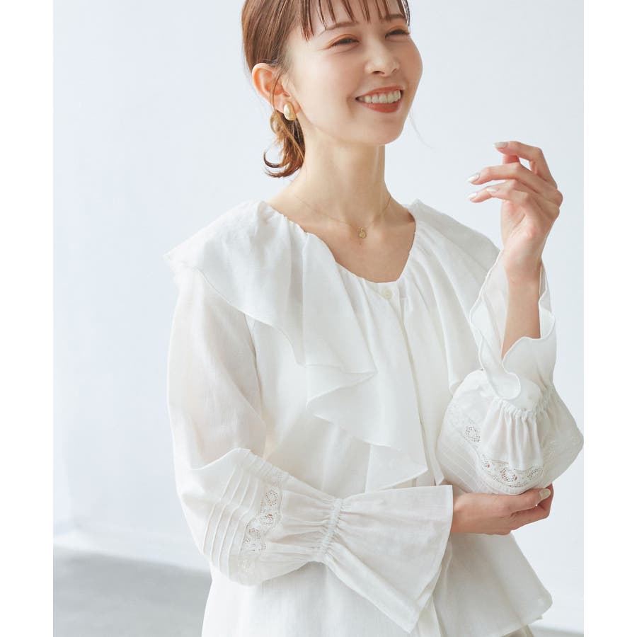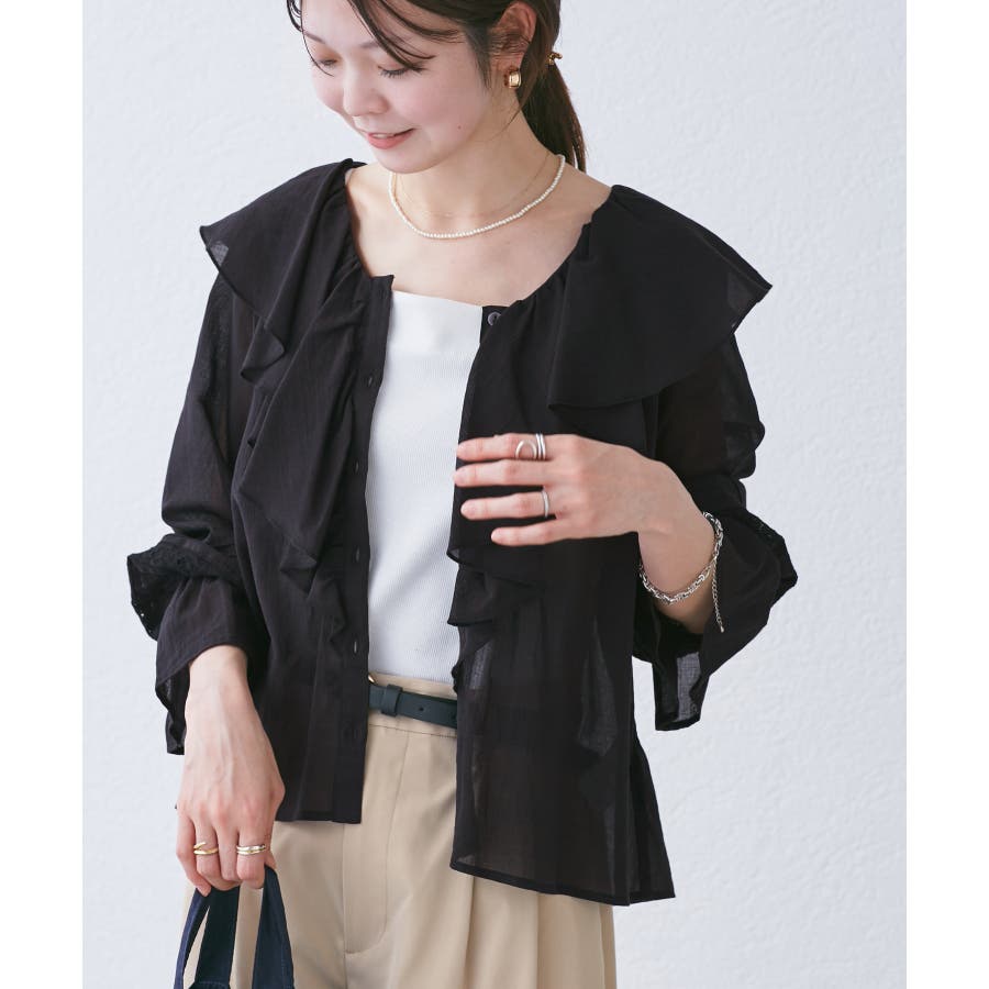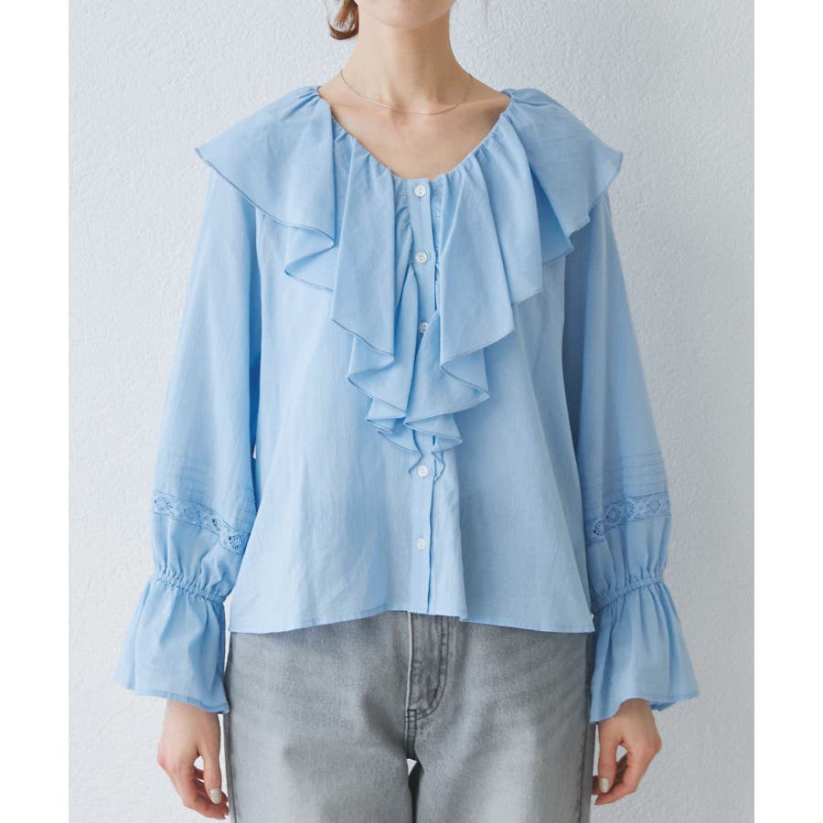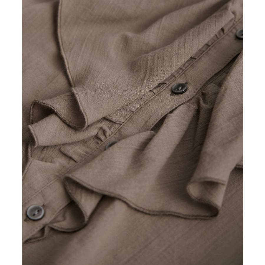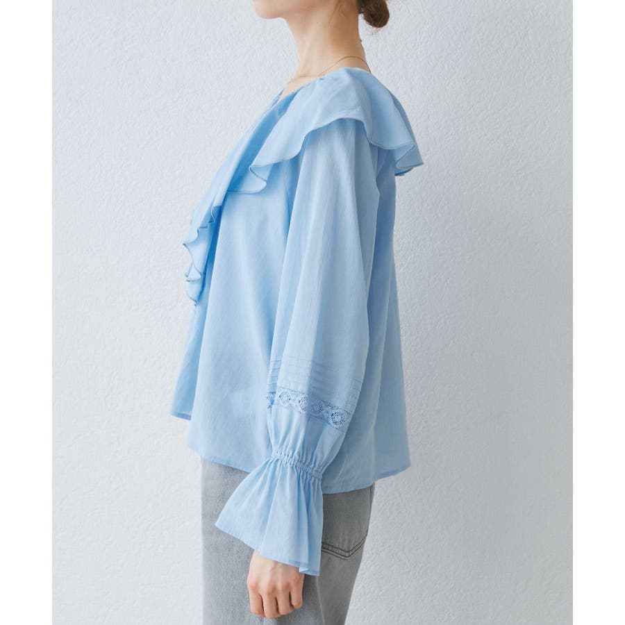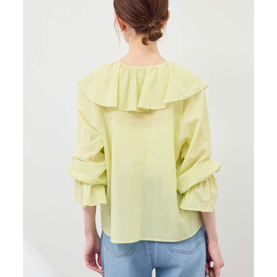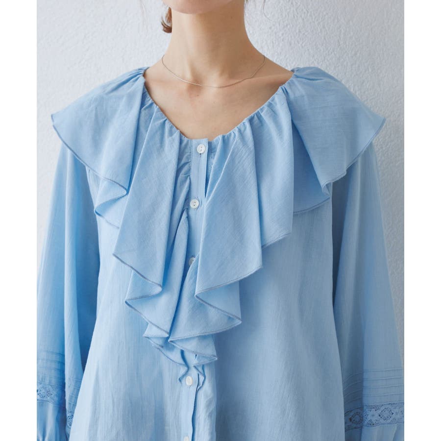 ・フロントにかけてたっぷりとあしらわれたラッフル襟が特徴。