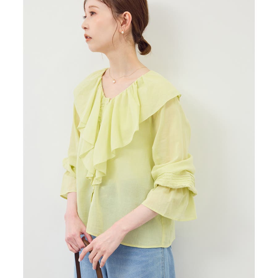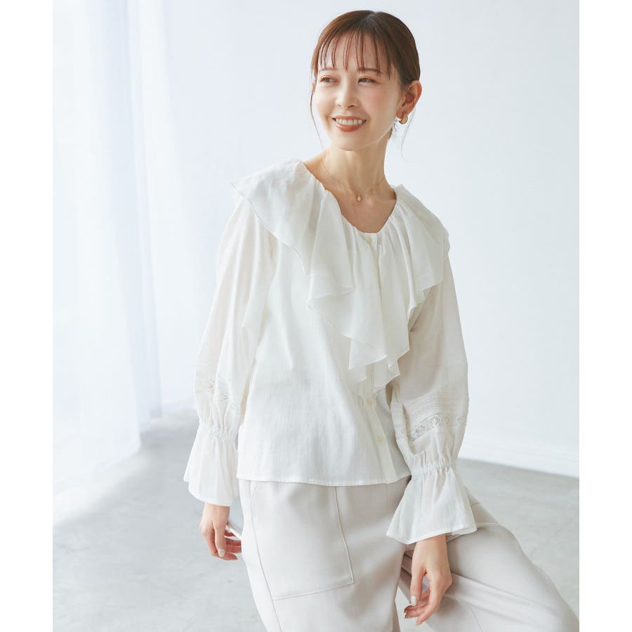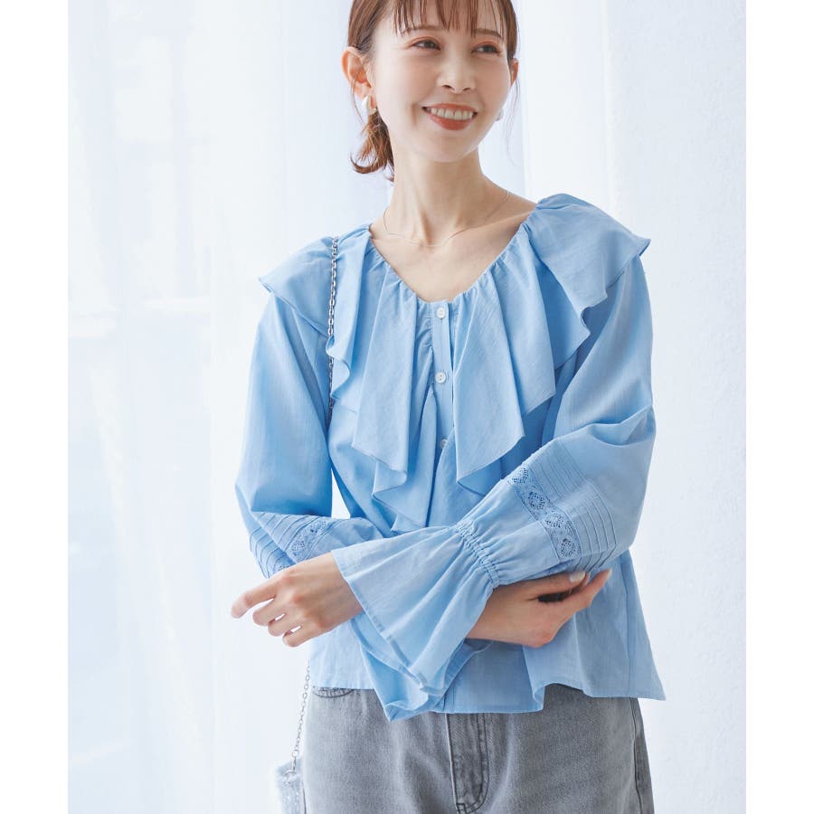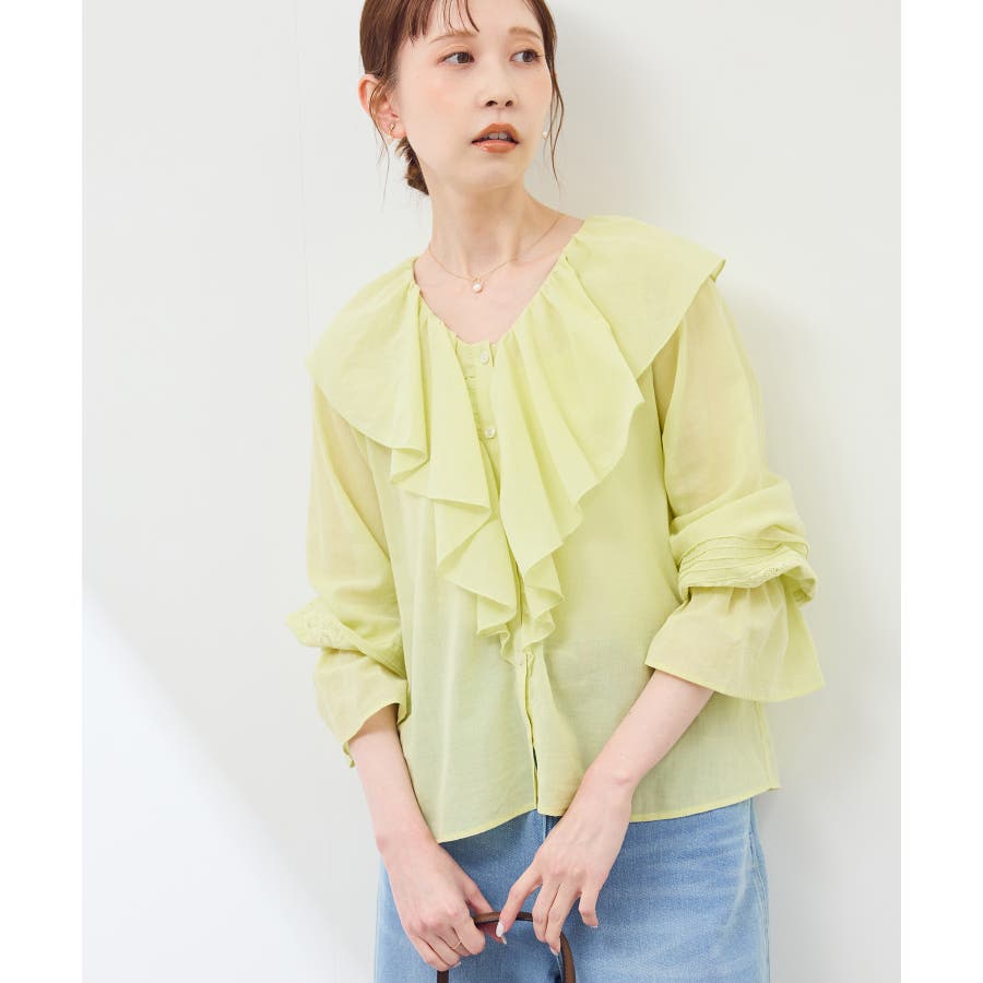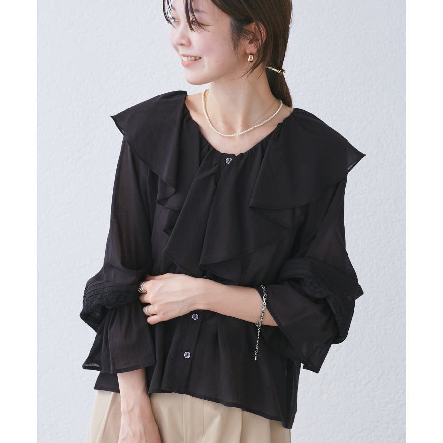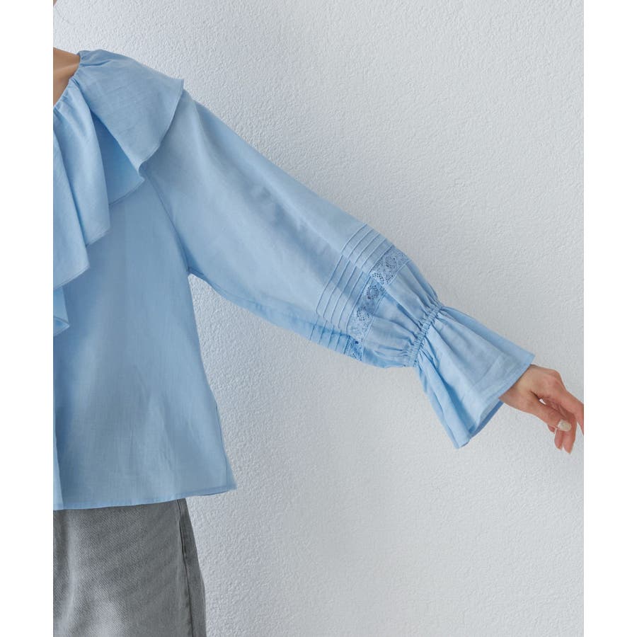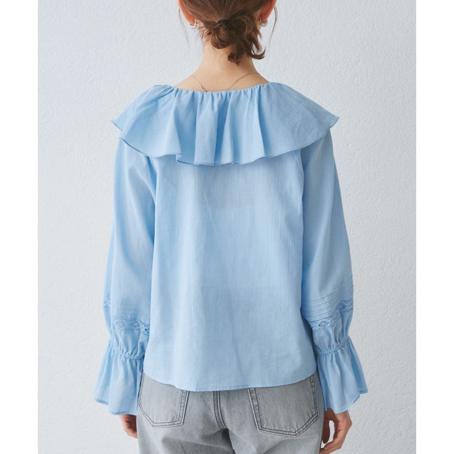 ・フロントにかけてたっぷりとあしらわれたラッフル襟が特徴。