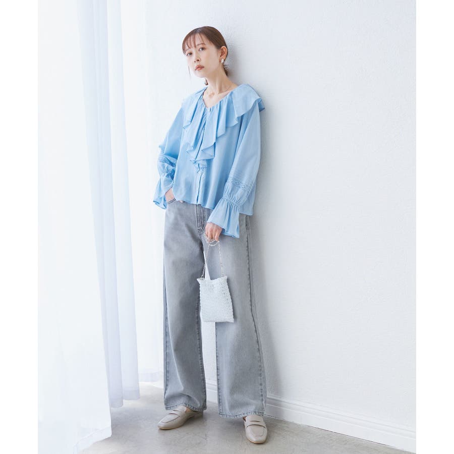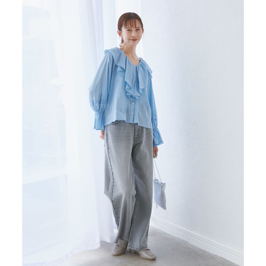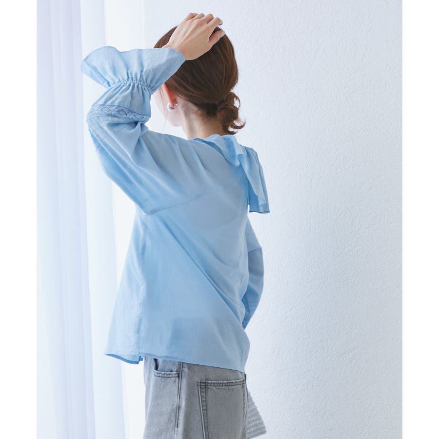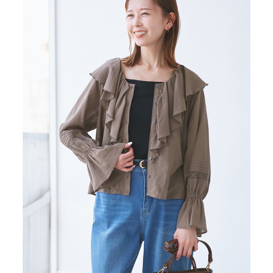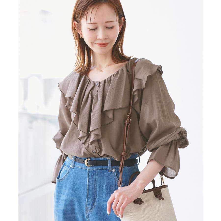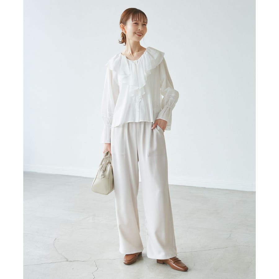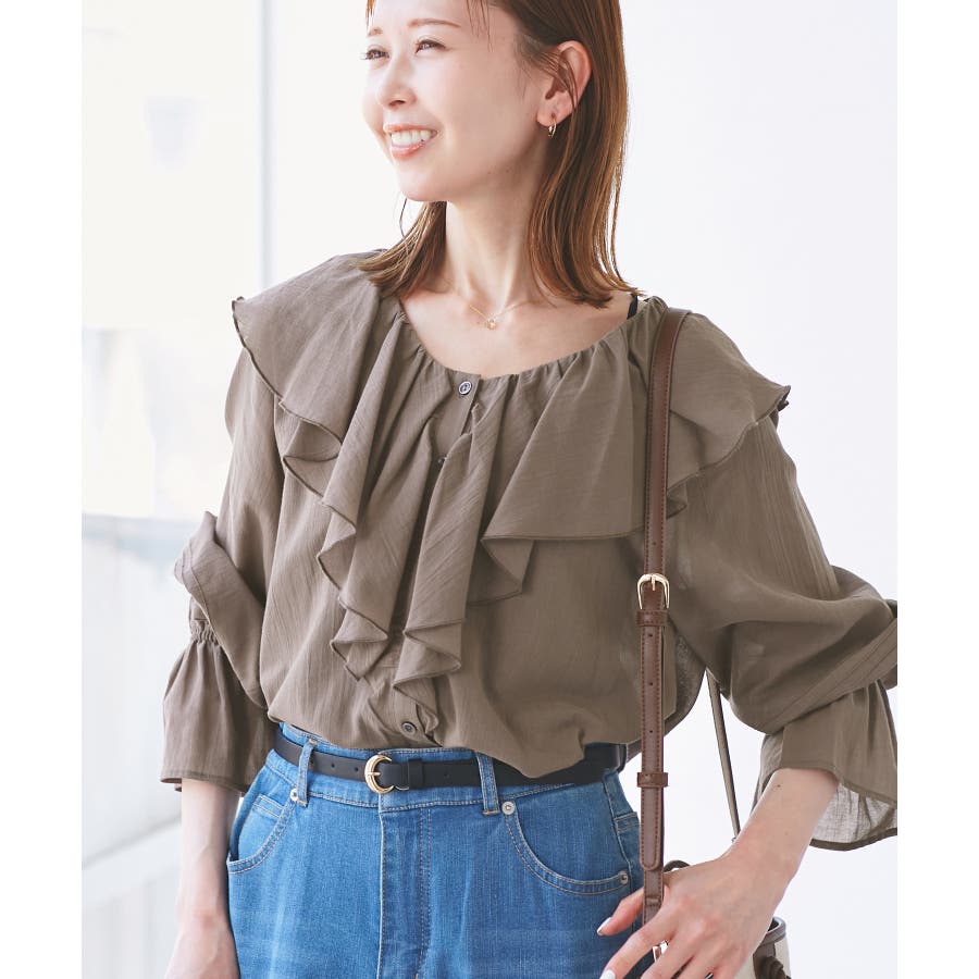 ・フロントにかけてたっぷりとあしらわれたラッフル襟が特徴。