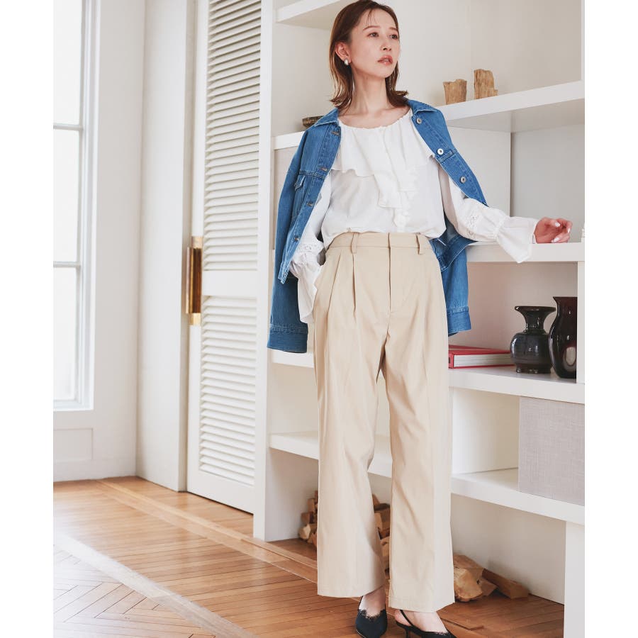・オフホワイトやサックスブルーは、同系色のボトムで軽やかにコーデすると◎。