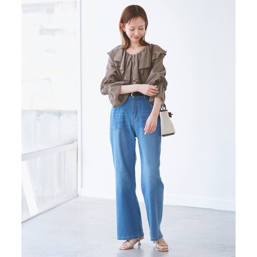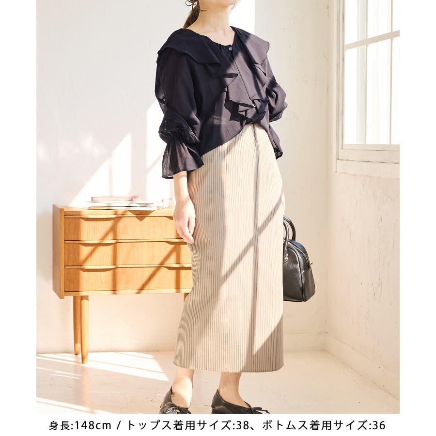 ・ラッフルはウエスト位置まで施されており、裾をボトムインしてももたつきなし。