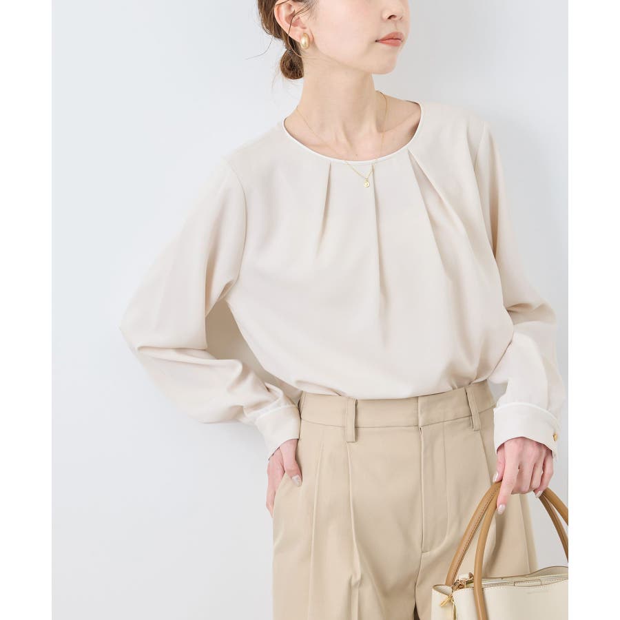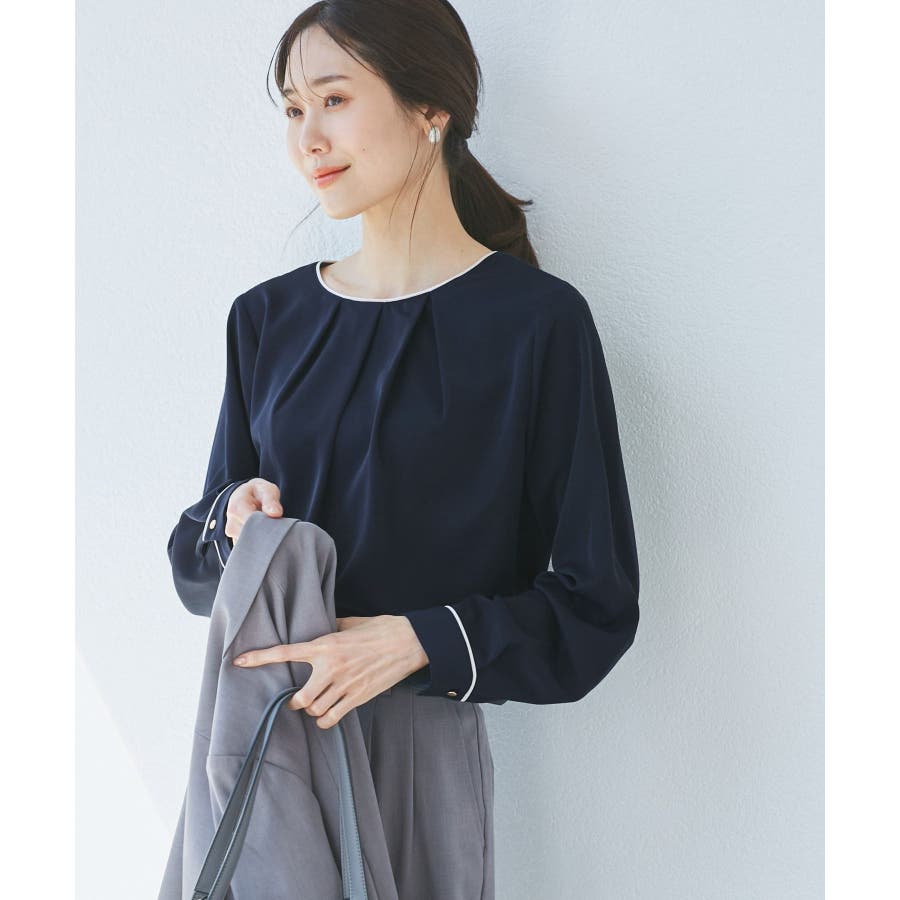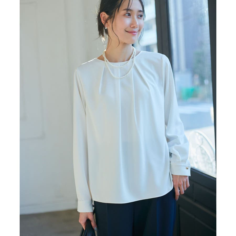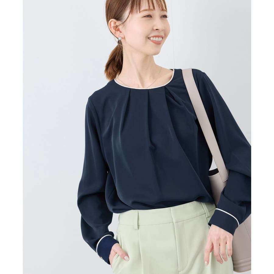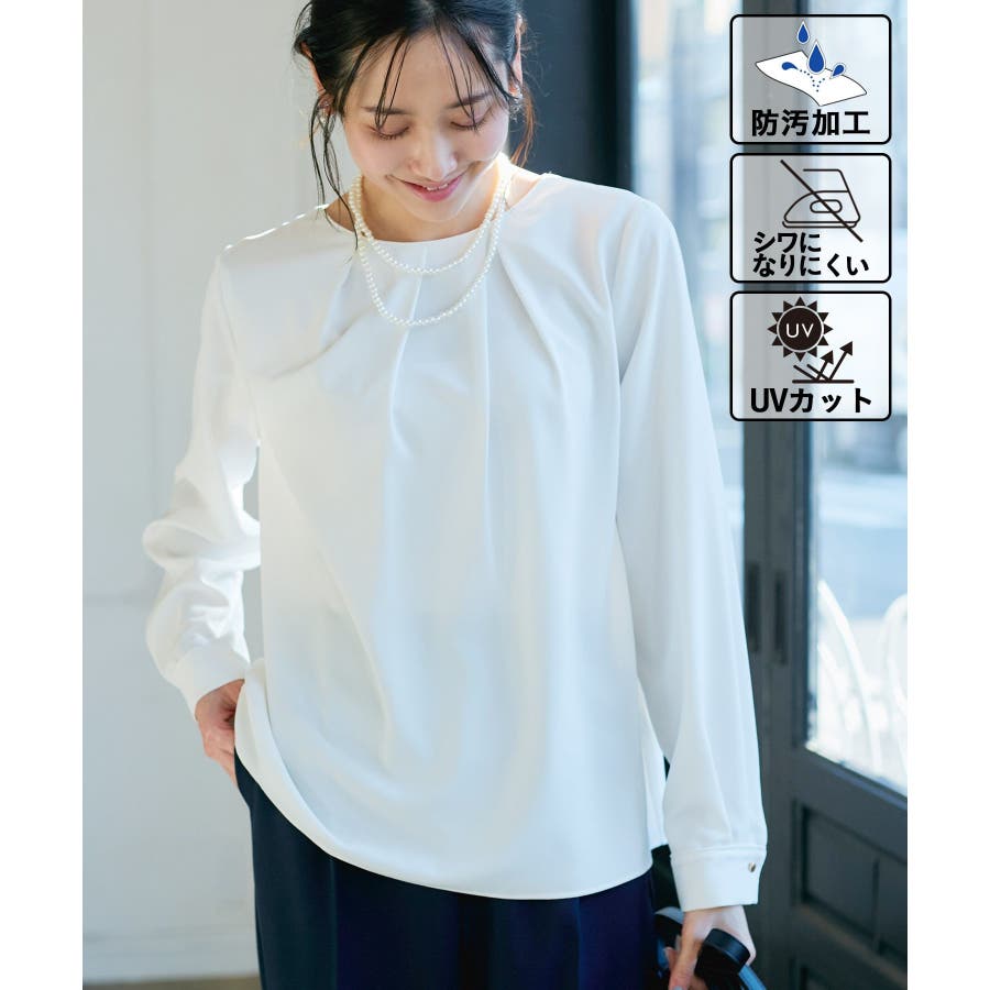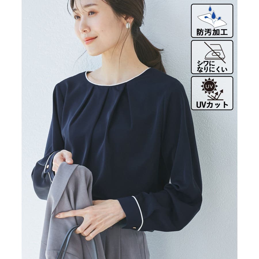 【素材感】 ・4つの機能を持った多機能ブラウス。 (1)シワになりにくい 弾力性の高い糸を使用しているため、お洗濯後のシワ回復に優れている。 (2)透けにくい 組織が二重織のため、透けにくい生地。 織り組織の変化により82.5Nt(防透け指数) →88.4Ntに改善。 (3)汚れが落ちやすい 分子レベルの撥水加工により、水溶性汚れが落ちやすい。 (4)UV対応 遮蔽率 95.9% を実現しているので、紫外線を通しにくい。 ・再生ポリエステルを使用した、サステナブルなアイテム。 【デザイン・シルエット】 ・アシンメトリーなフロントタックがポイントの長袖プルオーバーブラウス。 ・ネックラインとカフスの切り替えにパイピング入り。 ・裾はベーシックなフラットヘムで、パンツにもスカートにも好相性。 【カラー】 ・オフホワイト(15):オフホワイト×オフホワイト ・キナリ系(18):オフホワイト×チャコール ・ベージュ(27):ベージュ×オフホワイト ・ネイビー(40):ネイビー×ライトベージュ ・サックス(48):サックス×ライトベージュ ※ネイビー(40)はWEB限定カラー。 【スタイリングポイント】 ・春らしいフラワープリントスカートやレーススカートと合わせれば、卒業式や入学式、入園式、卒園式などのハレの日にぴったり。 ・シンプルなジャケットやパンツと合わせて、通勤やお仕事、オフィスカジュアルスタイルに最適。 ・きれいめなデザインなので、学校行事やセレモニーにも活躍。 ・ジーンズでカジュアルダウンすれば、オンオフどちらでも着こなせる万能アイテム。 ----------------------------- 裏地:なし 透け感:オフホワイト(15)キナリ(18)は光に当てるとややあり 伸縮性:ややあり 生地感・厚さ:普通 季節:春・秋・冬(ジャケットのインナーとして◎) ----------------------------- ※撮影時の光、お使いのモニター環境によって色の見え方が違う場合がございます。 ※分子レベル撥水加工の為、水溶性の汚れに防汚効果を発揮しますが、ファンデーションや口紅といった油分が多い汚れには対応しておりません。 ※水との親和性を良くする柔軟剤の使用は、撥水効果を弱めます。柔軟剤の使用量はお控え頂くことをお勧め致します。 ※着用や取扱いにより効果は永久ではございませんのでご注意ください。 ※防透け指数は、一般的な基準では93.0Nt以上で透け防止性があると評価しております。 ※モデル身長:165cm 着用サイズ:38