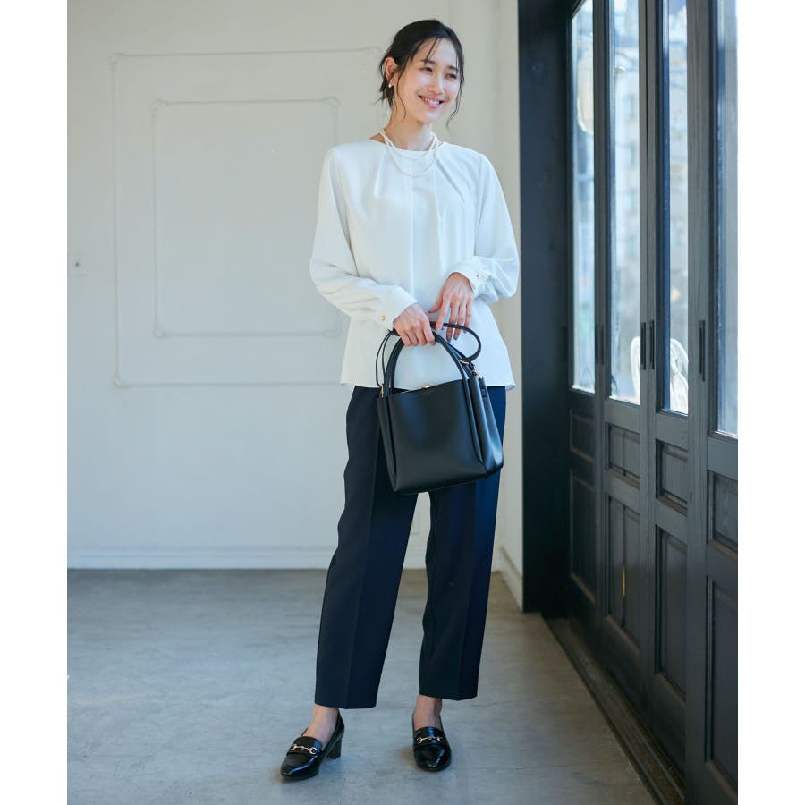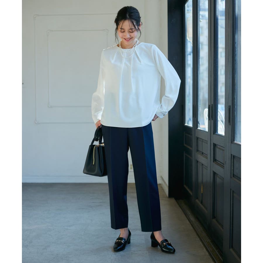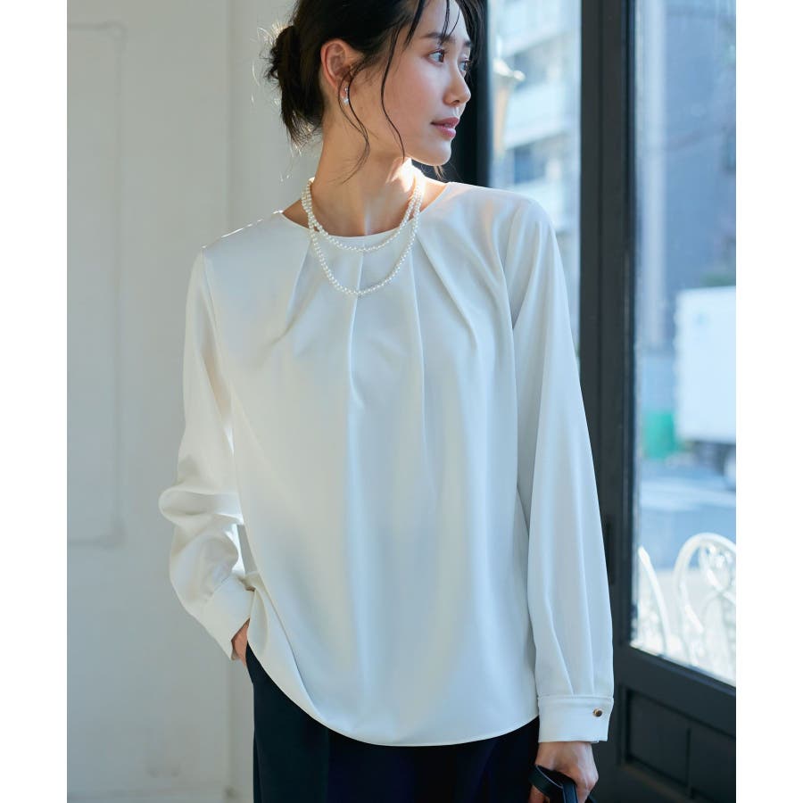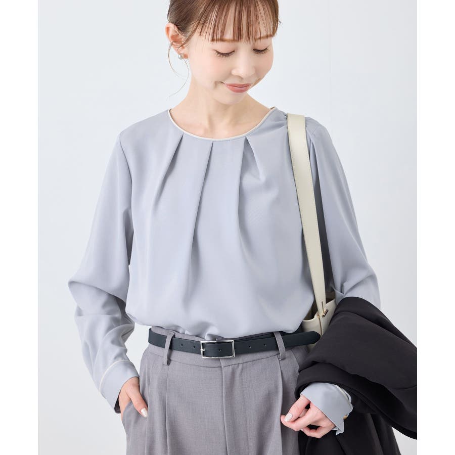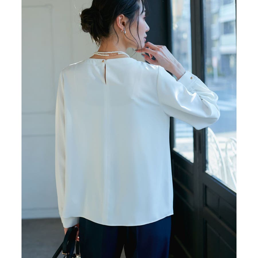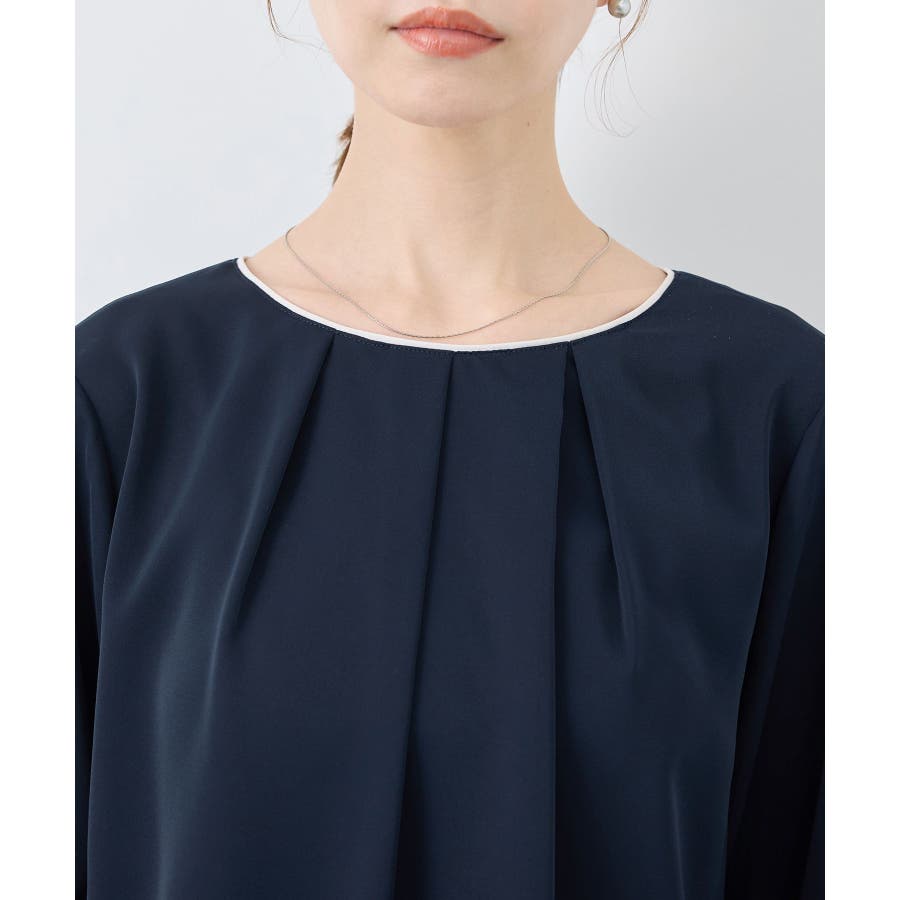 【素材感】 ・4つの機能を持った多機能ブラウス。 (1)シワになりにくい 弾力性の高い糸を使用しているため、お洗濯後のシワ回復に優れている。 (2)透けにくい 組織が二重織のため、透けにくい生地。 織り組織の変化により82.5Nt(防透け指数) →88.4Ntに改善。 (3)汚れが落ちやすい 分子レベルの撥水加工により、水溶性汚れが落ちやすい。 (4)UV対応 遮蔽率 95.9% を実現しているので、紫外線を通しにくい。 ・再生ポリエステルを使用した、サステナブルなアイテム。 【デザイン・シルエット】 ・アシンメトリーなフロントタックがポイントの長袖プルオーバーブラウス。 ・ネックラインとカフスの切り替えにパイピング入り。 ・裾はベーシックなフラットヘムで、パンツにもスカートにも好相性。 【カラー】 ・オフホワイト(15):オフホワイト×オフホワイト ・キナリ系(18):オフホワイト×チャコール ・ベージュ(27):ベージュ×オフホワイト ・ネイビー(40):ネイビー×ライトベージュ ・サックス(48):サックス×ライトベージュ ※ネイビー(40)はWEB限定カラー。 【スタイリングポイント】 ・春らしいフラワープリントスカートやレーススカートと合わせれば、卒業式や入学式、入園式、卒園式などのハレの日にぴったり。 ・シンプルなジャケットやパンツと合わせて、通勤やお仕事、オフィスカジュアルスタイルに最適。 ・きれいめなデザインなので、学校行事やセレモニーにも活躍。 ・ジーンズでカジュアルダウンすれば、オンオフどちらでも着こなせる万能アイテム。 ----------------------------- 裏地:なし 透け感:オフホワイト(15)キナリ(18)は光に当てるとややあり 伸縮性:ややあり 生地感・厚さ:普通 季節:春・秋・冬(ジャケットのインナーとして◎) ----------------------------- ※撮影時の光、お使いのモニター環境によって色の見え方が違う場合がございます。 ※分子レベル撥水加工の為、水溶性の汚れに防汚効果を発揮しますが、ファンデーションや口紅といった油分が多い汚れには対応しておりません。 ※水との親和性を良くする柔軟剤の使用は、撥水効果を弱めます。柔軟剤の使用量はお控え頂くことをお勧め致します。 ※着用や取扱いにより効果は永久ではございませんのでご注意ください。 ※防透け指数は、一般的な基準では93.0Nt以上で透け防止性があると評価しております。 ※モデル身長:165cm 着用サイズ:38