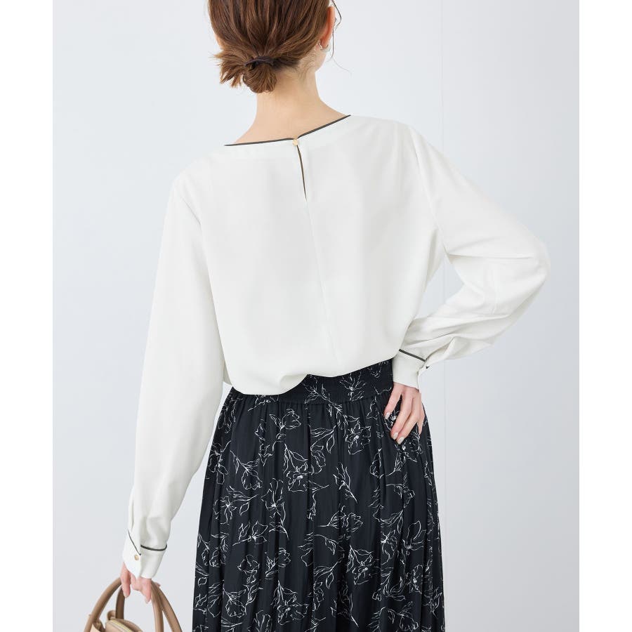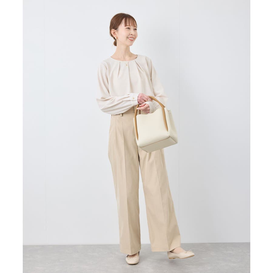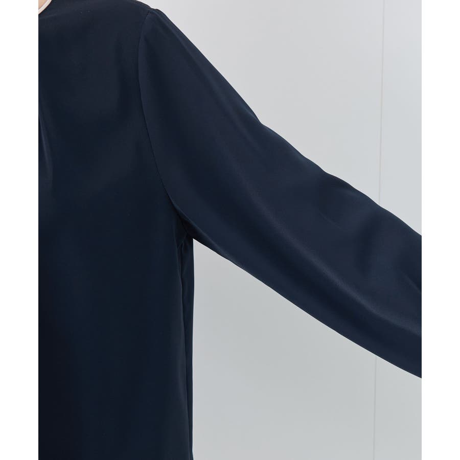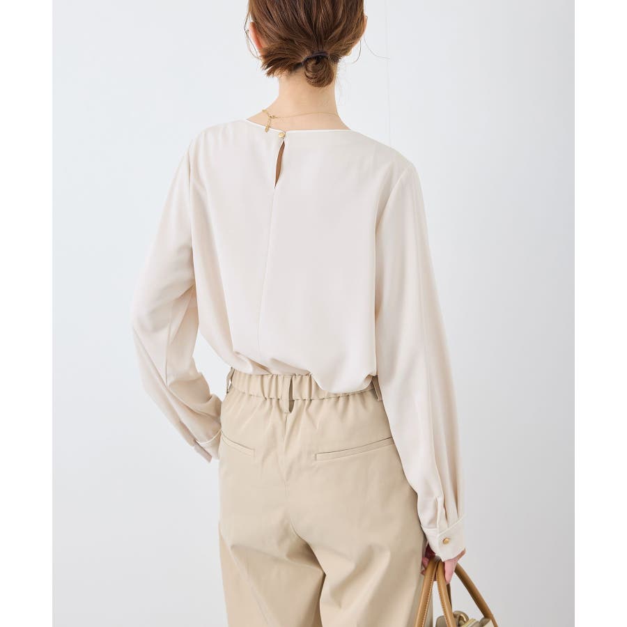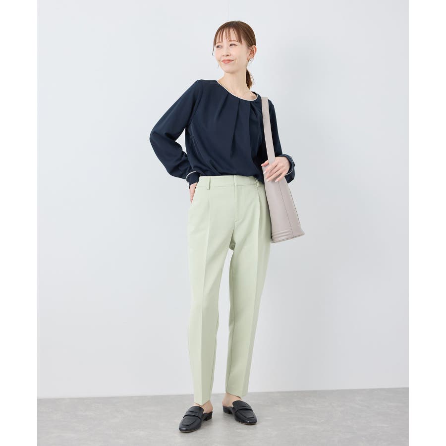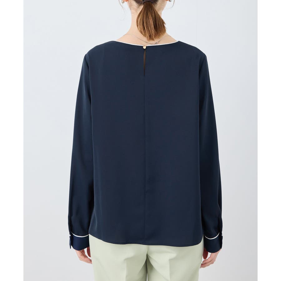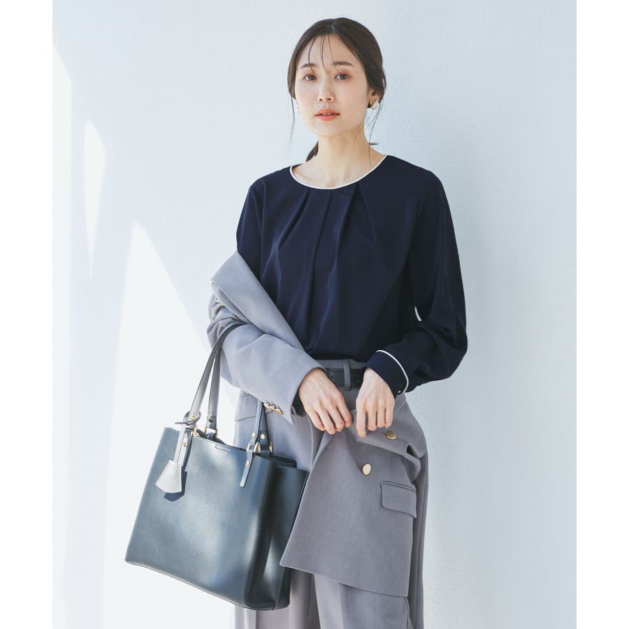 【素材感】 ・4つの機能を持った多機能ブラウス。 (1)シワになりにくい 弾力性の高い糸を使用しているため、お洗濯後のシワ回復に優れている。 (2)透けにくい 組織が二重織のため、透けにくい生地。 織り組織の変化により82.5Nt(防透け指数) →88.4Ntに改善。 (3)汚れが落ちやすい 分子レベルの撥水加工により、水溶性汚れが落ちやすい。 (4)UV対応 遮蔽率 95.9% を実現しているので、紫外線を通しにくい。 ・再生ポリエステルを使用した、サステナブルなアイテム。 【デザイン・シルエット】 ・アシンメトリーなフロントタックがポイントの長袖プルオーバーブラウス。 ・ネックラインとカフスの切り替えにパイピング入り。 ・裾はベーシックなフラットヘムで、パンツにもスカートにも好相性。 【カラー】 ・オフホワイト(15):オフホワイト×オフホワイト ・キナリ系(18):オフホワイト×チャコール ・ベージュ(27):ベージュ×オフホワイト ・ネイビー(40):ネイビー×ライトベージュ ・サックス(48):サックス×ライトベージュ ※ネイビー(40)はWEB限定カラー。 【スタイリングポイント】 ・春らしいフラワープリントスカートやレーススカートと合わせれば、卒業式や入学式、入園式、卒園式などのハレの日にぴったり。 ・シンプルなジャケットやパンツと合わせて、通勤やお仕事、オフィスカジュアルスタイルに最適。 ・きれいめなデザインなので、学校行事やセレモニーにも活躍。 ・ジーンズでカジュアルダウンすれば、オンオフどちらでも着こなせる万能アイテム。 ----------------------------- 裏地:なし 透け感:オフホワイト(15)キナリ(18)は光に当てるとややあり 伸縮性:ややあり 生地感・厚さ:普通 季節:春・秋・冬(ジャケットのインナーとして◎) ----------------------------- ※撮影時の光、お使いのモニター環境によって色の見え方が違う場合がございます。 ※分子レベル撥水加工の為、水溶性の汚れに防汚効果を発揮しますが、ファンデーションや口紅といった油分が多い汚れには対応しておりません。 ※水との親和性を良くする柔軟剤の使用は、撥水効果を弱めます。柔軟剤の使用量はお控え頂くことをお勧め致します。 ※着用や取扱いにより効果は永久ではございませんのでご注意ください。 ※防透け指数は、一般的な基準では93.0Nt以上で透け防止性があると評価しております。 ※モデル身長:165cm 着用サイズ:38