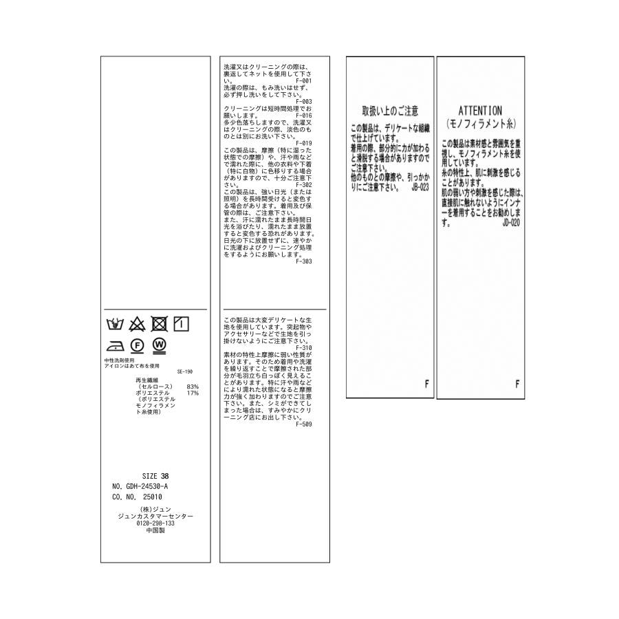 | 素材 | ブラック(01):再生繊維(セルロース) 83% ポリエステル 17% (ポリエステルモノフィラメント糸使用)|キナリ(16):再生繊維(セルロース) 83% ポリエステル 17% (ポリエステルモノフィラメント糸使用)|ライトグリーン(33):再生繊維(セルロース) 83% ポリエステル 17% (ポリエステルモノフィラメント糸使用) |