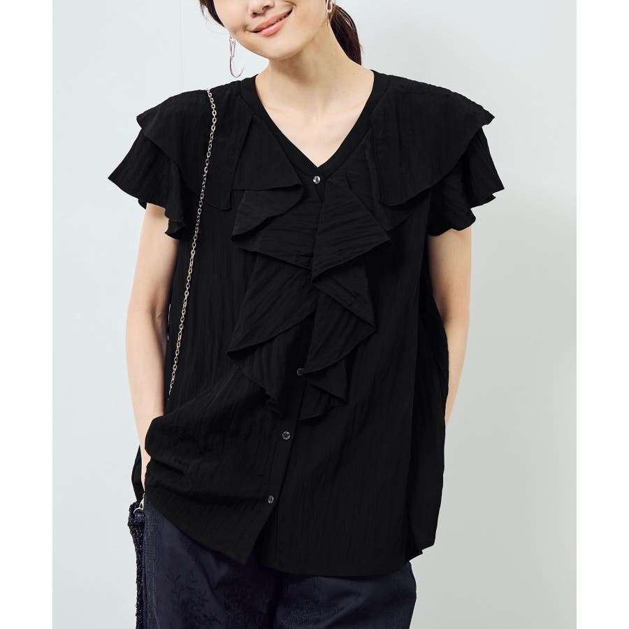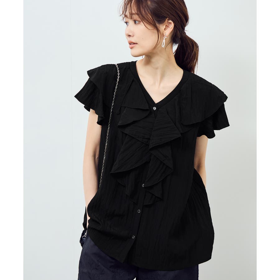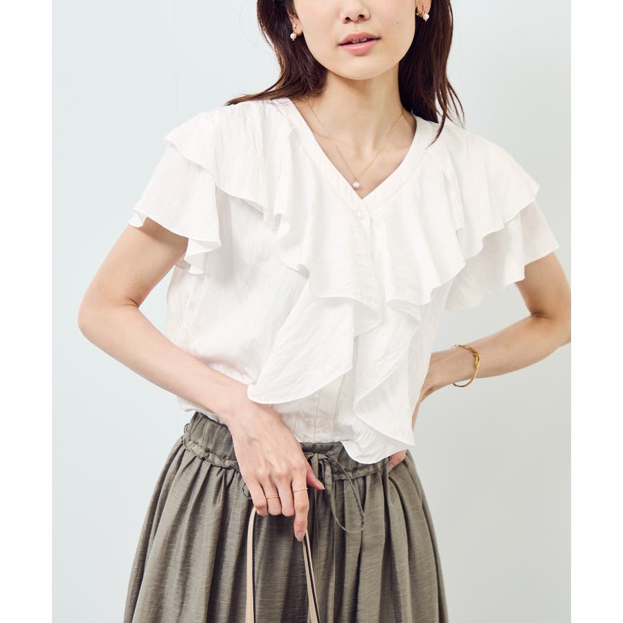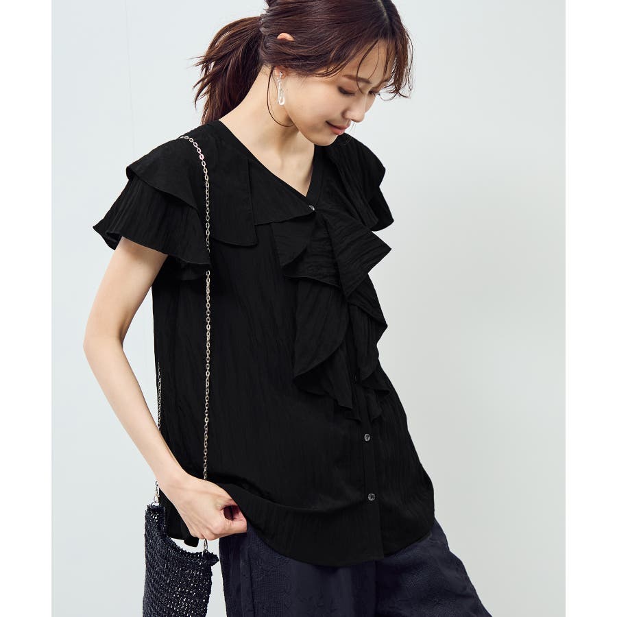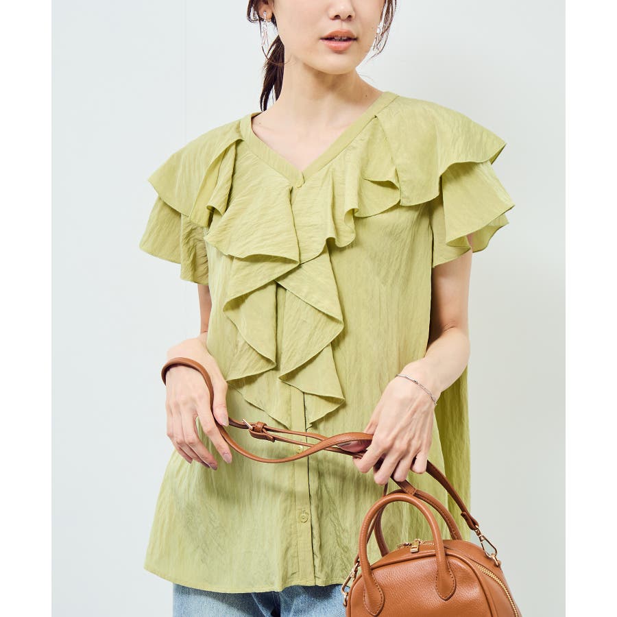 ・ラッフルカラーとフリルスリーブを重ねた前開きブラウス。