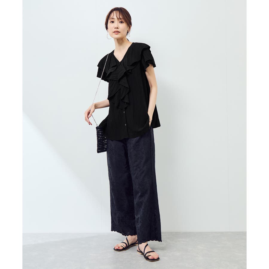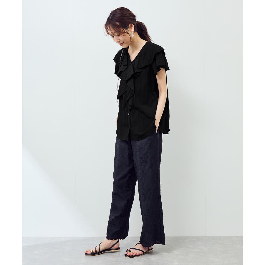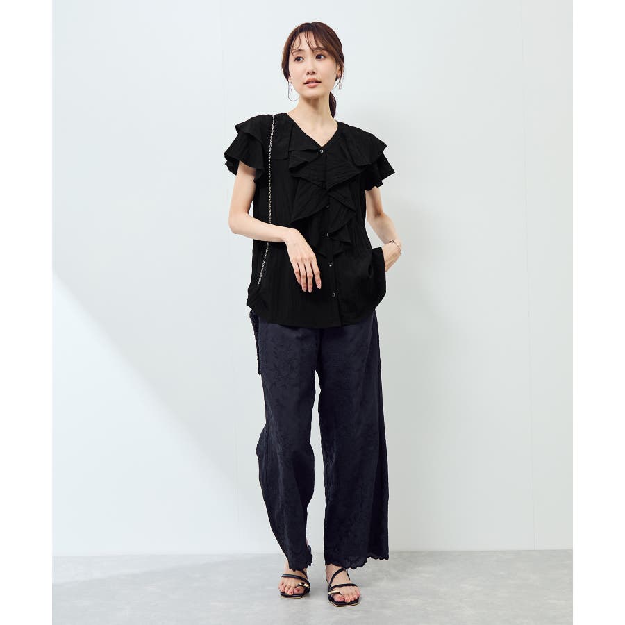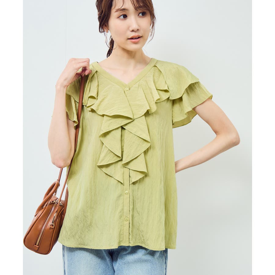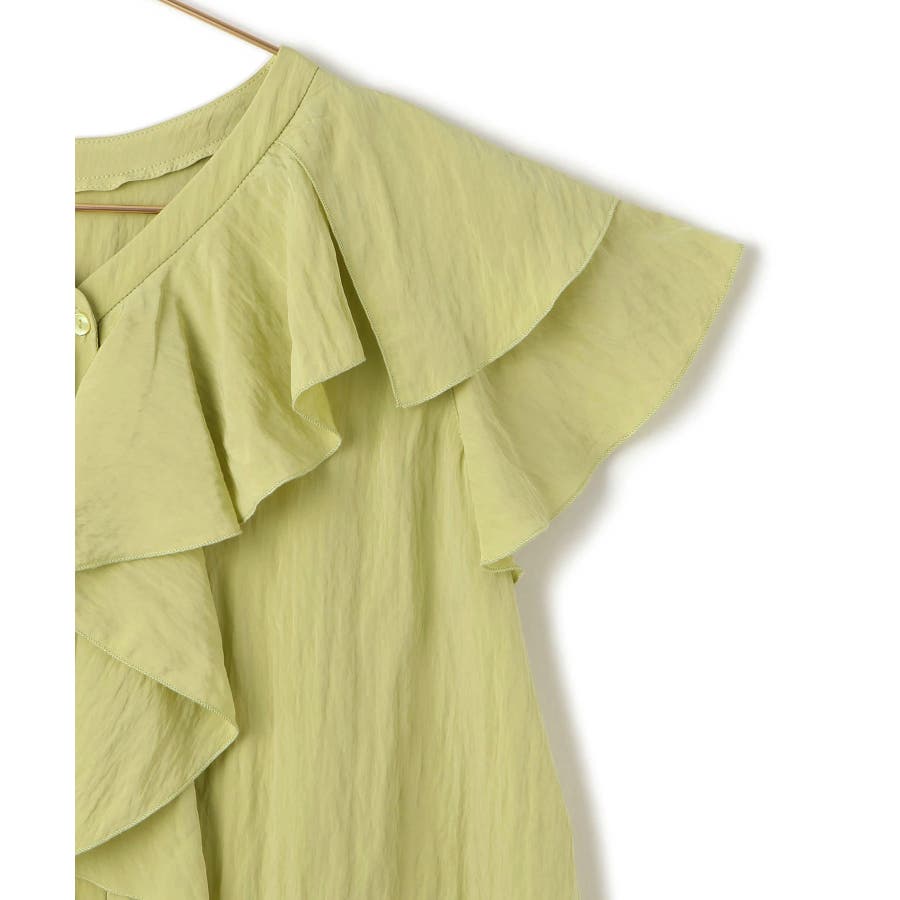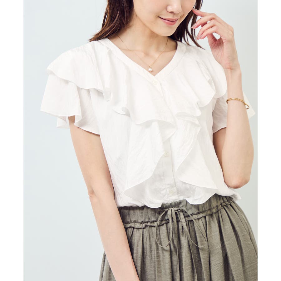 ・ラッフルカラーとフリルスリーブを重ねた前開きブラウス。