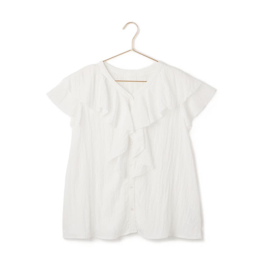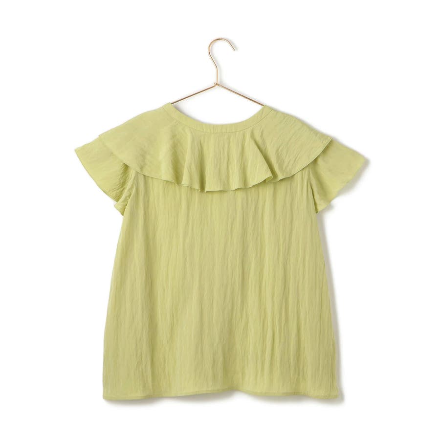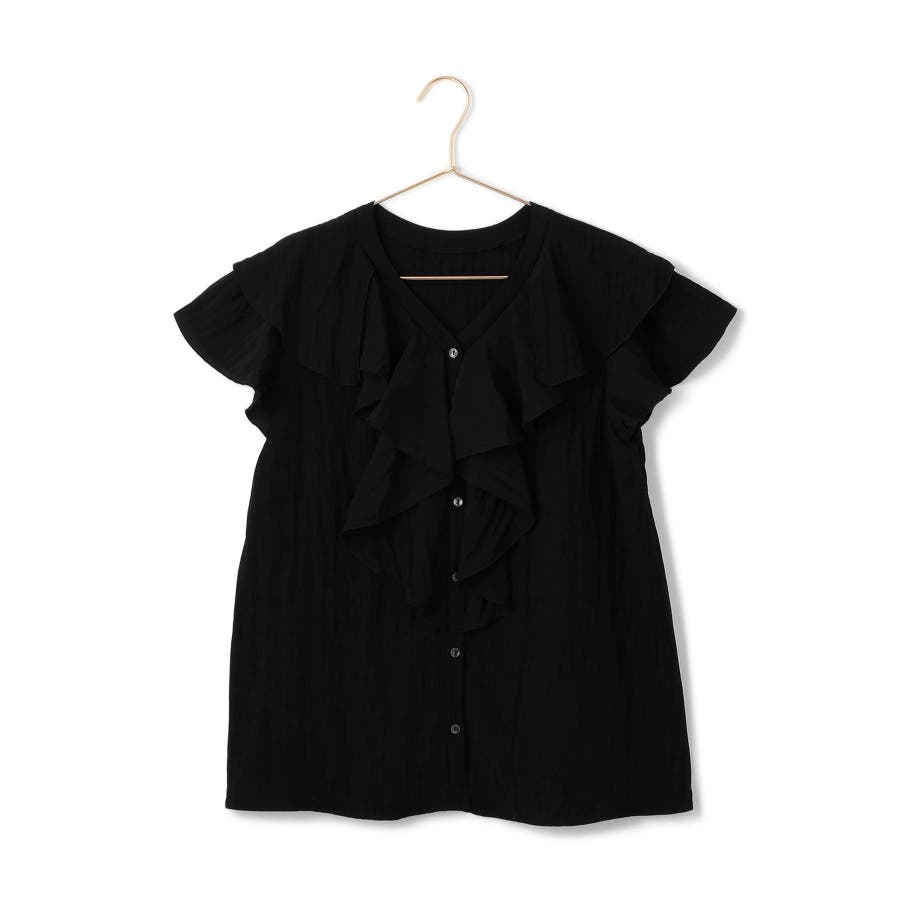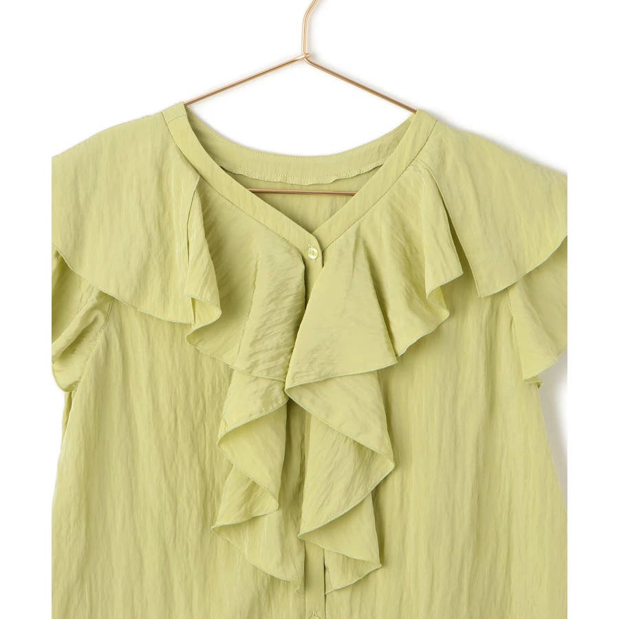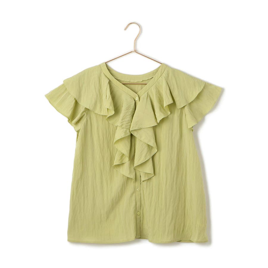 ・ラッフルカラーとフリルスリーブを重ねた前開きブラウス。