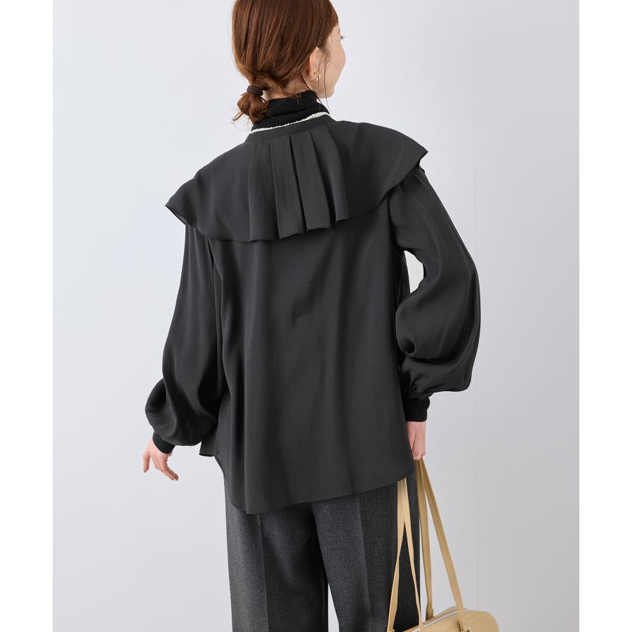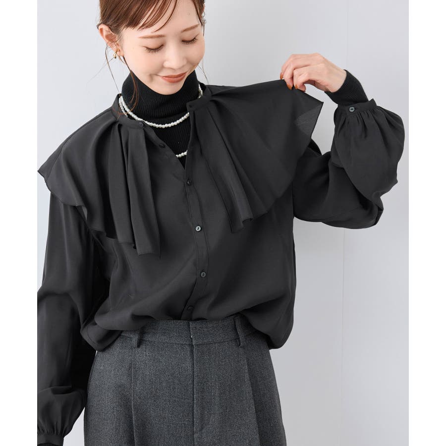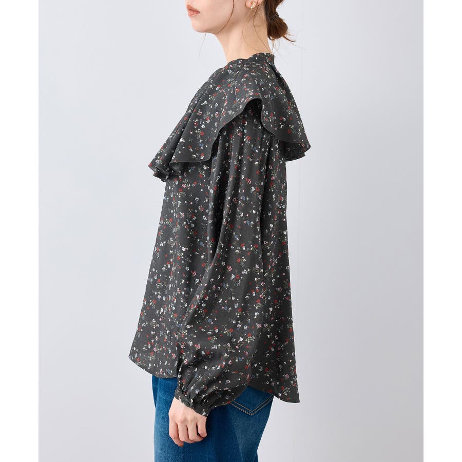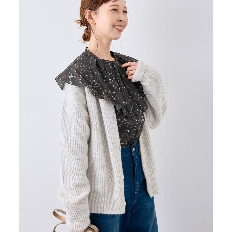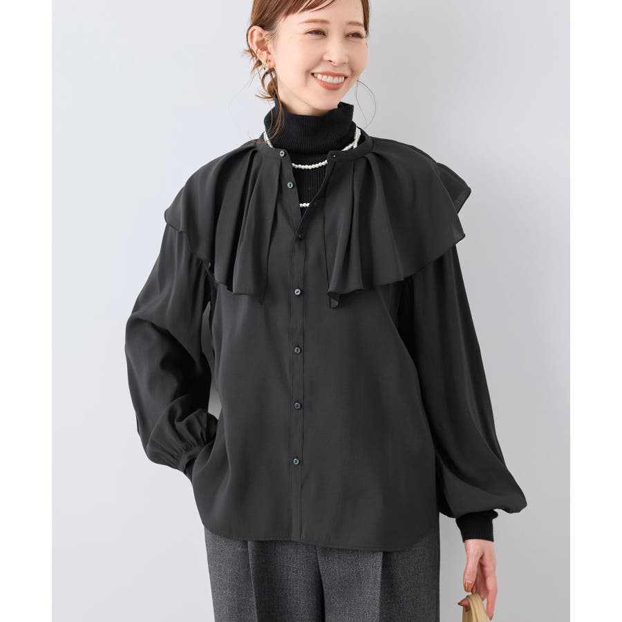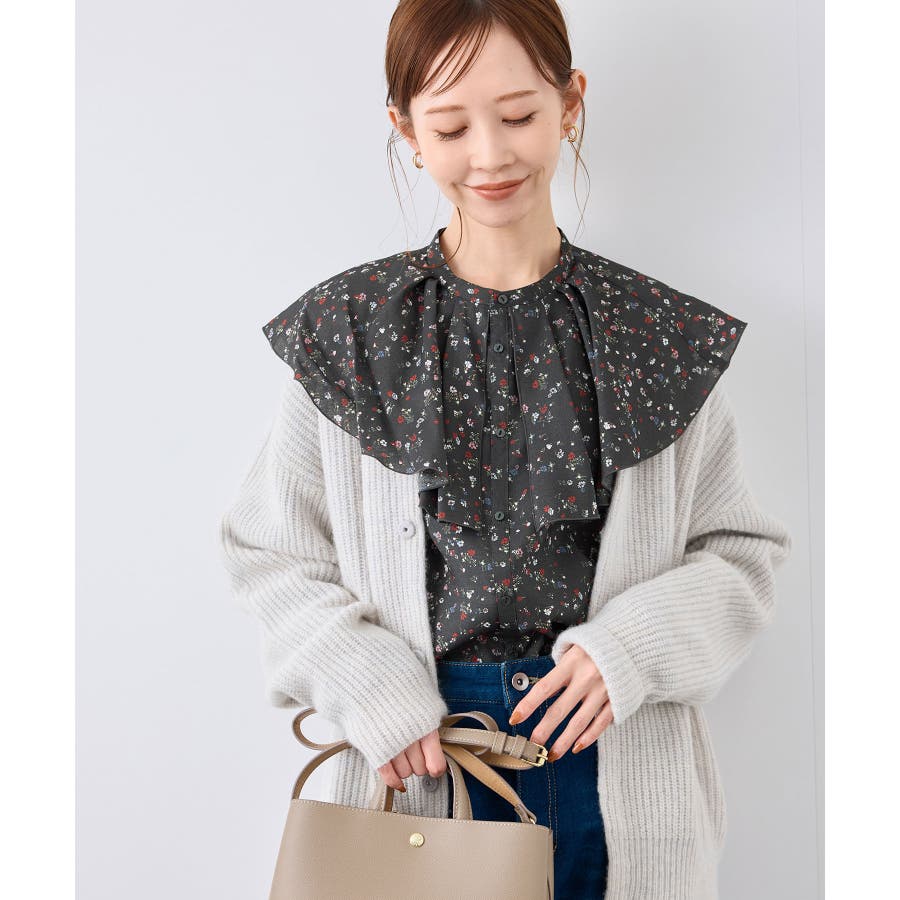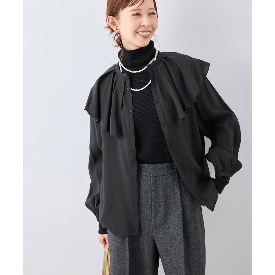 【素材感】 ・程よい光沢感とこなれ感が出るのが特徴の、モノフィラを含む素材を使用。 ・アームホール・袖下にふくらみのあるウーリー糸といわれる糸でロックしたことでチクチク感を緩和。 【デザイン・シルエット】 ・肩にしっかりと掛かる、ケープのような大きいフリルカラーが特徴。 ・ボリューミーな袖が旬のデザイン。 ・ボトムアウトがしやすい、前後差ありのラウンドヘム。 【カラー】 ・カラーによって柄が異なります。 ブラック(01)キナリ(16):無地 ブラック系(02):花柄 【スタイリングポイント】 ・サロペットに合わせてトレンドスタイルが完成。 ・冬はカーディガンのインナーにしても可愛らしい着こなしに。 ・スカートはすっきりとしたシルエットを選ぶのがおすすめ。 ----------------------------- 裏地:なし 透け感:キナリ(16)はややあり 伸縮性:なし 生地感・厚さ:普通 季節:春・秋・冬(ニットやスウェットのインナーとしても◎) ----------------------------- ※撮影時の光、お使いのモニター環境によって色の見え方が違う場合がございます。 ※モデル身長:165cm 着用サイズ:38