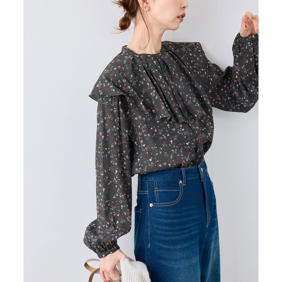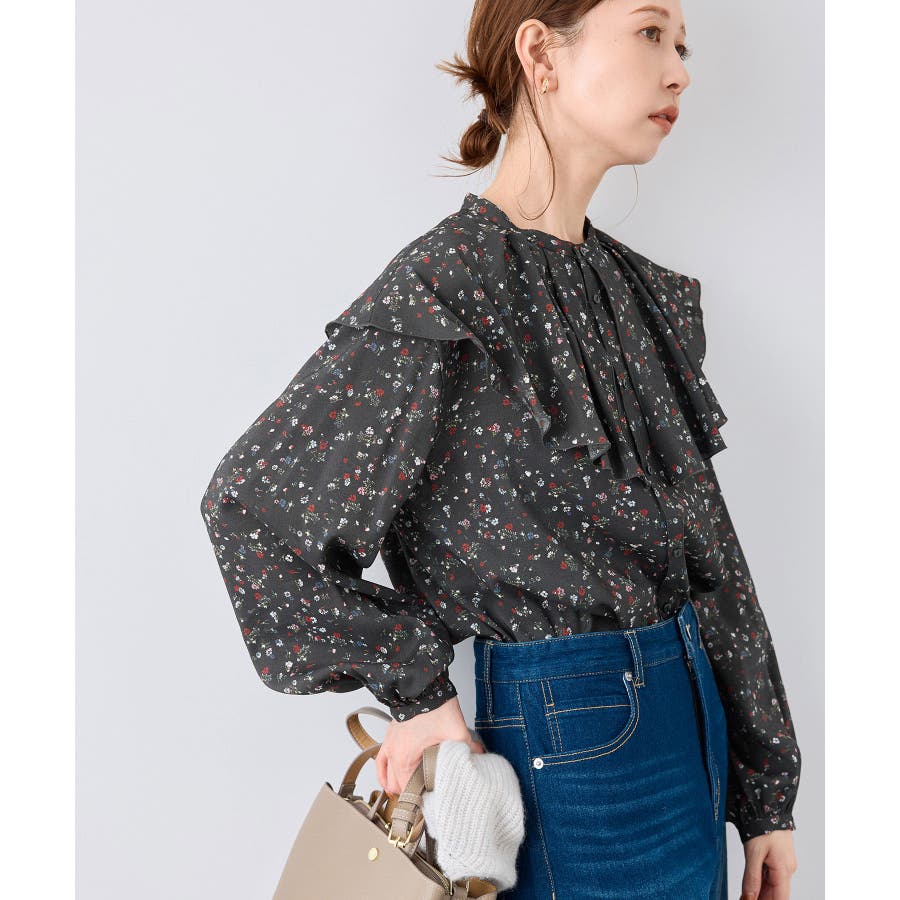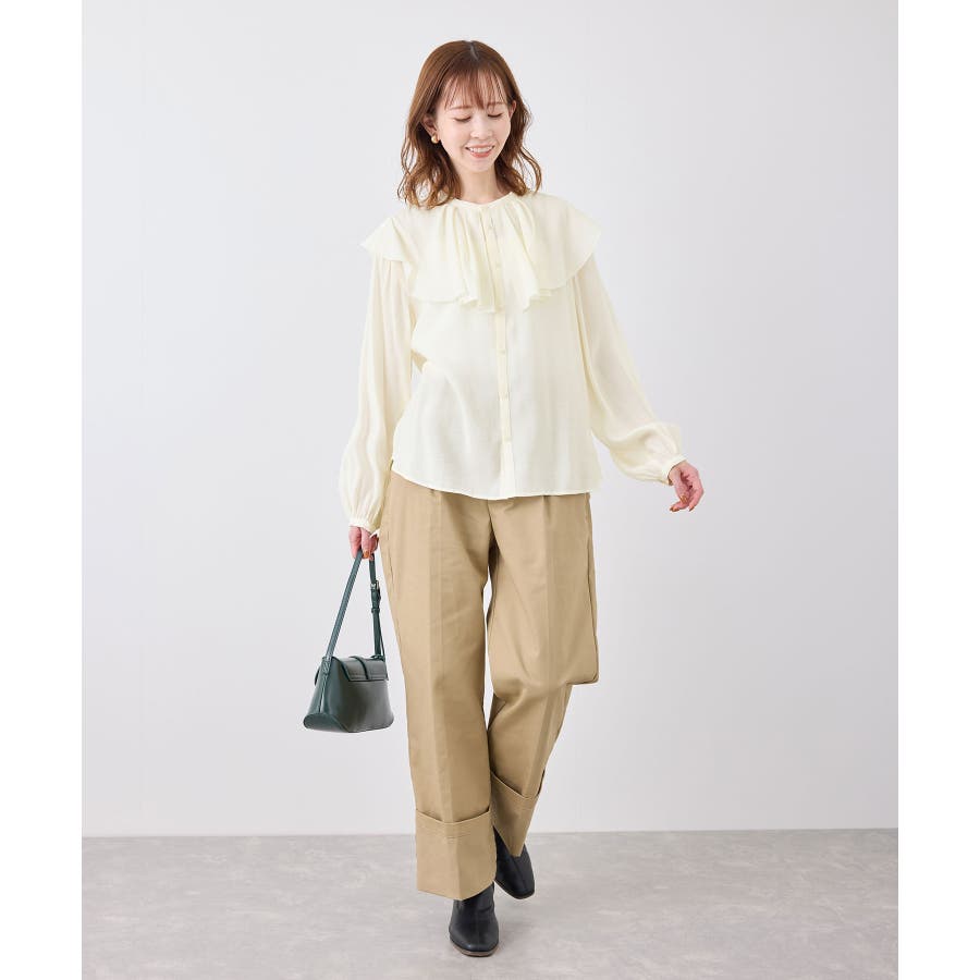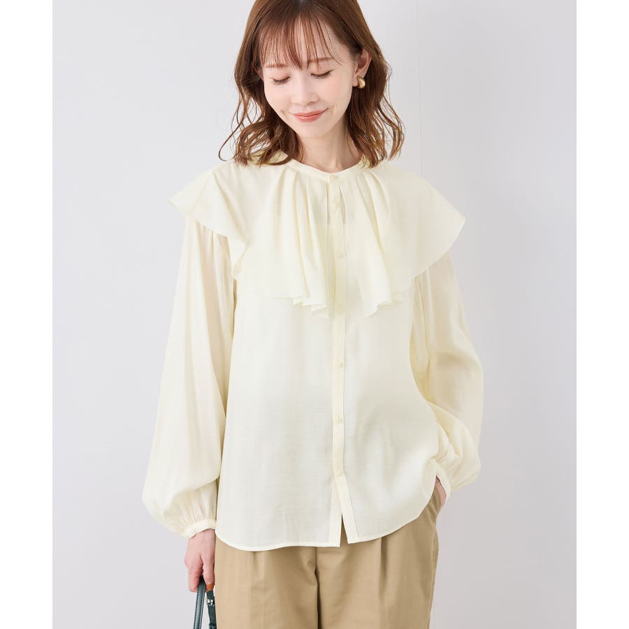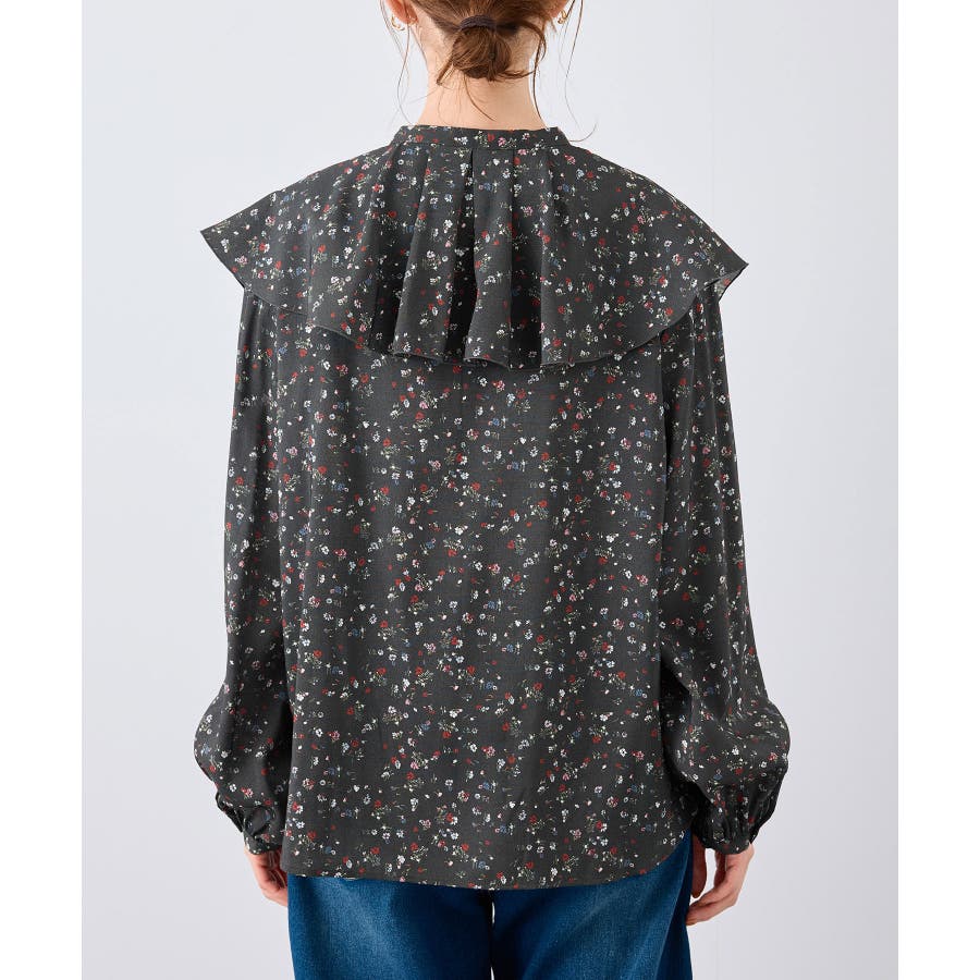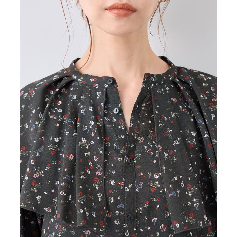 【素材感】 ・程よい光沢感とこなれ感が出るのが特徴の、モノフィラを含む素材を使用。 ・アームホール・袖下にふくらみのあるウーリー糸といわれる糸でロックしたことでチクチク感を緩和。 【デザイン・シルエット】 ・肩にしっかりと掛かる、ケープのような大きいフリルカラーが特徴。 ・ボリューミーな袖が旬のデザイン。 ・ボトムアウトがしやすい、前後差ありのラウンドヘム。 【カラー】 ・カラーによって柄が異なります。 ブラック(01)キナリ(16):無地 ブラック系(02):花柄 【スタイリングポイント】 ・サロペットに合わせてトレンドスタイルが完成。 ・冬はカーディガンのインナーにしても可愛らしい着こなしに。 ・スカートはすっきりとしたシルエットを選ぶのがおすすめ。 ----------------------------- 裏地:なし 透け感:キナリ(16)はややあり 伸縮性:なし 生地感・厚さ:普通 季節:春・秋・冬(ニットやスウェットのインナーとしても◎) ----------------------------- ※撮影時の光、お使いのモニター環境によって色の見え方が違う場合がございます。 ※モデル身長:165cm 着用サイズ:38