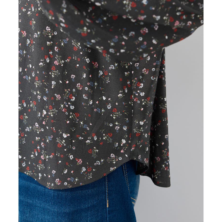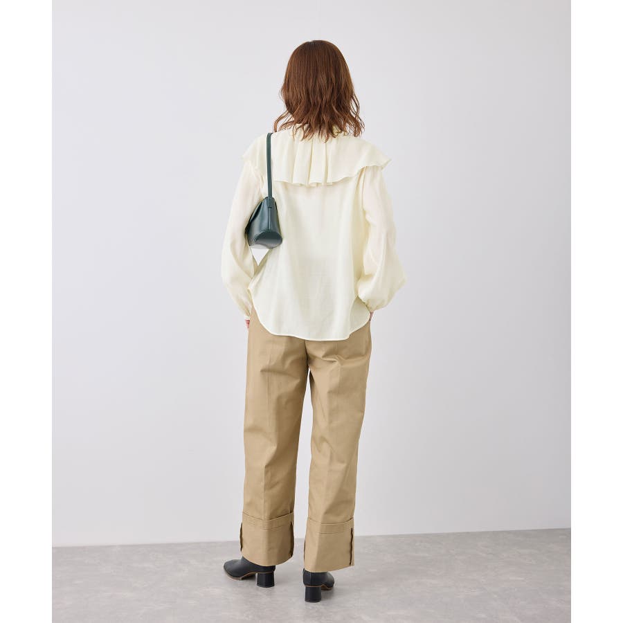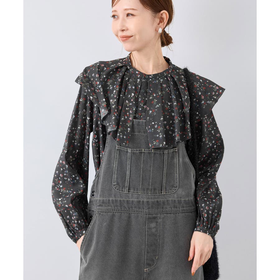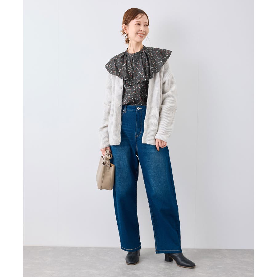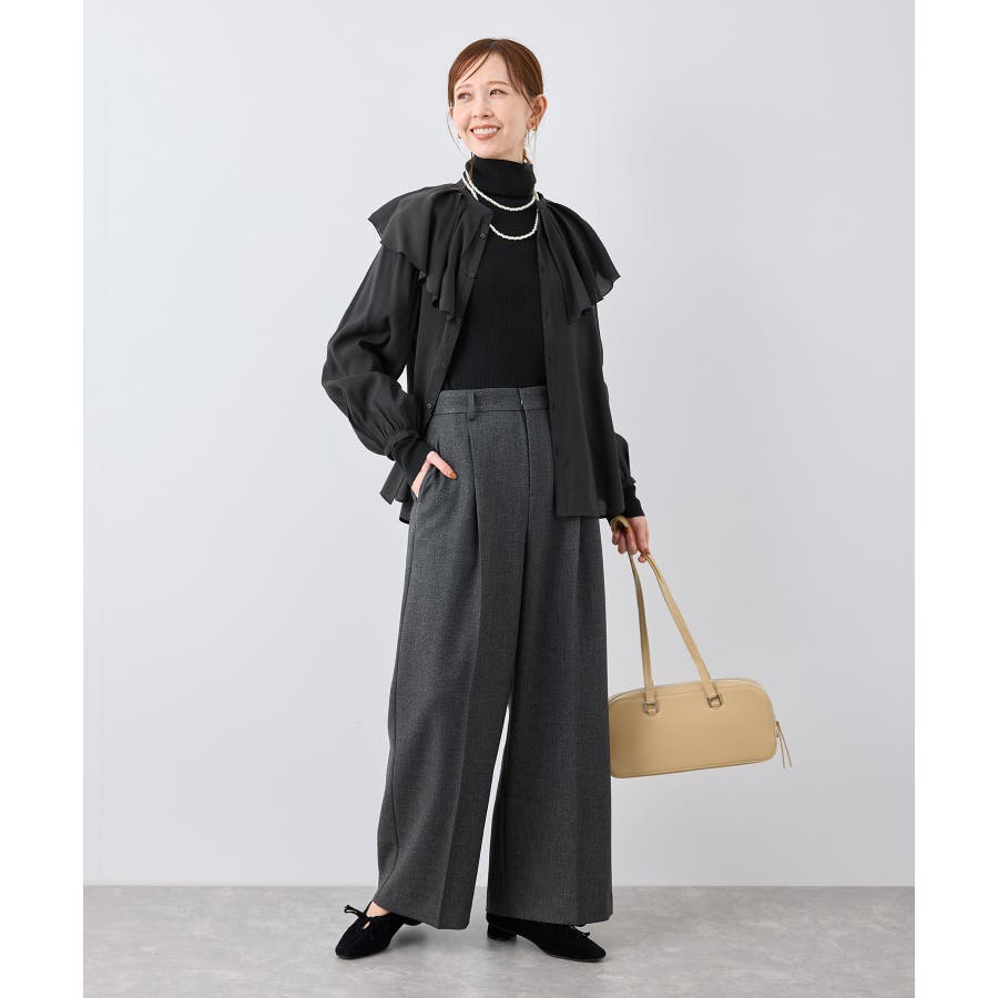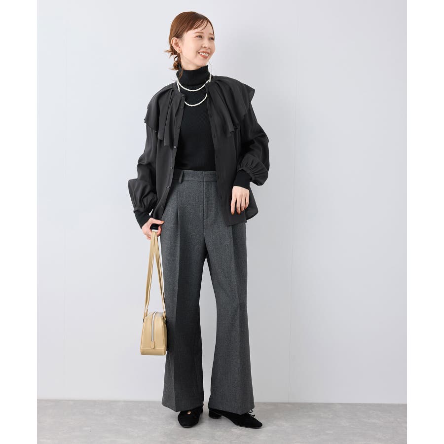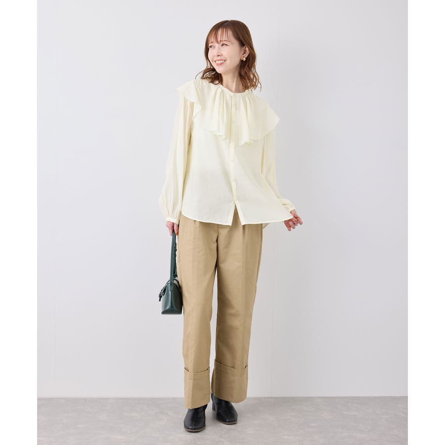 【素材感】 ・程よい光沢感とこなれ感が出るのが特徴の、モノフィラを含む素材を使用。 ・アームホール・袖下にふくらみのあるウーリー糸といわれる糸でロックしたことでチクチク感を緩和。 【デザイン・シルエット】 ・肩にしっかりと掛かる、ケープのような大きいフリルカラーが特徴。 ・ボリューミーな袖が旬のデザイン。 ・ボトムアウトがしやすい、前後差ありのラウンドヘム。 【カラー】 ・カラーによって柄が異なります。 ブラック(01)キナリ(16):無地 ブラック系(02):花柄 【スタイリングポイント】 ・サロペットに合わせてトレンドスタイルが完成。 ・冬はカーディガンのインナーにしても可愛らしい着こなしに。 ・スカートはすっきりとしたシルエットを選ぶのがおすすめ。 ----------------------------- 裏地:なし 透け感:キナリ(16)はややあり 伸縮性:なし 生地感・厚さ:普通 季節:春・秋・冬(ニットやスウェットのインナーとしても◎) ----------------------------- ※撮影時の光、お使いのモニター環境によって色の見え方が違う場合がございます。 ※モデル身長:165cm 着用サイズ:38