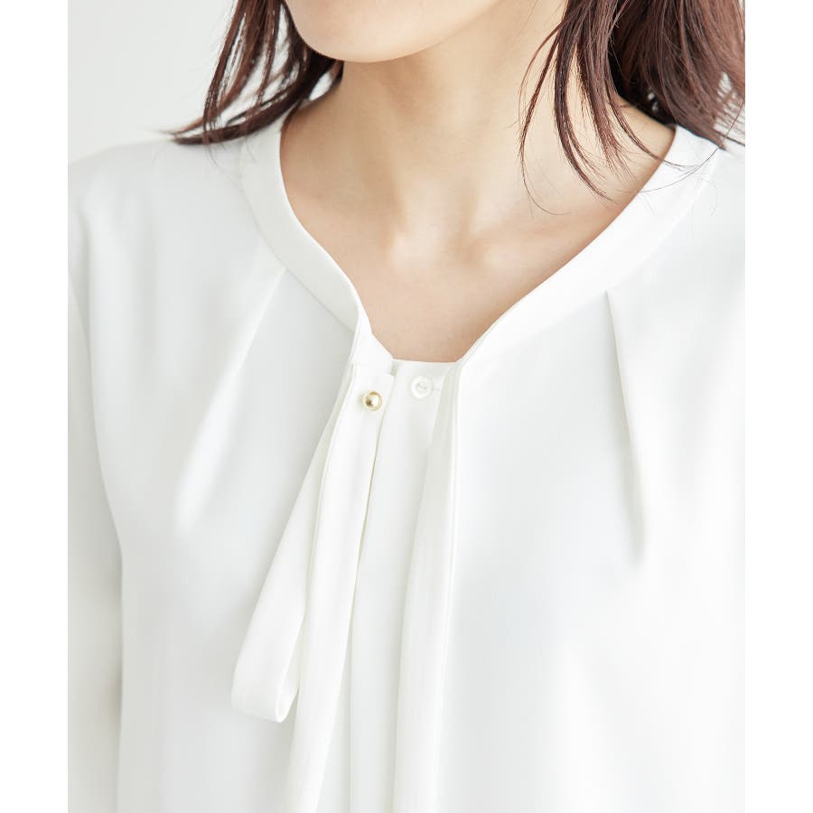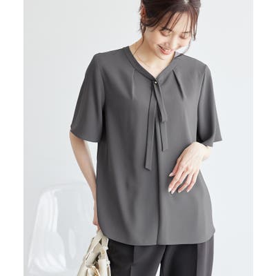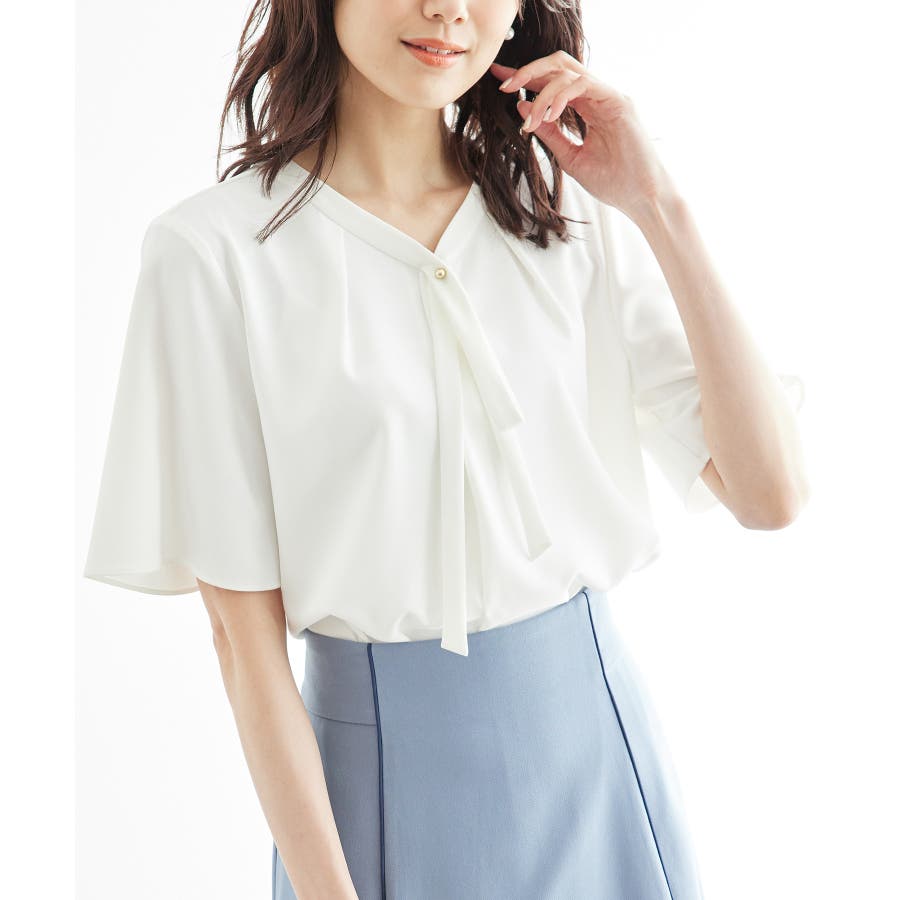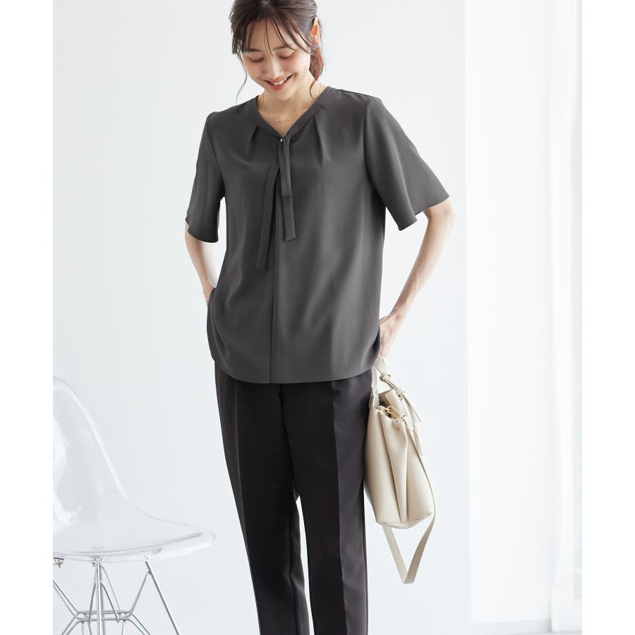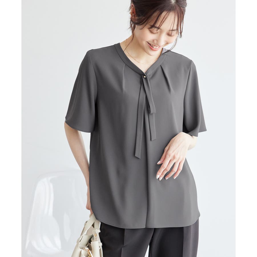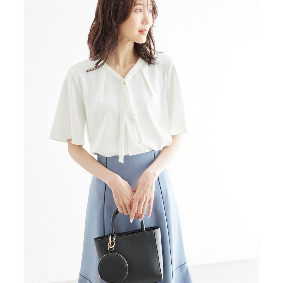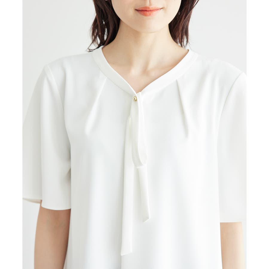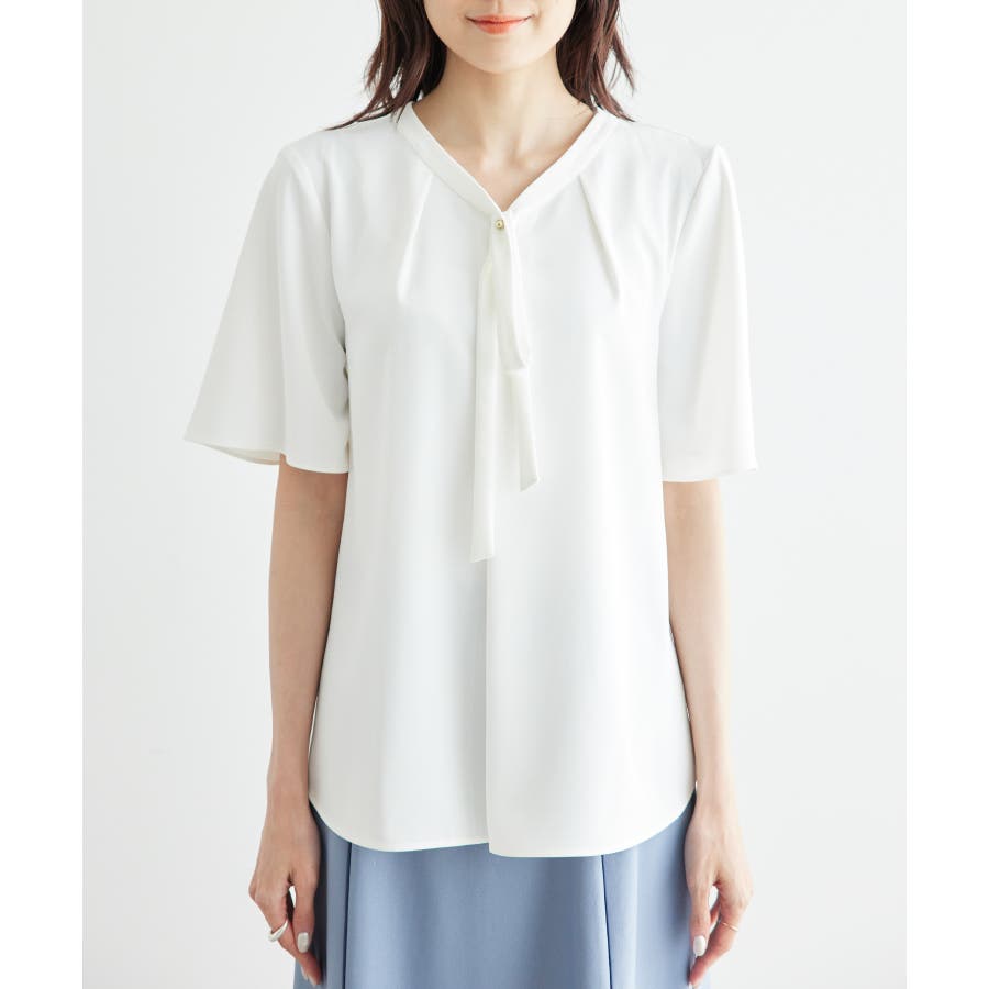 2サイズ展開/メタルボタンリボンタイハーフスリーブブラウス