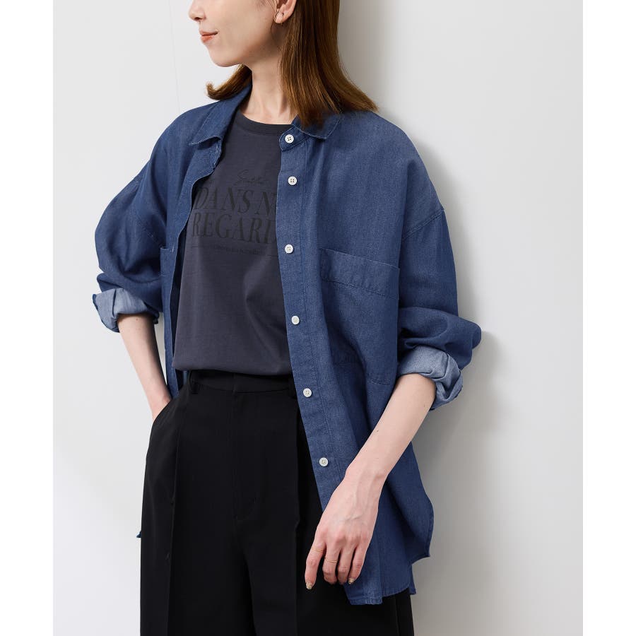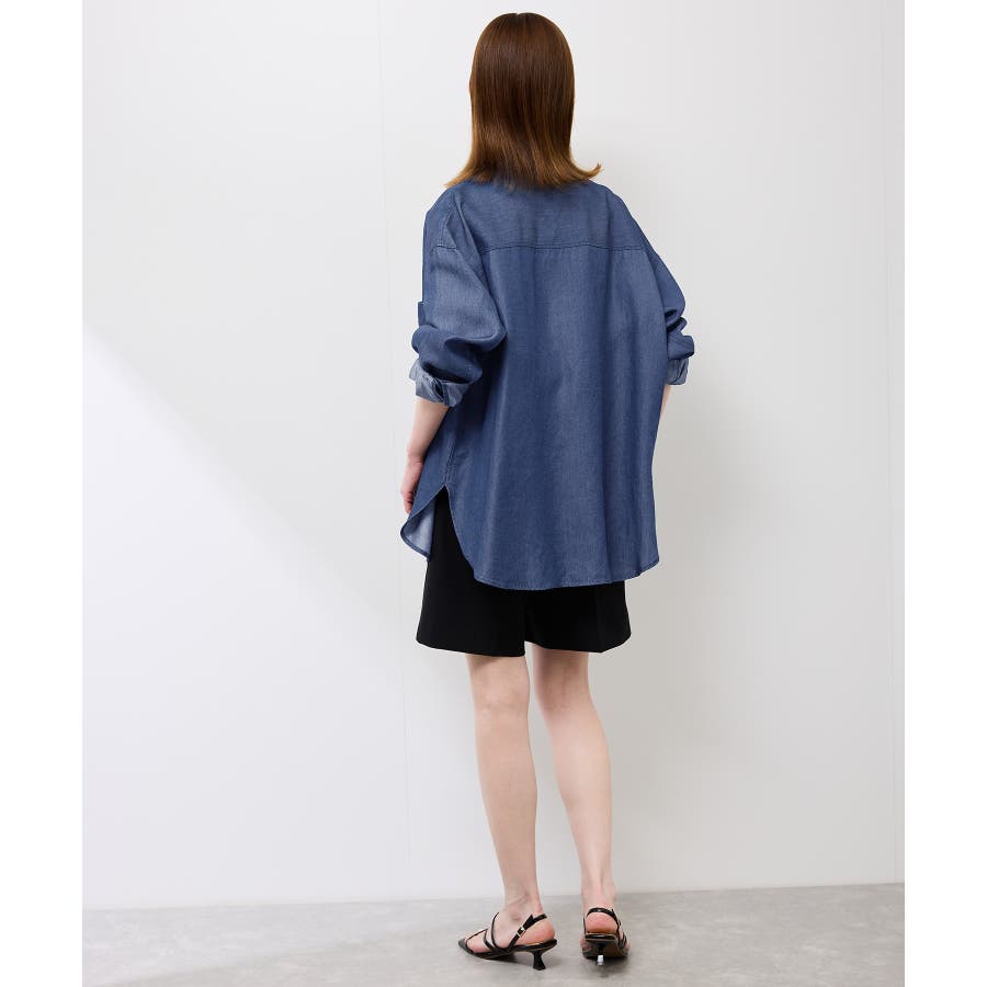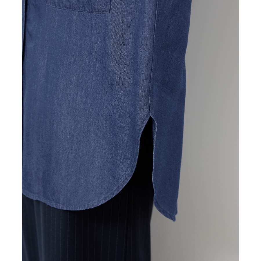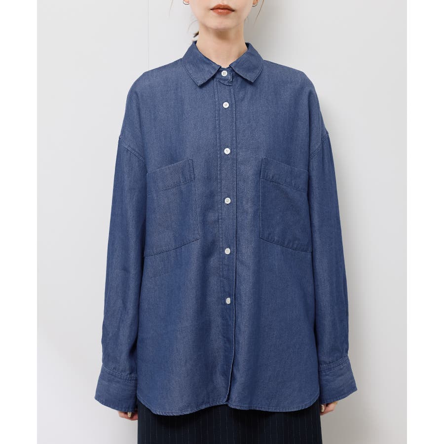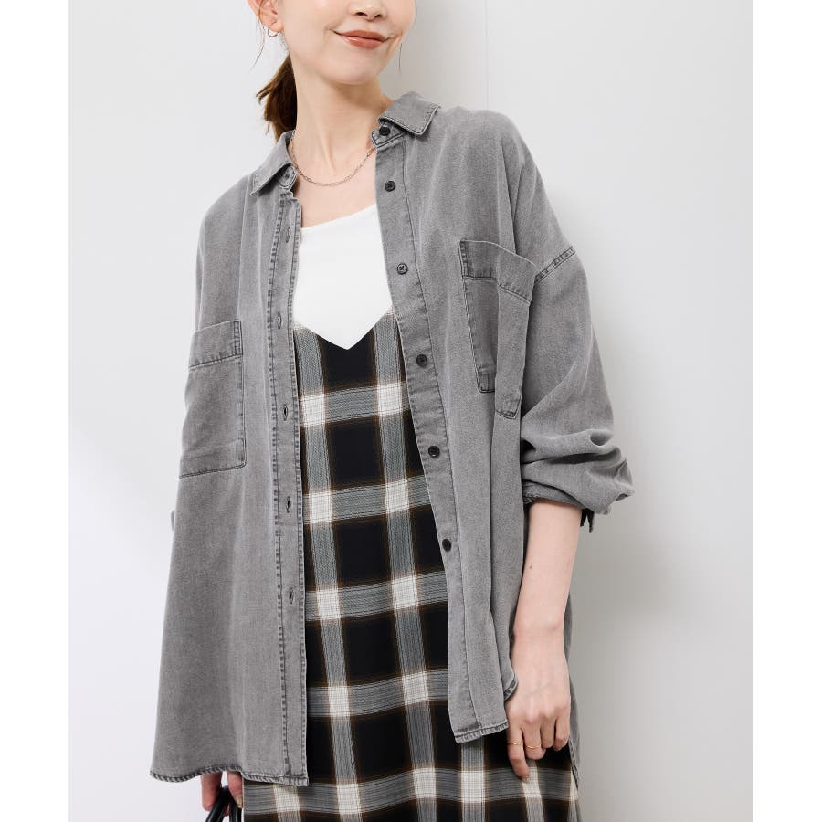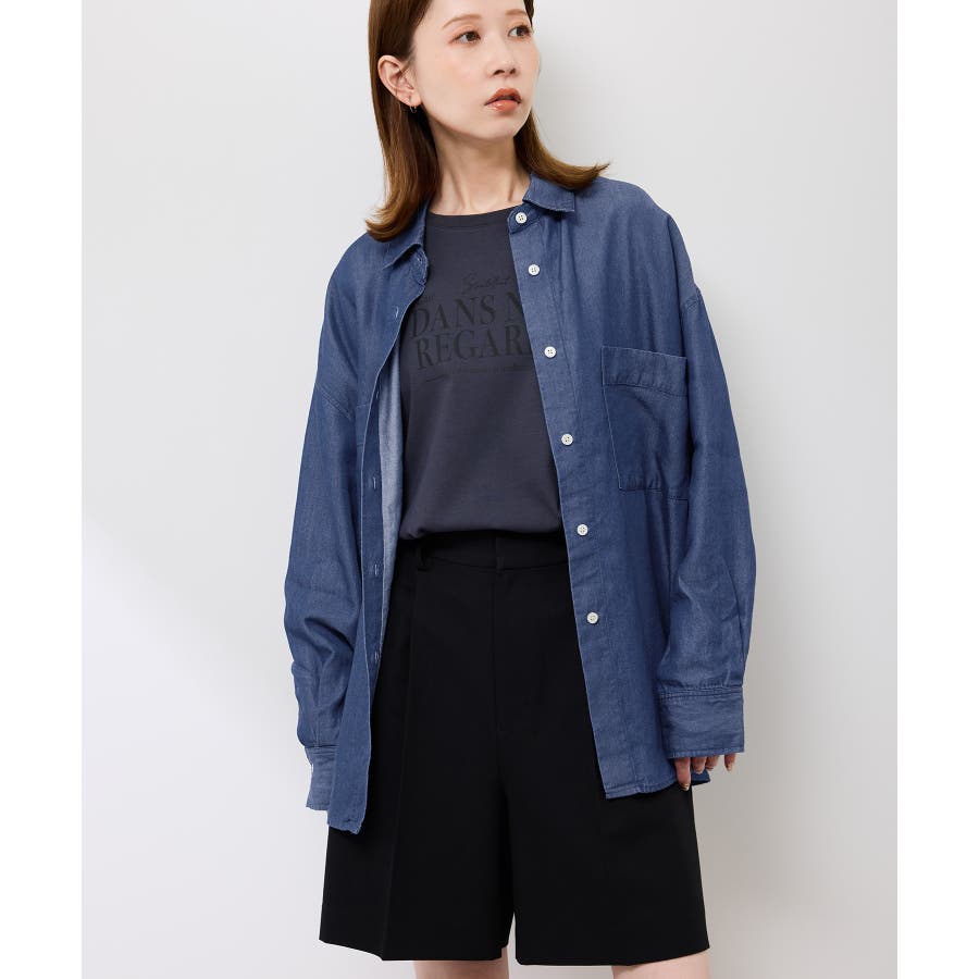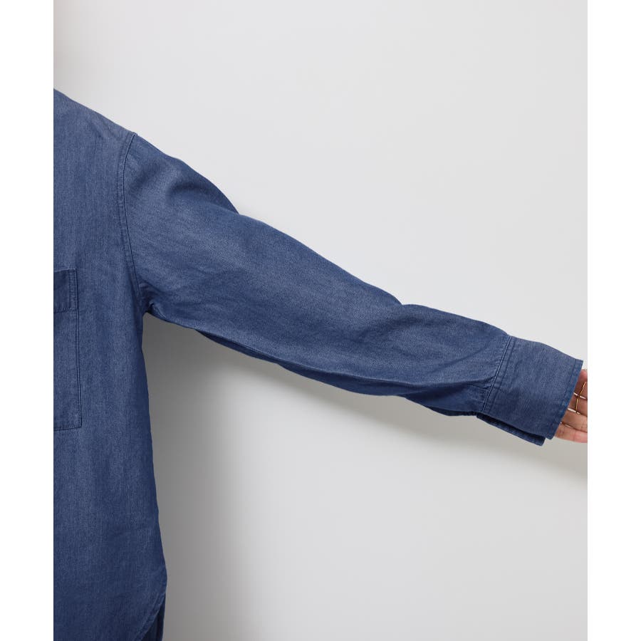 ・羽織やすい着丈のシャンブレー素材のシャツ。