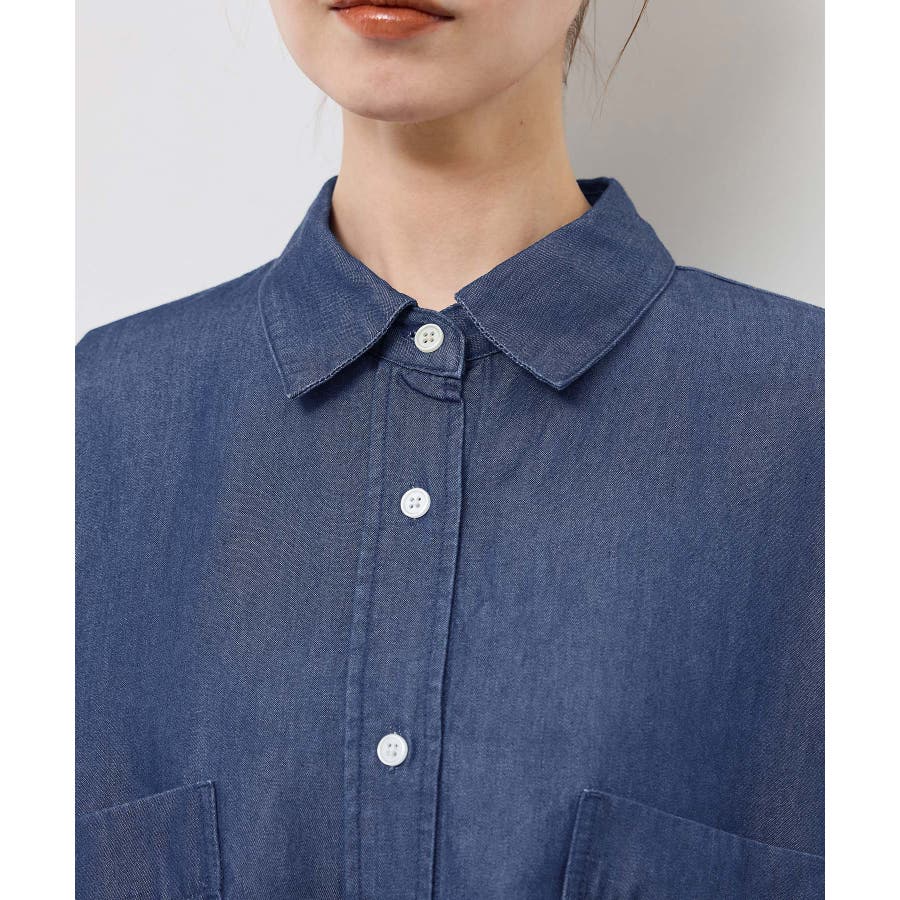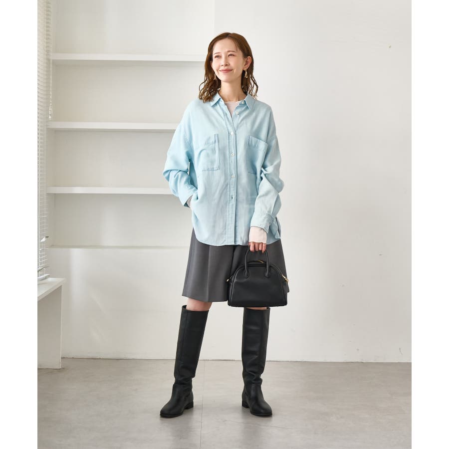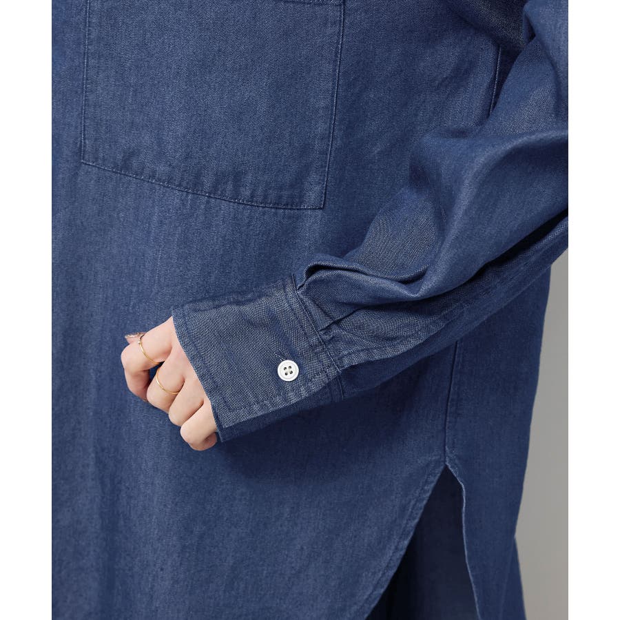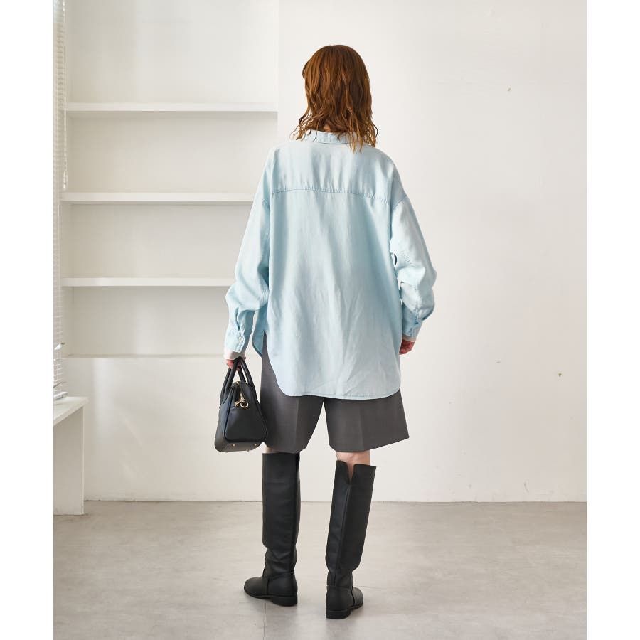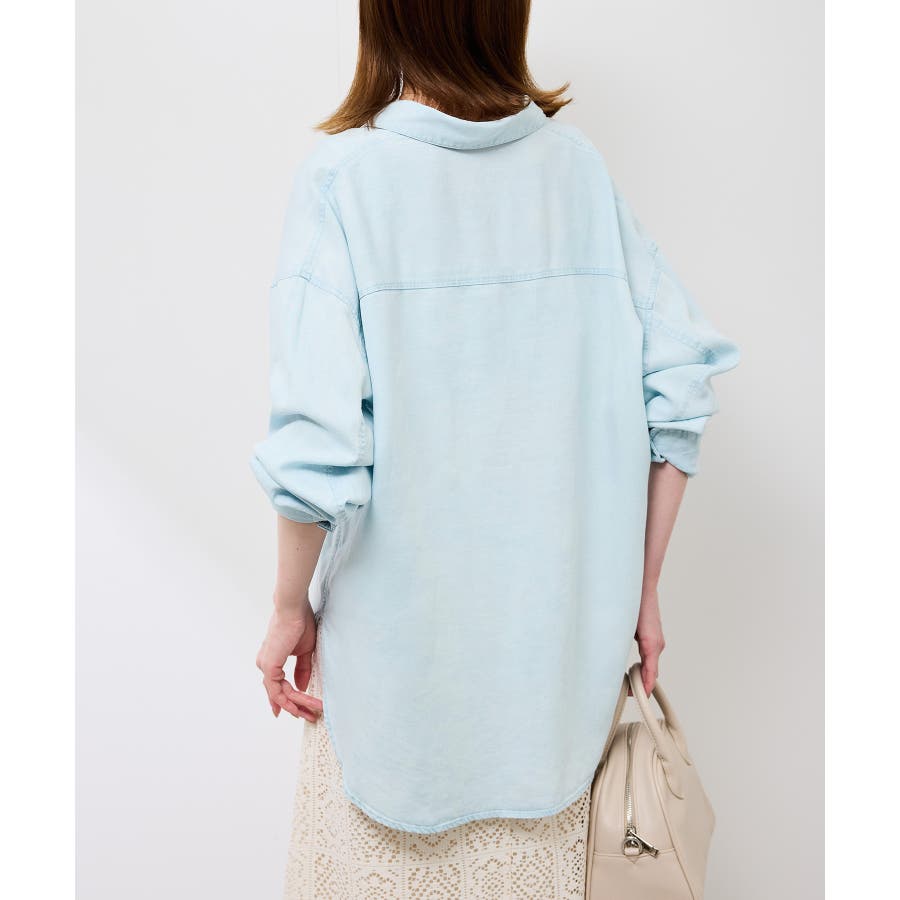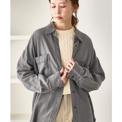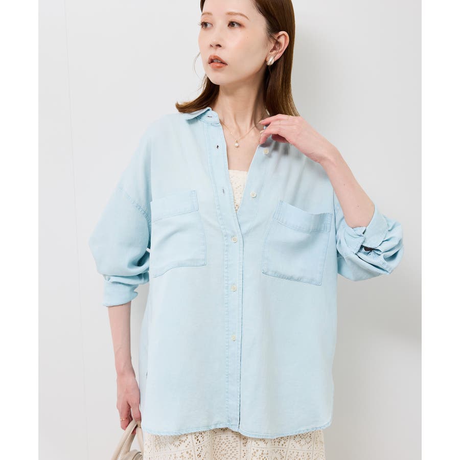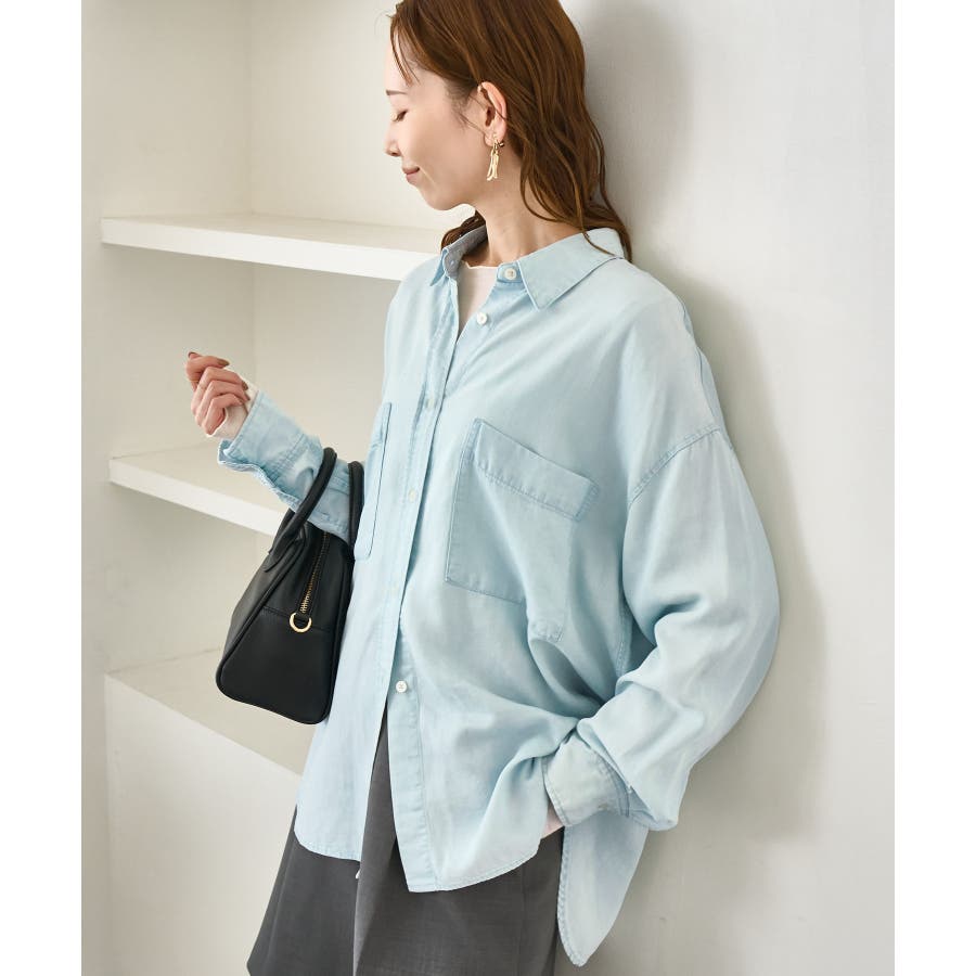 ・羽織やすい着丈のシャンブレー素材のシャツ。