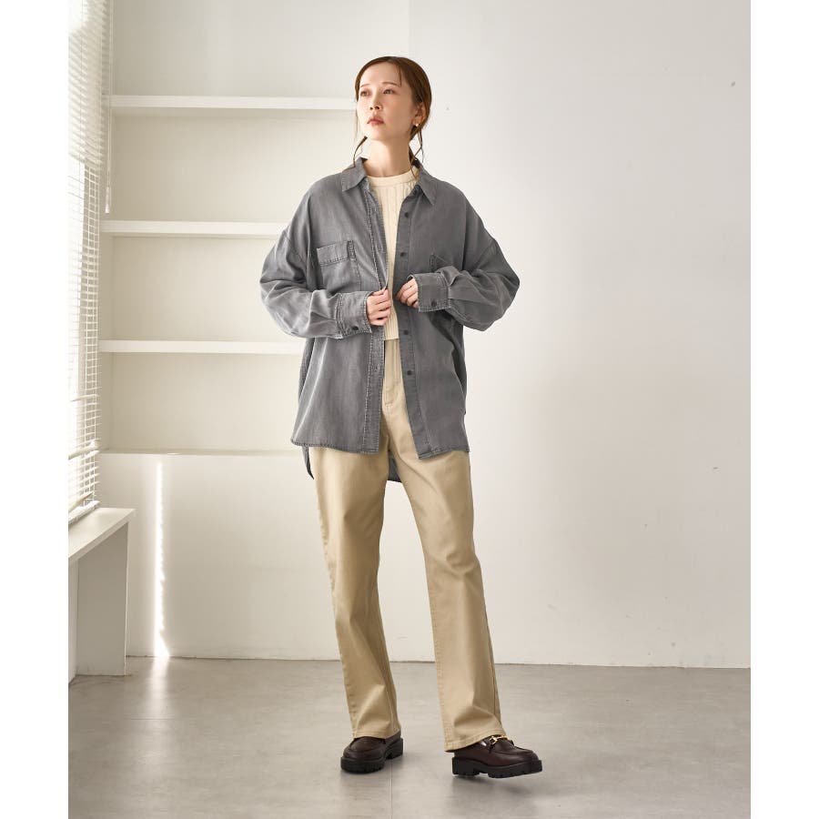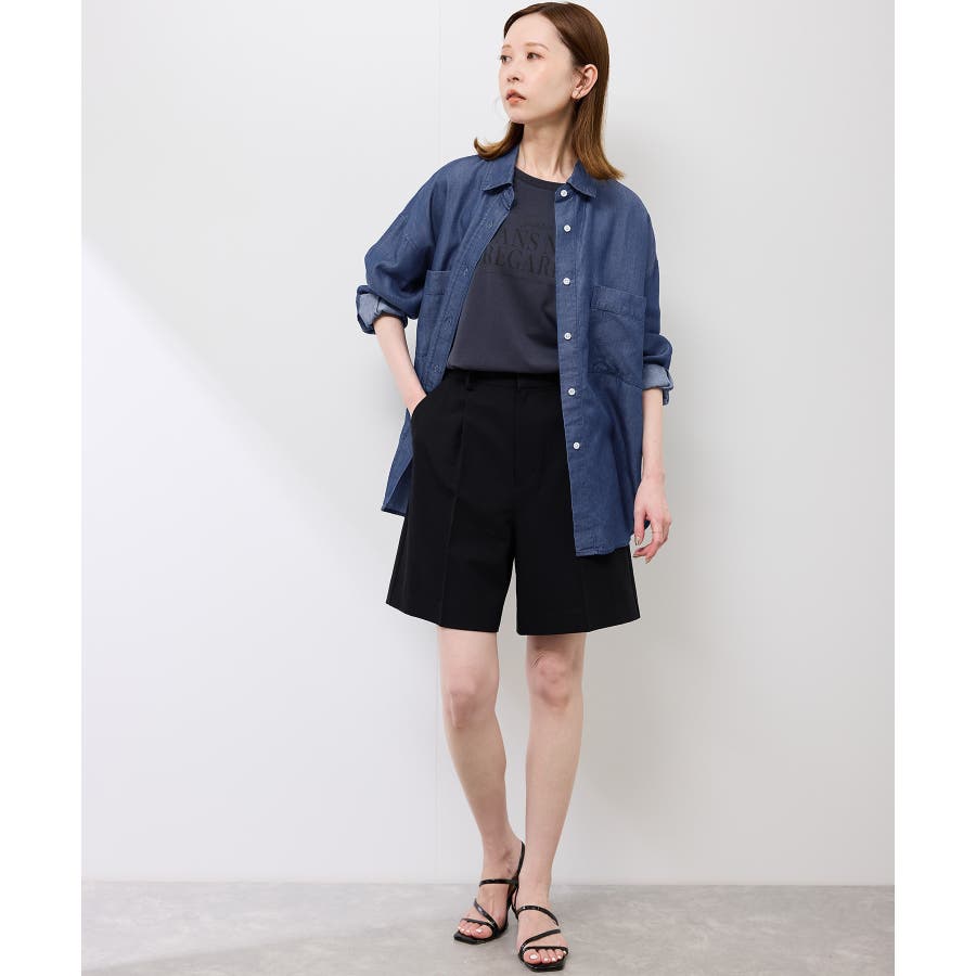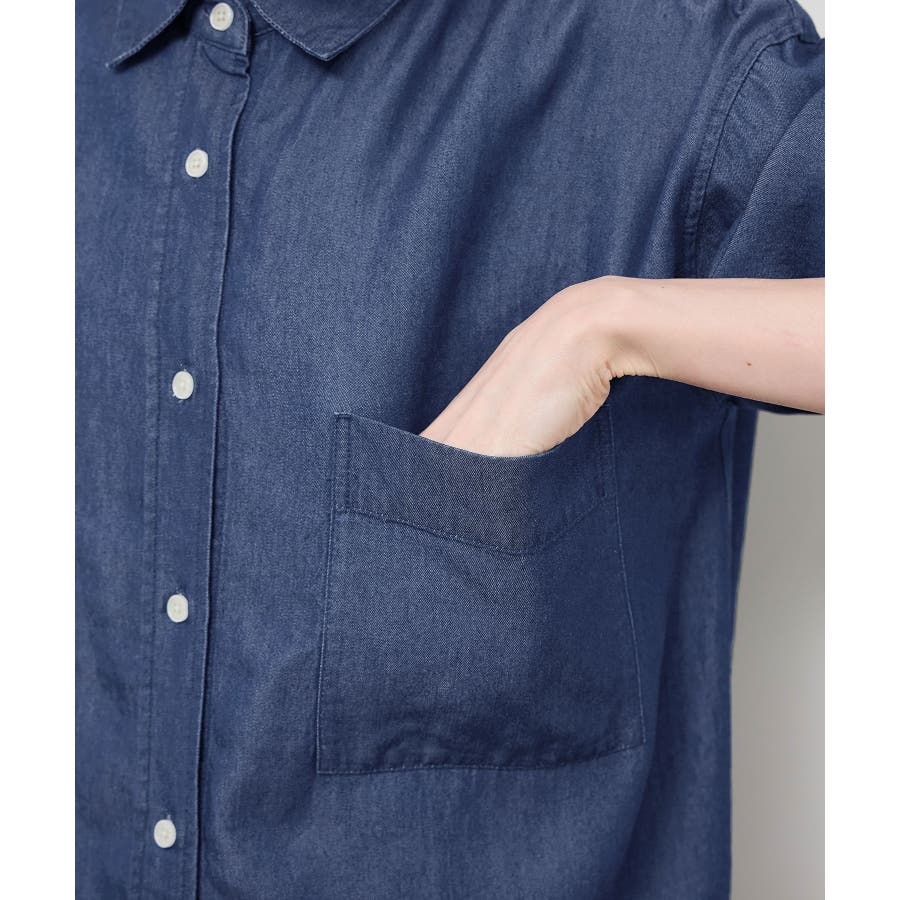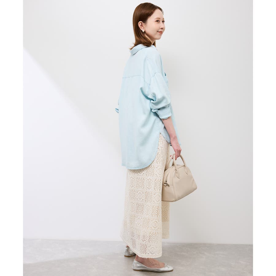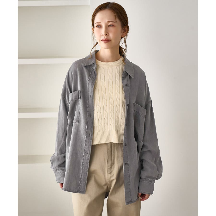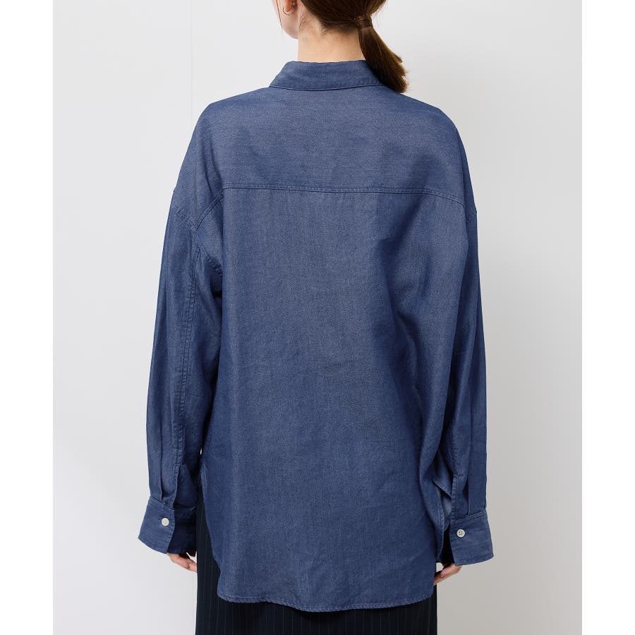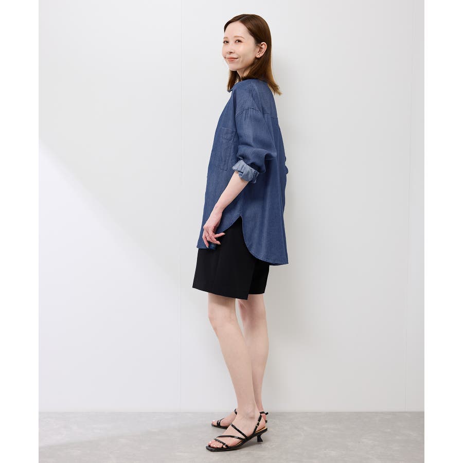 ・羽織やすい着丈のシャンブレー素材のシャツ。