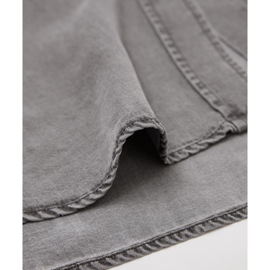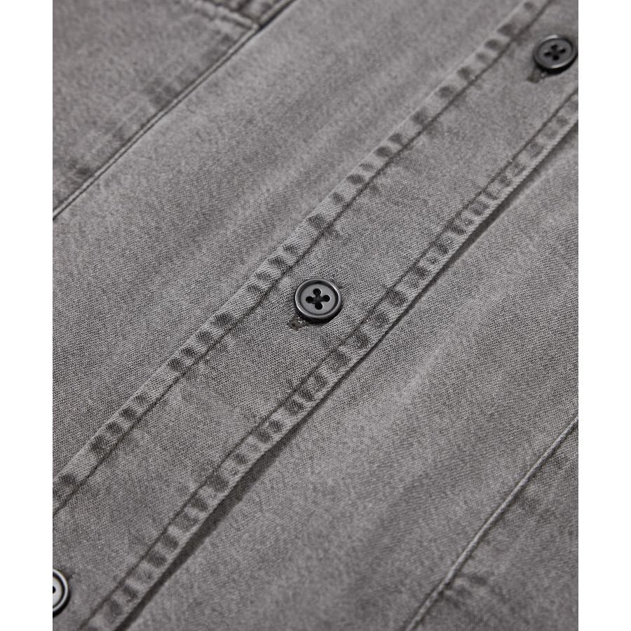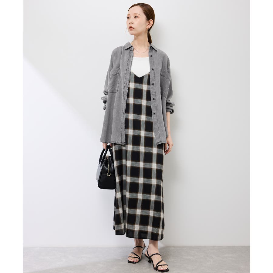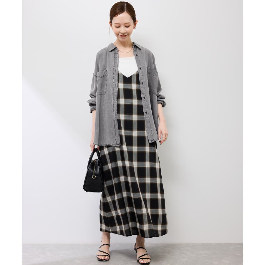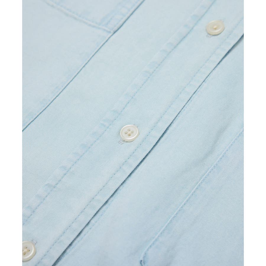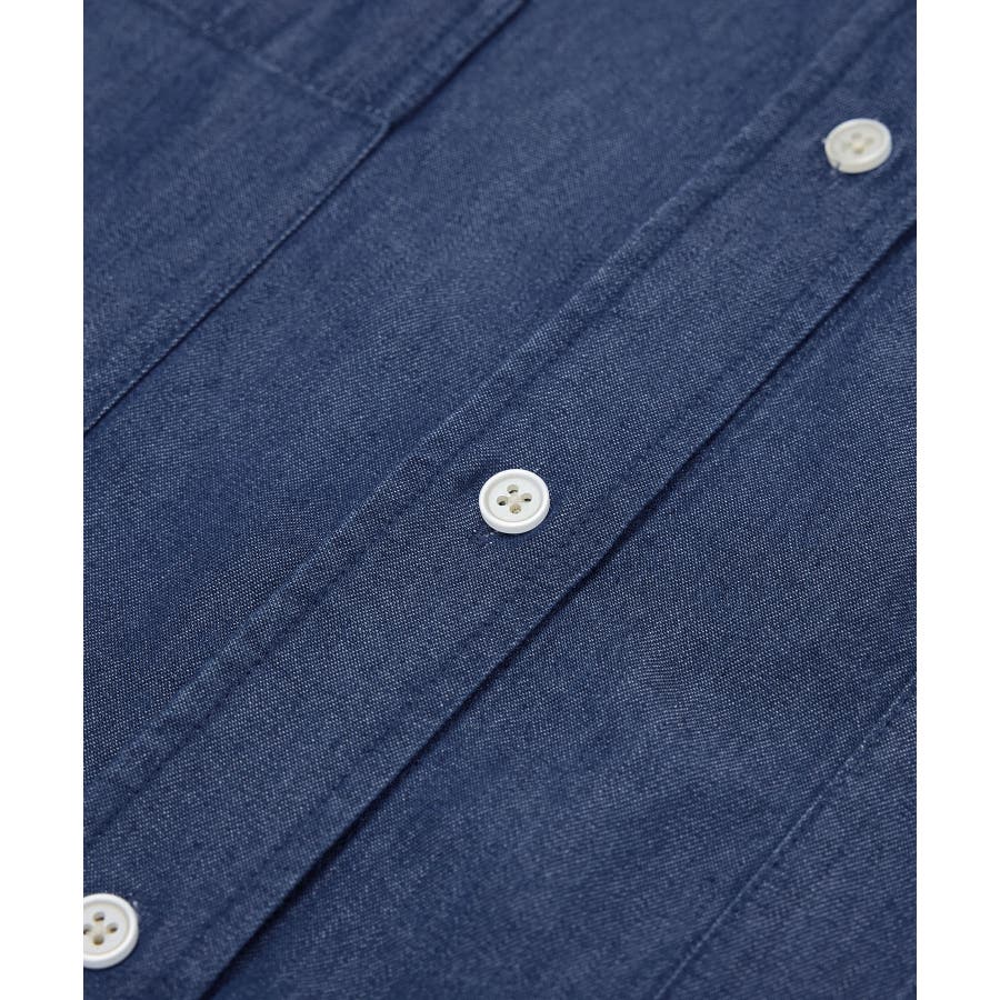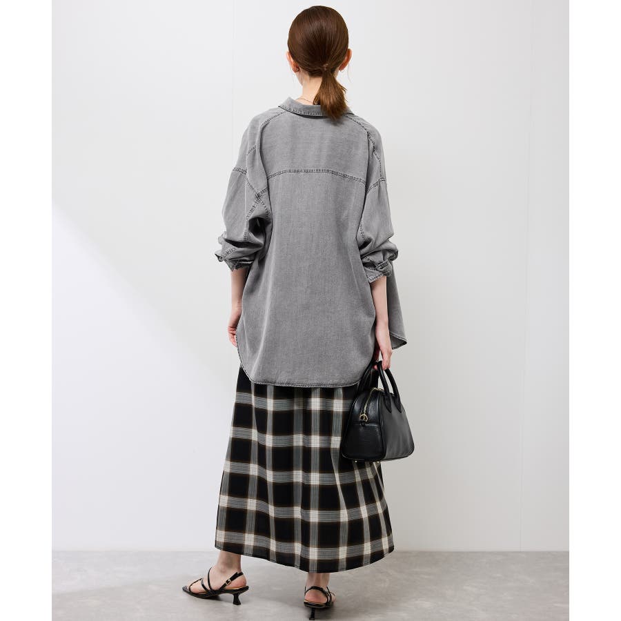 ・羽織やすい着丈のシャンブレー素材のシャツ。