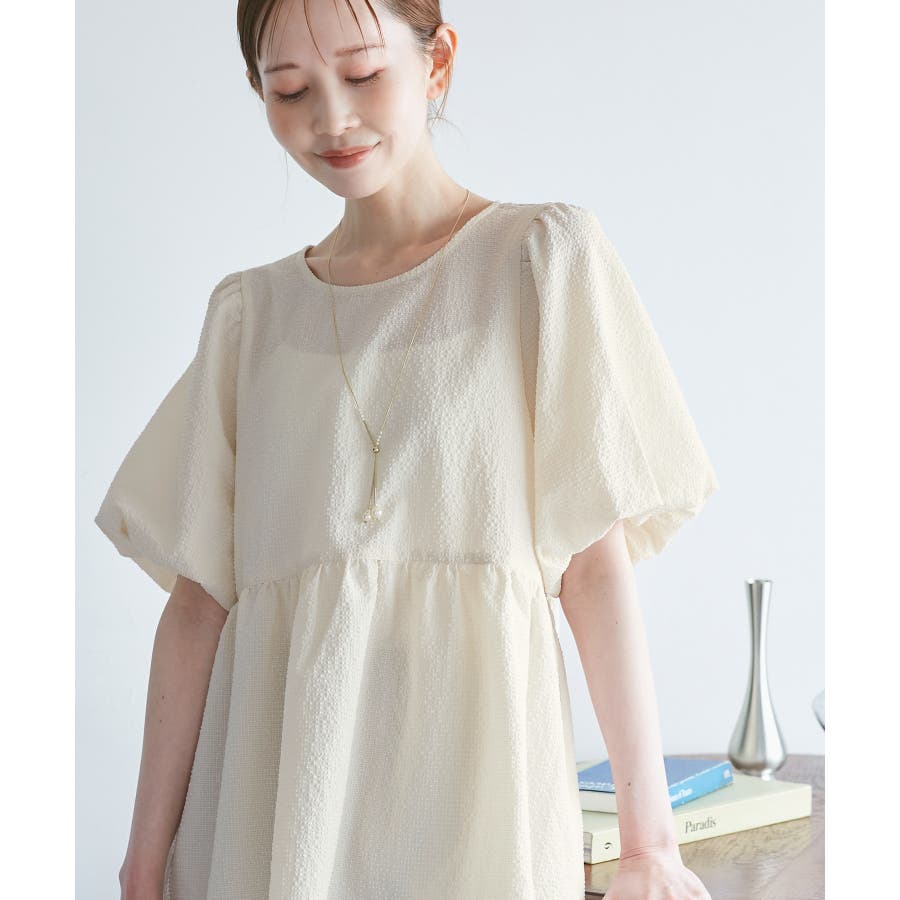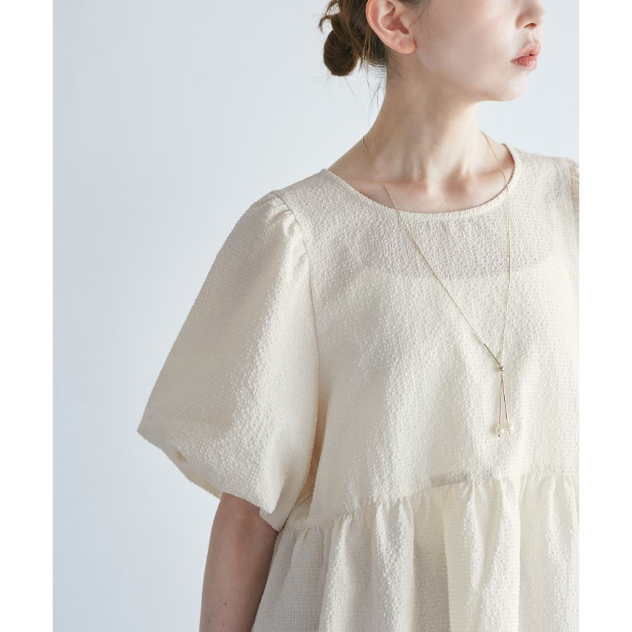 ・ボリュームのあるショートネックレスを合わせるのもおしゃれ。