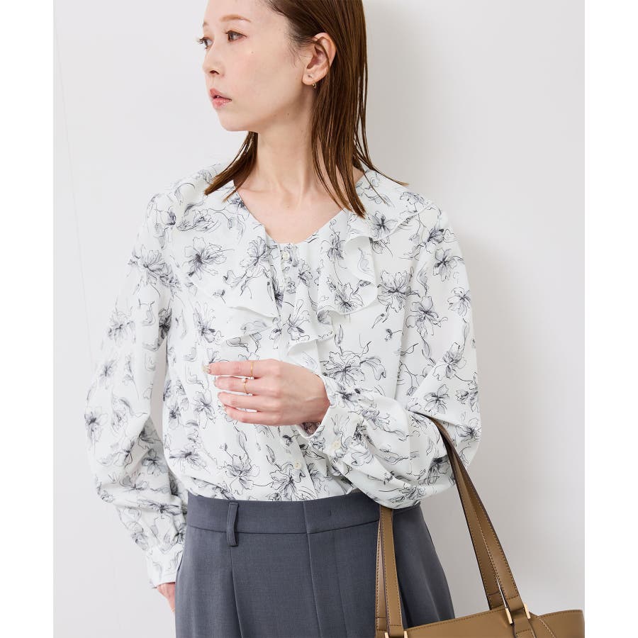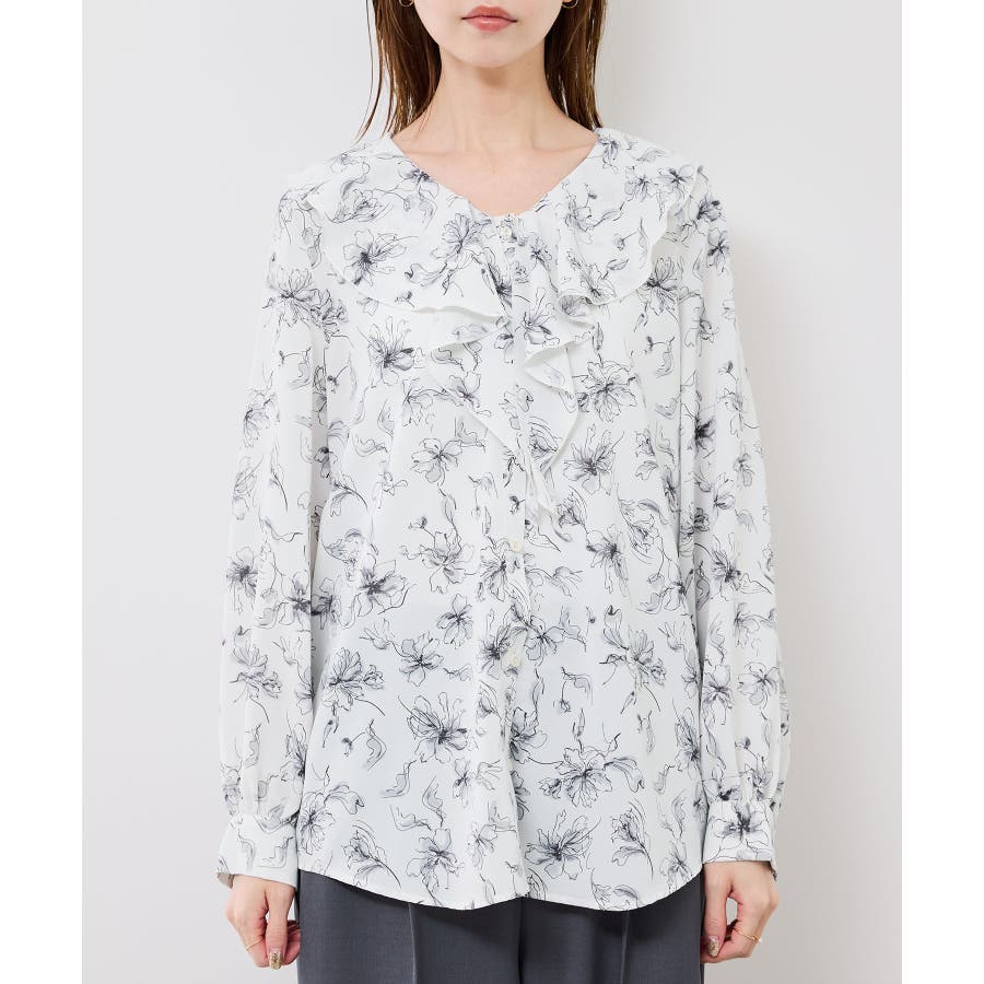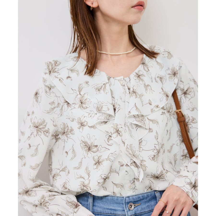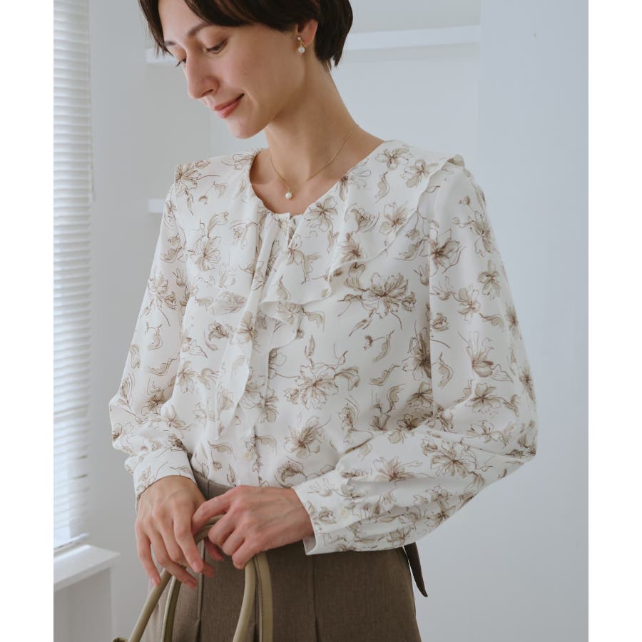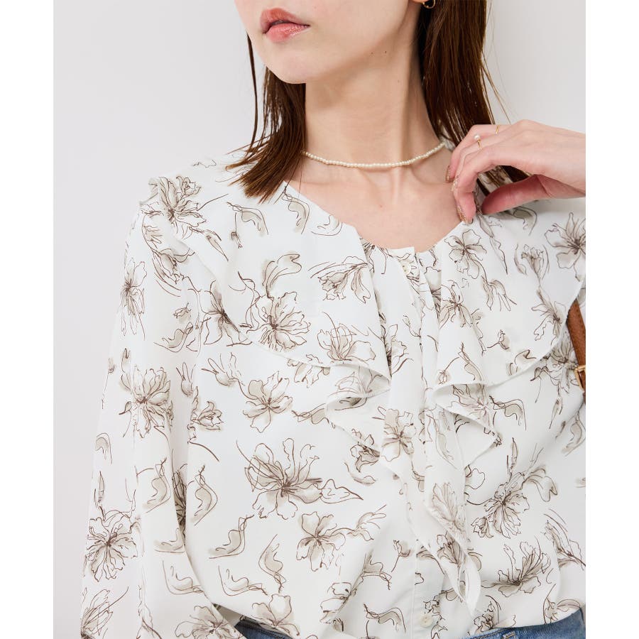 ・手描き調の花柄のラッフルカラーのブラウス。