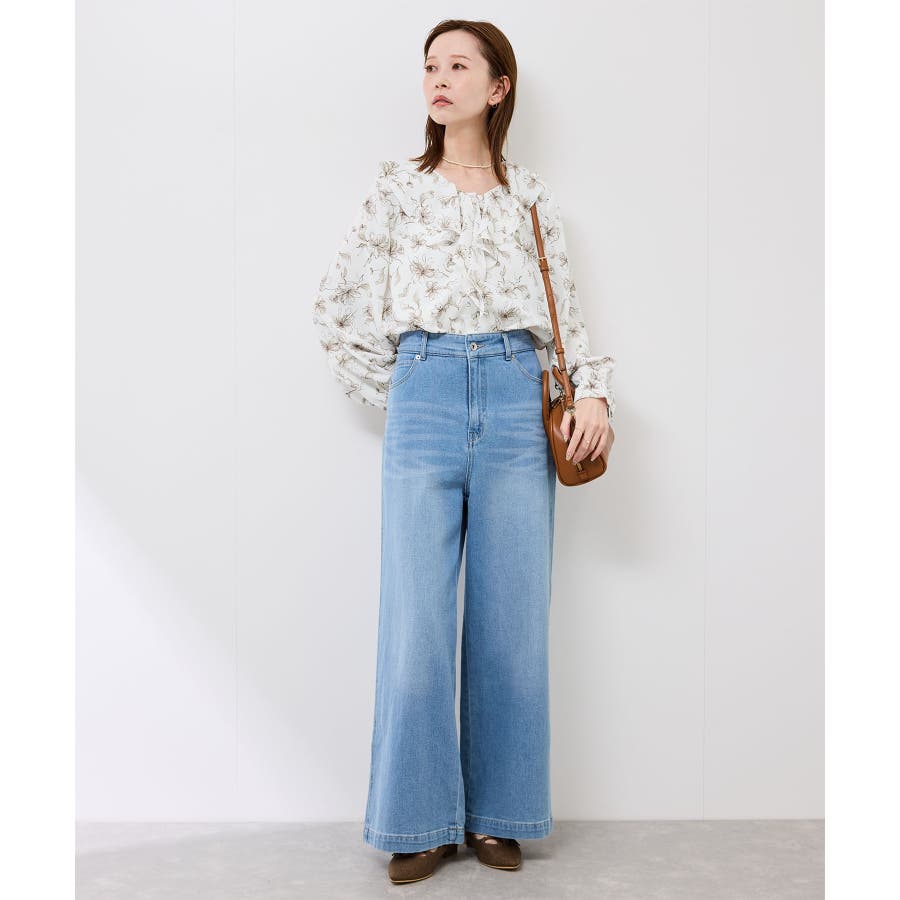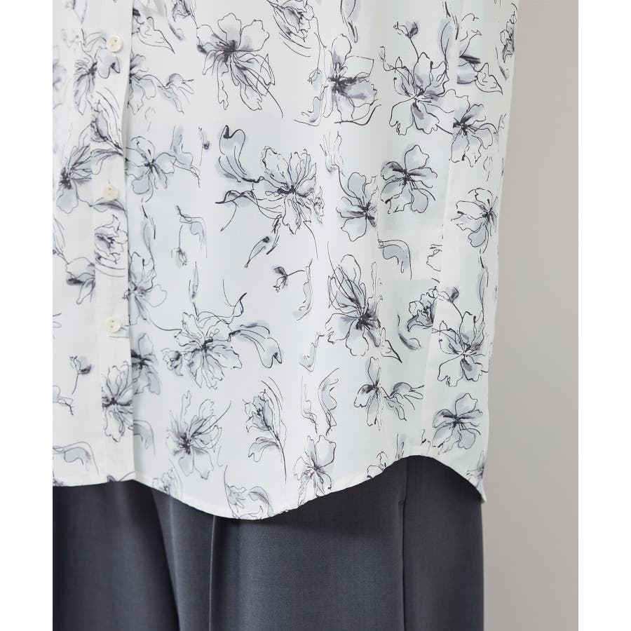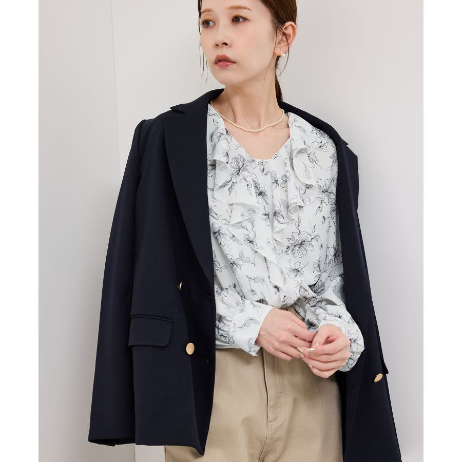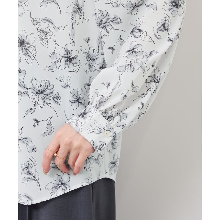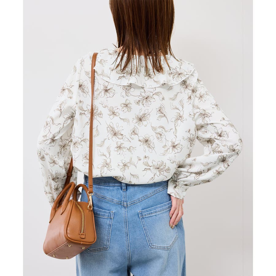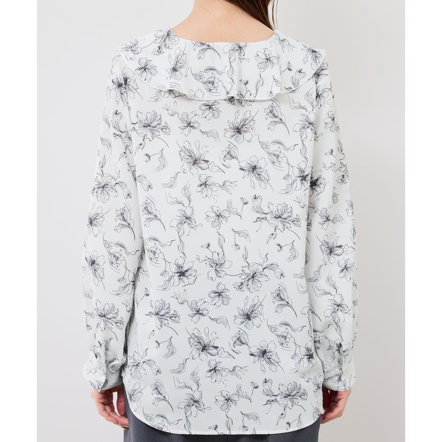 ・手描き調の花柄のラッフルカラーのブラウス。