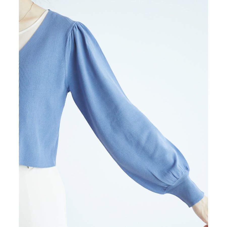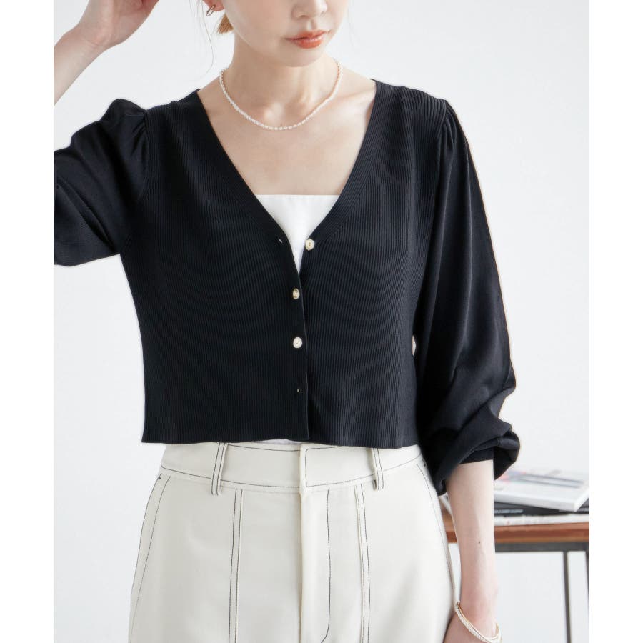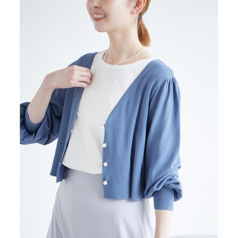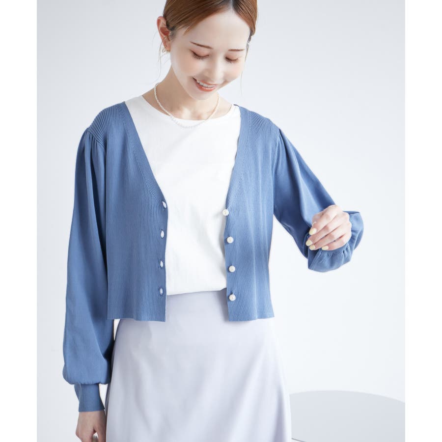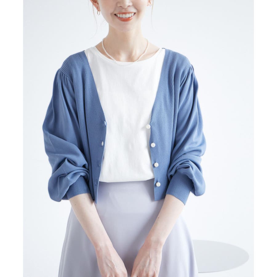 【素材感】 ・伸びの良いストレッチニットで動きやすさも抜群。 ・日差しの強い時期に嬉しいUVカット素材。 【デザイン・シルエット】 ・ボリュームたっぷりな袖と好バランスを形成する、ショート丈のVネックカーディガン。 ・袖口は長めのリブで切り替え、全体を引き締め。 【カラー】 ・ブラック、ライトグレー、ダスティブルー、クリームイエローの4色展開。 ・カラーによってボタンが異なります。 ブラック(01)クリーム(83):ゴールドボタン ライトグレー(08)ブルー系(45):パールボタン 【スタイリングポイント】 ・着丈の長い、チュニックシャツやロングカットソーとのレイヤードに。 ・広がりやすいワンピースの羽織にも活躍。 ・春っぽさを狙うなら、クリームイエローをチョイスして。 <同シリーズ> ・袖フレアニット(品番:GDM14550) ・タックスリーブニット(品番:GDM14510) ・バックパールニット(品番:GDM14540) ・ゼロスリーブニット(品番:GDM14520) ・ハーフスリーブ(品番:GDM14500) ----------------------------- 裏地:なし 透け感:なし 伸縮性:あり 生地感・厚さ:普通 季節:春・夏 ----------------------------- ※撮影時の光、お使いのモニター環境によって色の見え方が違う場合がございます。 ※モデル身長:165cm 着用サイズ:38