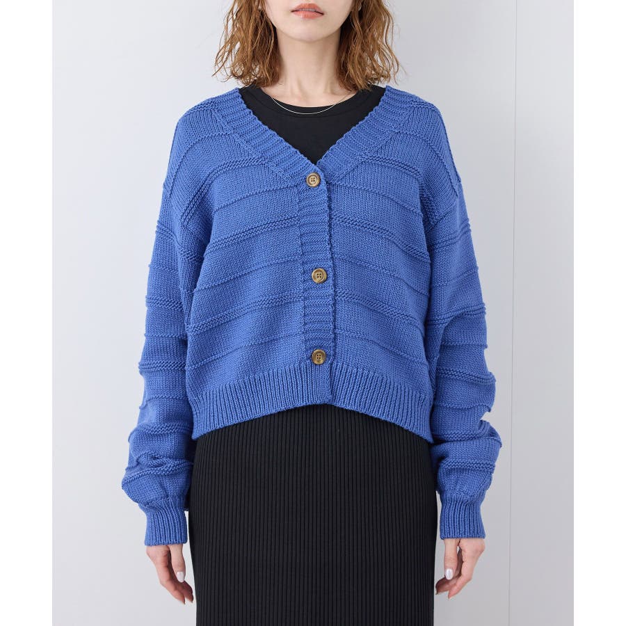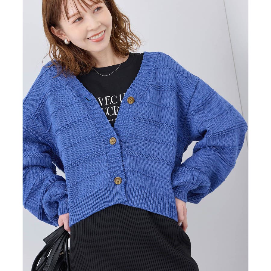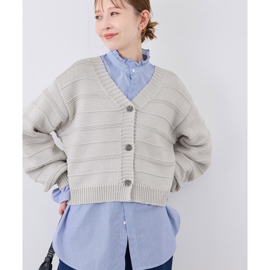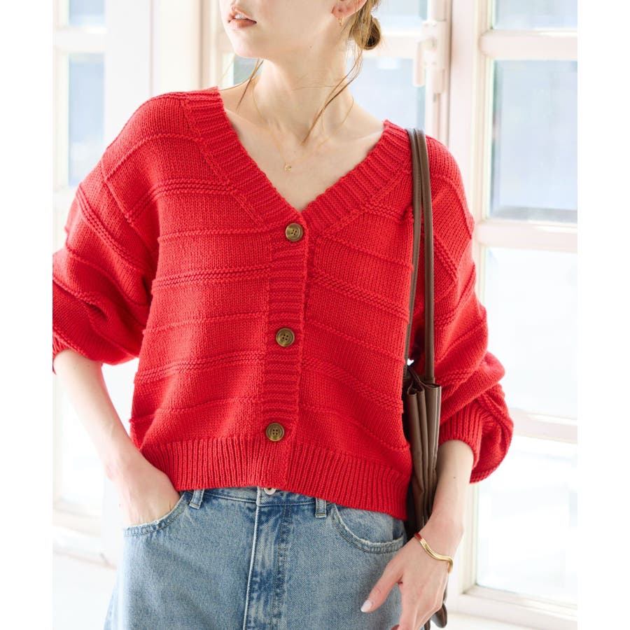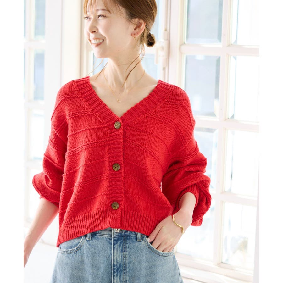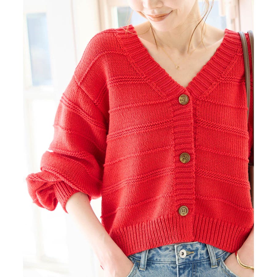 【デザイン・シルエット】 ・ガーター編みの表情豊かなボーダー柄ニットカーディガン。 ・ルーズフィットをバランス良く見せる、Vネックとショート丈がポイント。 ・リブ編み切り替えは幅を持たせてすっきり感をプラス。 ・華やかな金ボタンを採用。 【カラー】 ・ライトグレー、ブルー、レッド、クリームイエローの明るい4色を展開。 【スタイリングポイント】 ・レッドはデニムのボトム合わせが一押し。 ・可愛らしいオールインワンの上から羽織ると今っぽいスタイルに。 ・前の開きが広いので、インナーはロゴロンTが一押し。 ・マフラーのように巻いてポイントにするのも可愛い。 ----------------------------- 裏地:なし 透け感:なし 伸縮性:ややあり 生地感・厚さ:普通 ポケット:なし 季節:秋・冬 ----------------------------- ※撮影時の光、お使いのモニター環境によって色の見え方が違う場合がございます。 ※モデル身長:165cm 着用サイズ:38