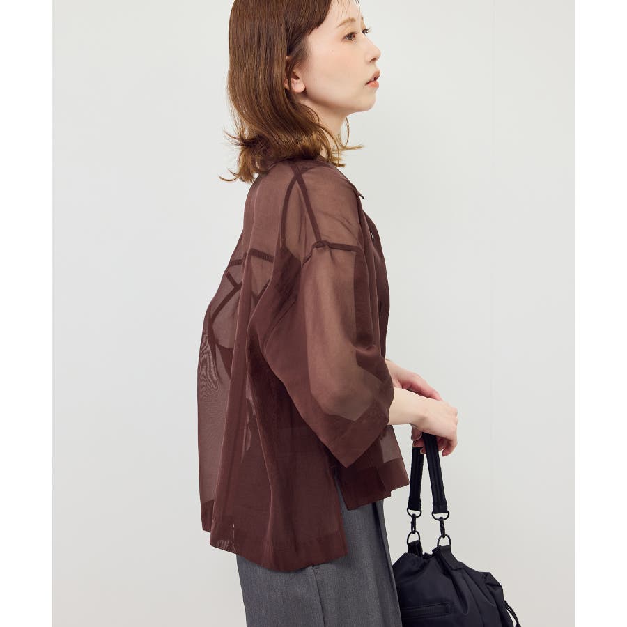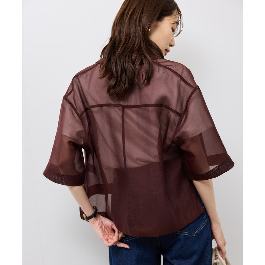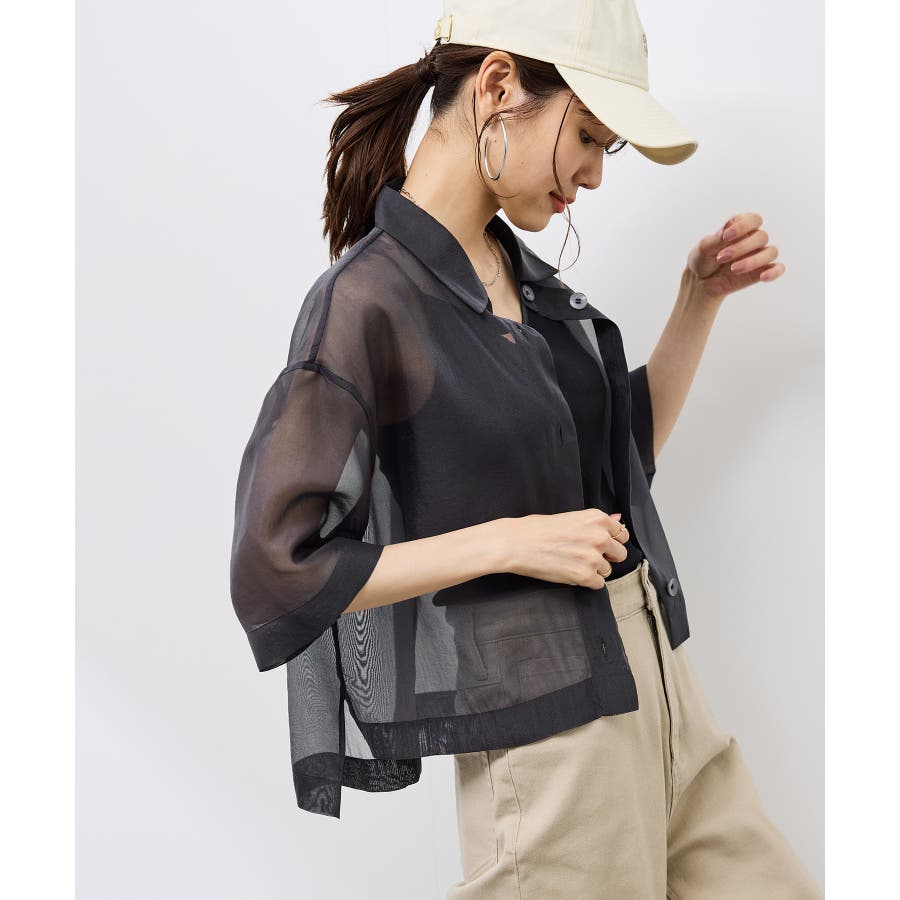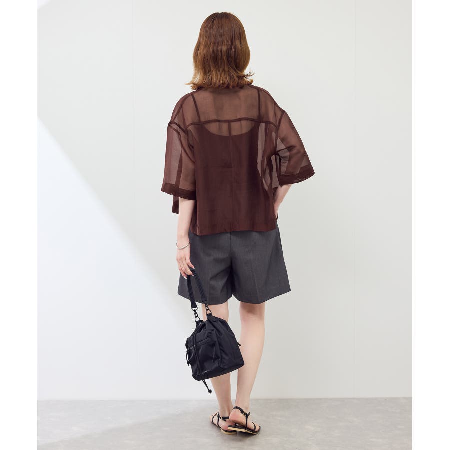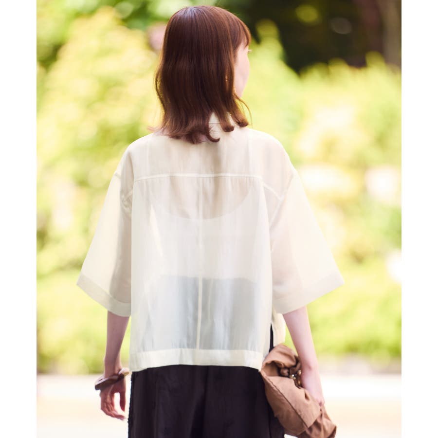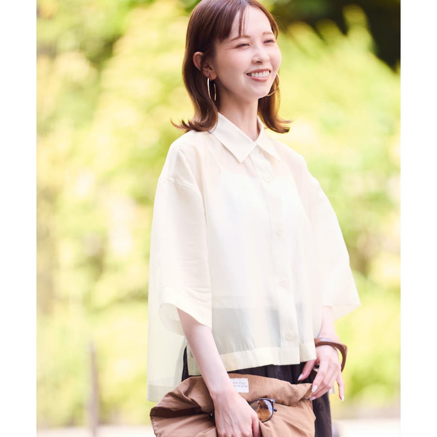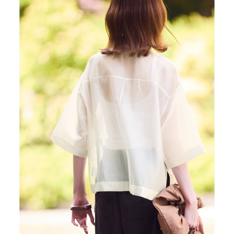 ・シアー素材&五分袖よりやや長めの袖で大胆な露出は避けながら清涼感のあるスタイルに。