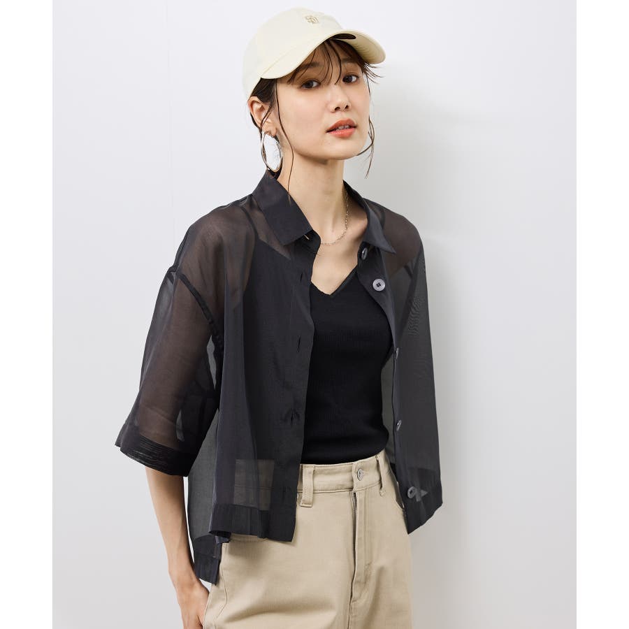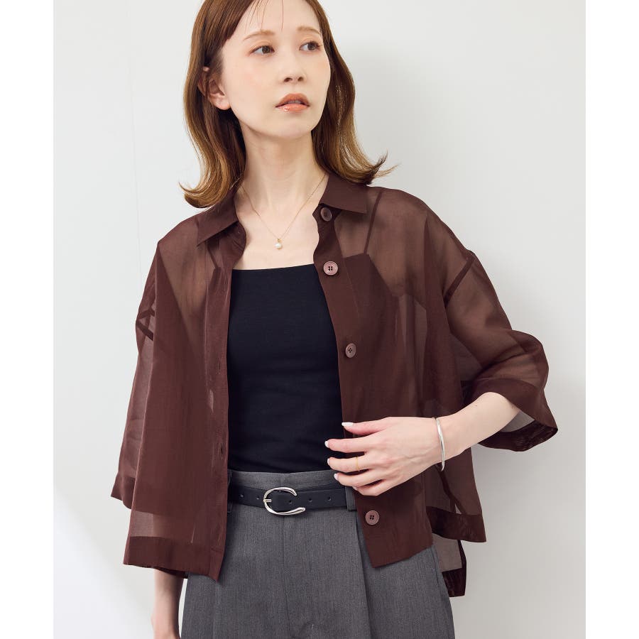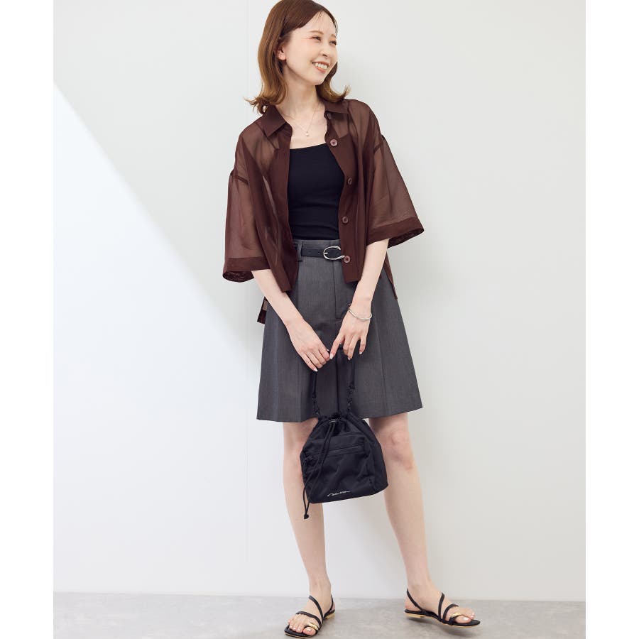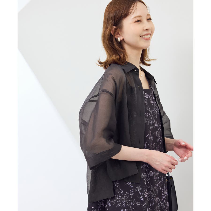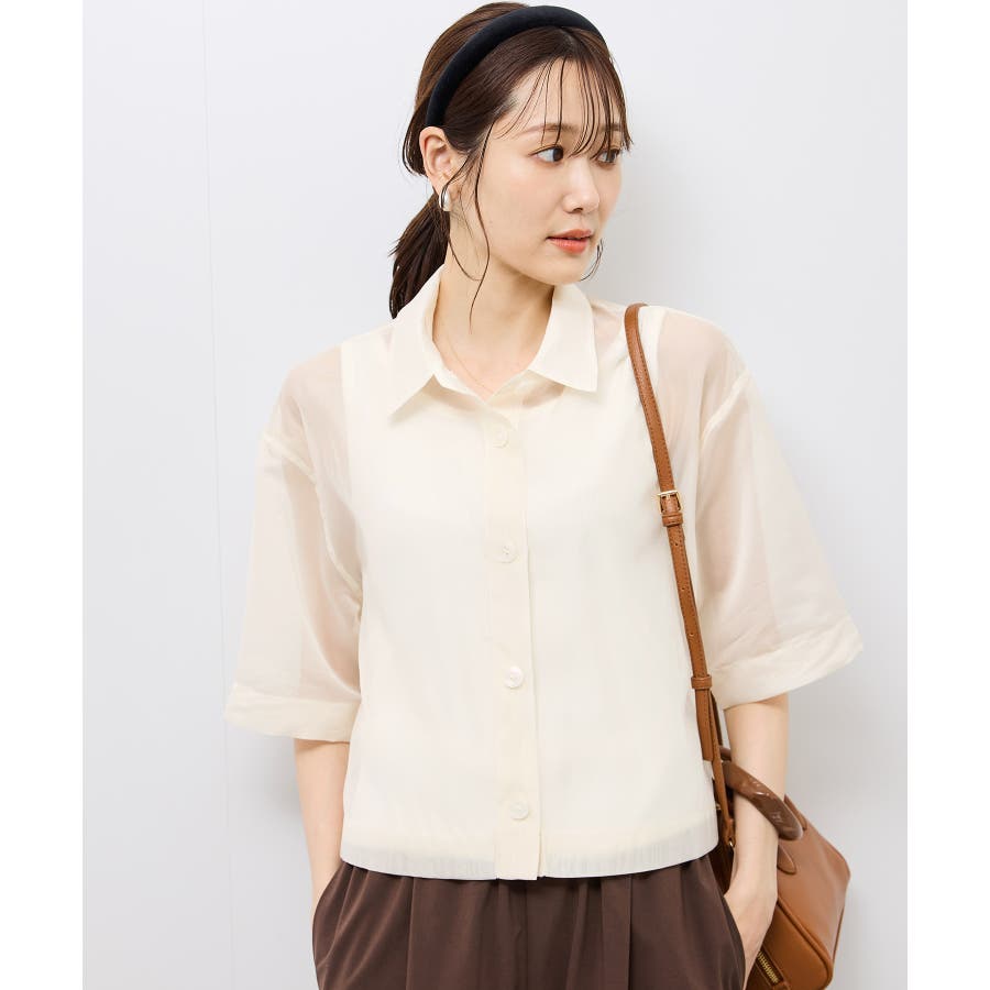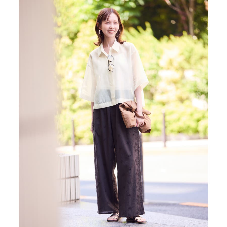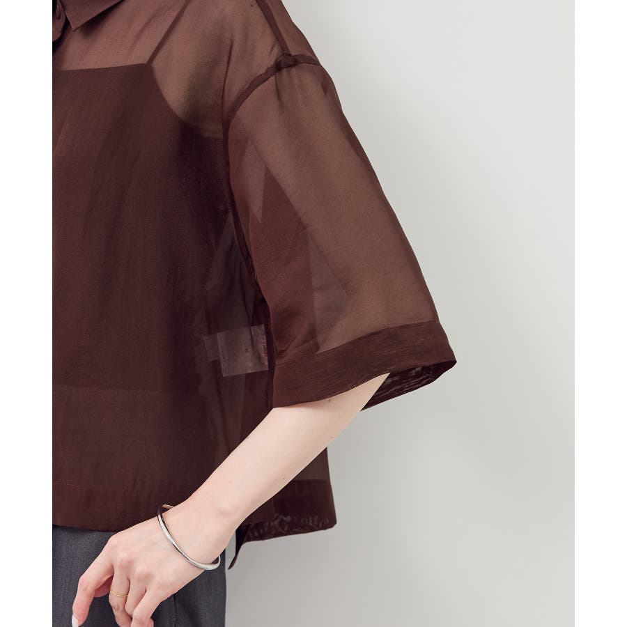 ・シアー素材&五分袖よりやや長めの袖で大胆な露出は避けながら清涼感のあるスタイルに。