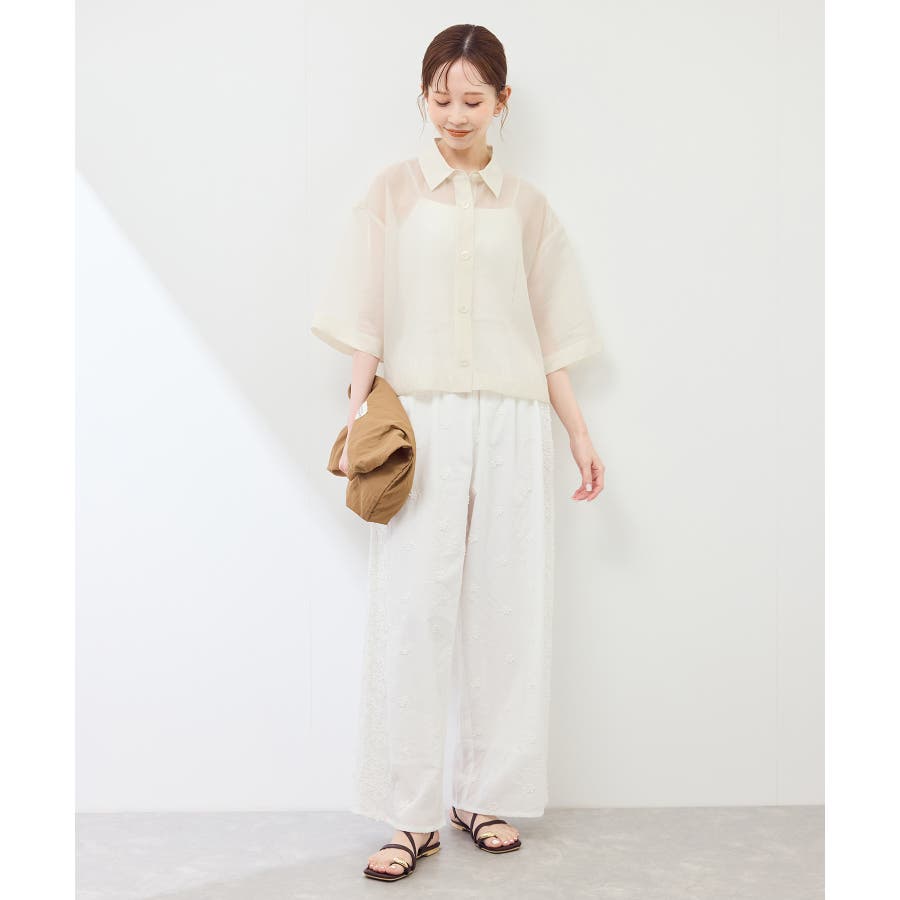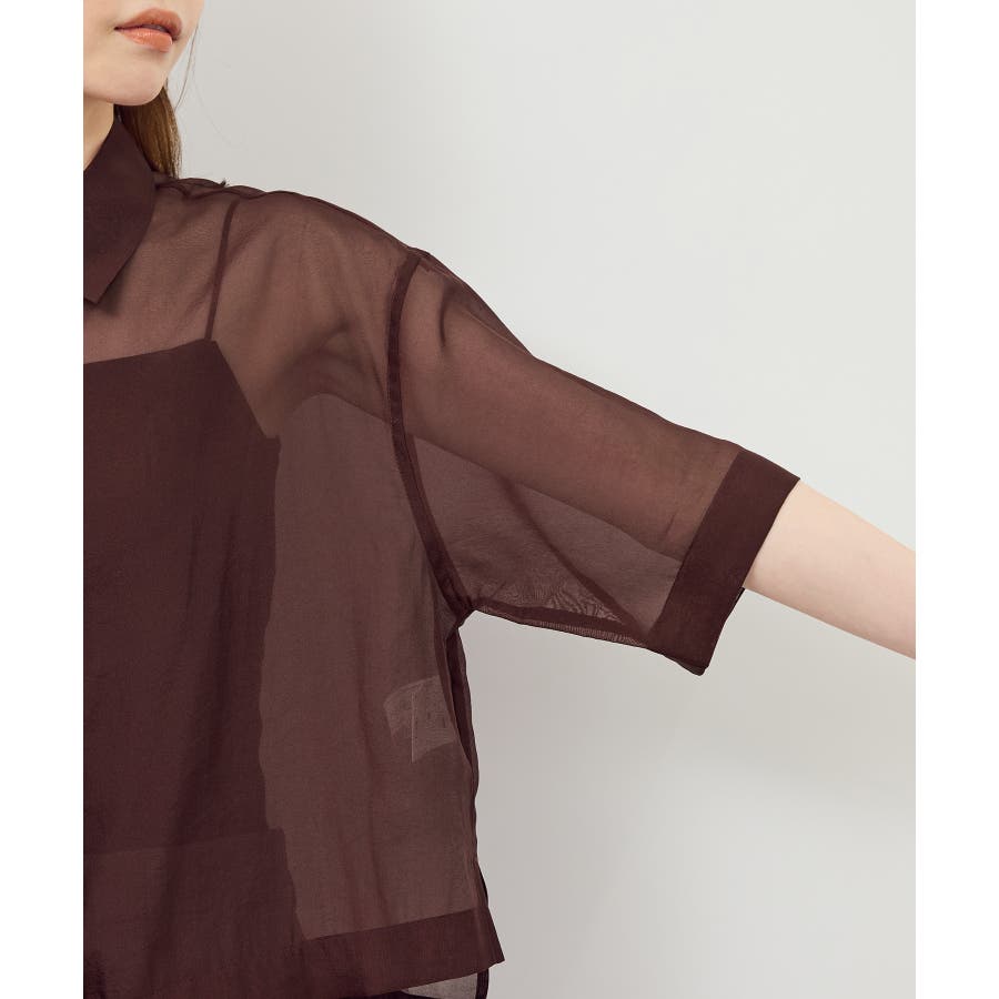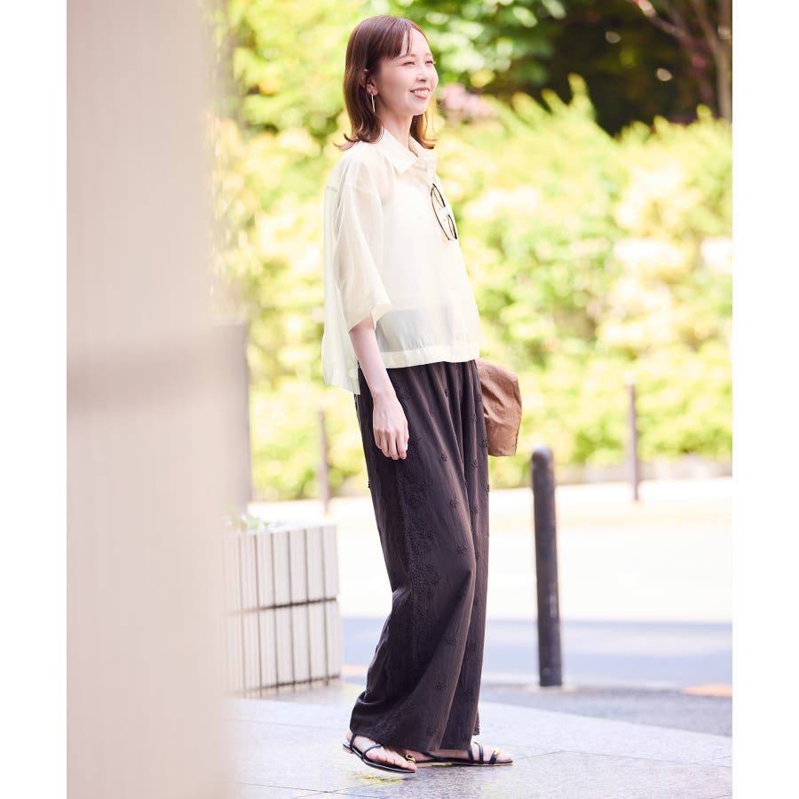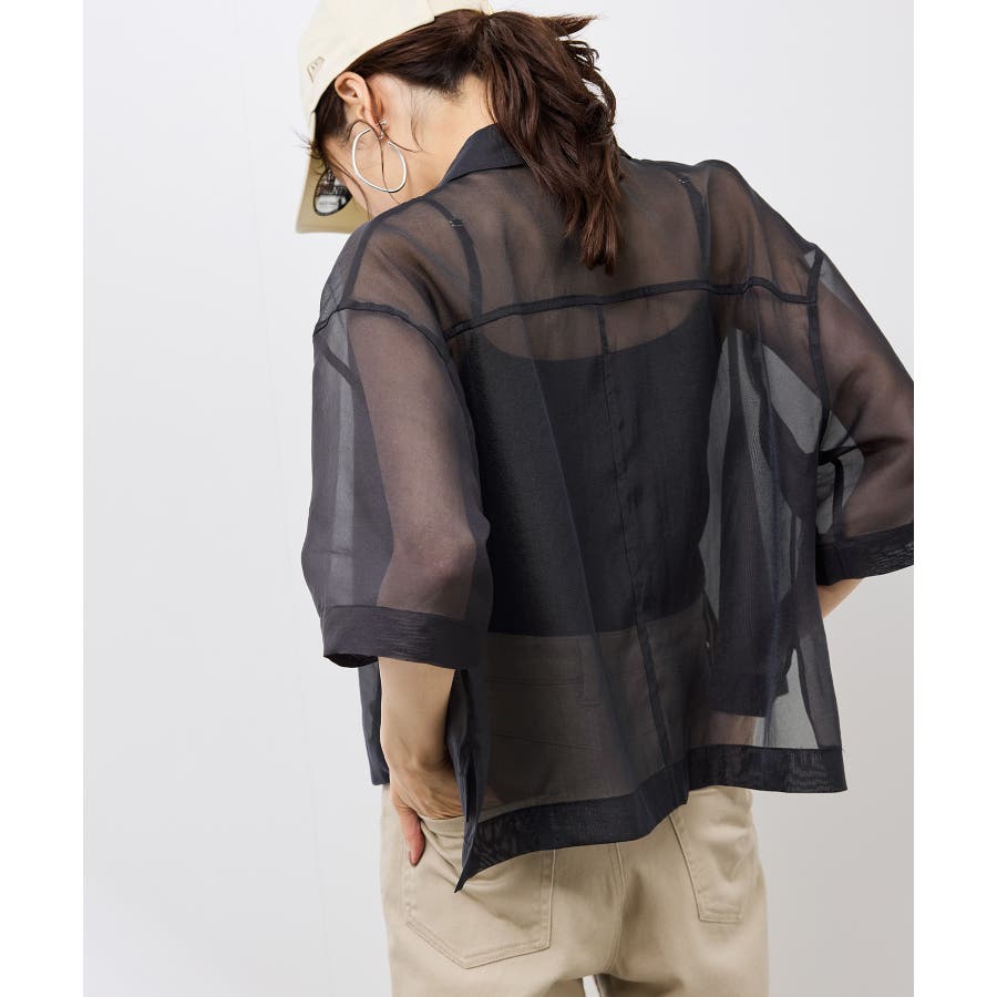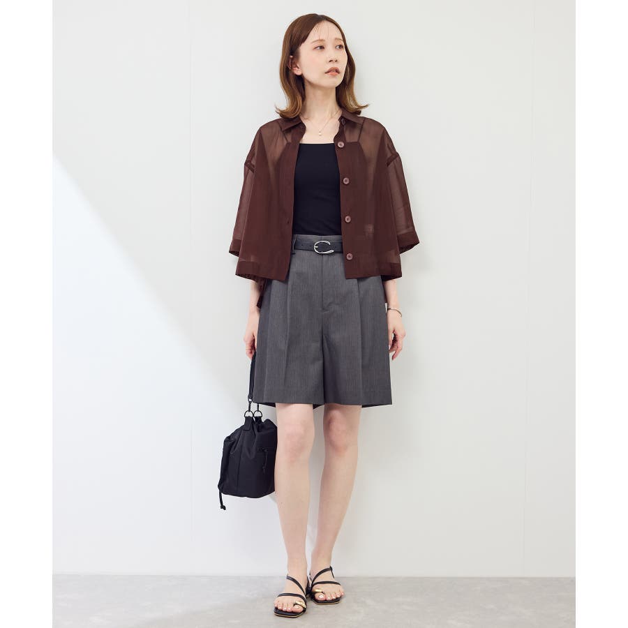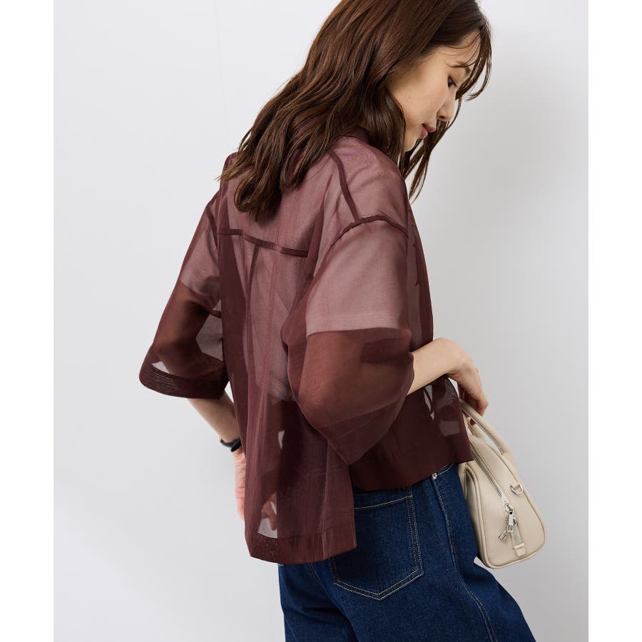 ・シアー素材&五分袖よりやや長めの袖で大胆な露出は避けながら清涼感のあるスタイルに。