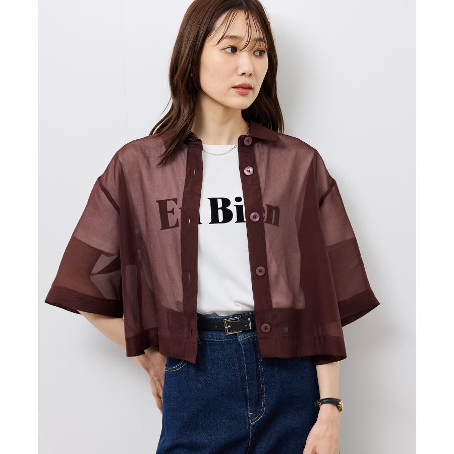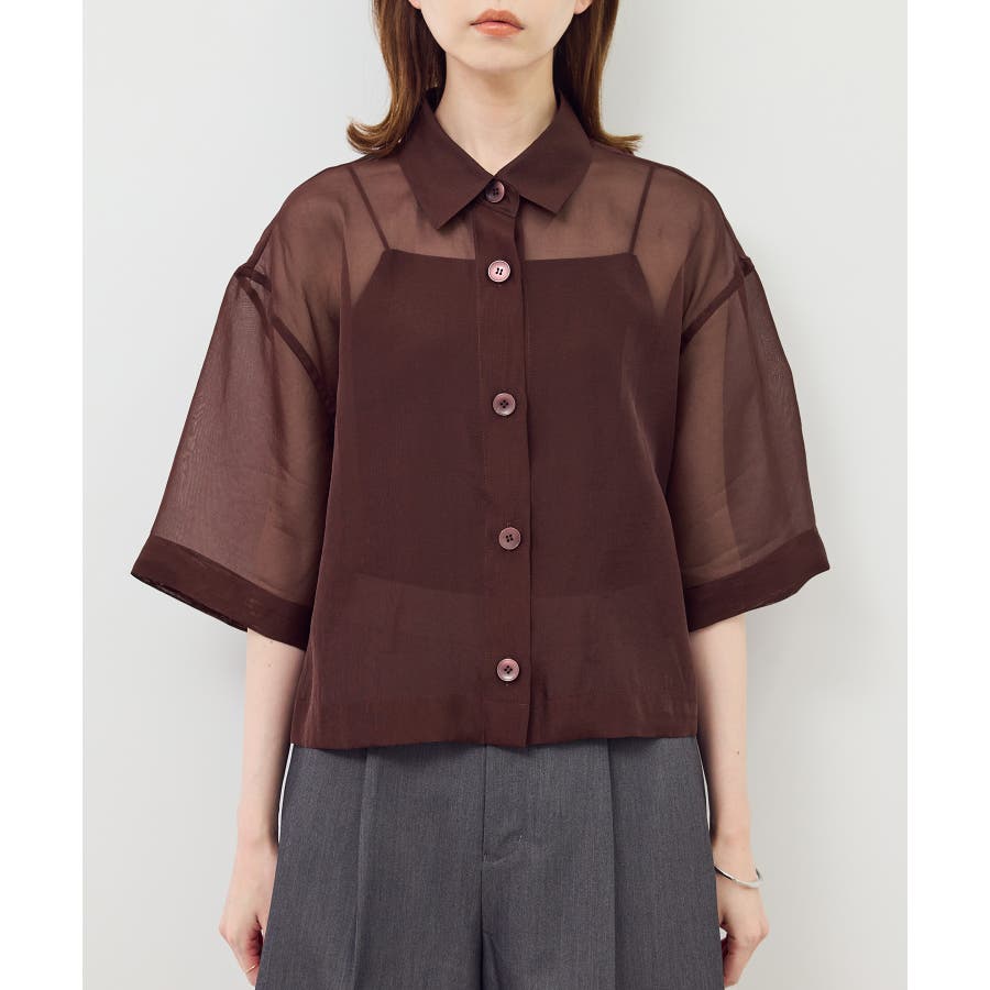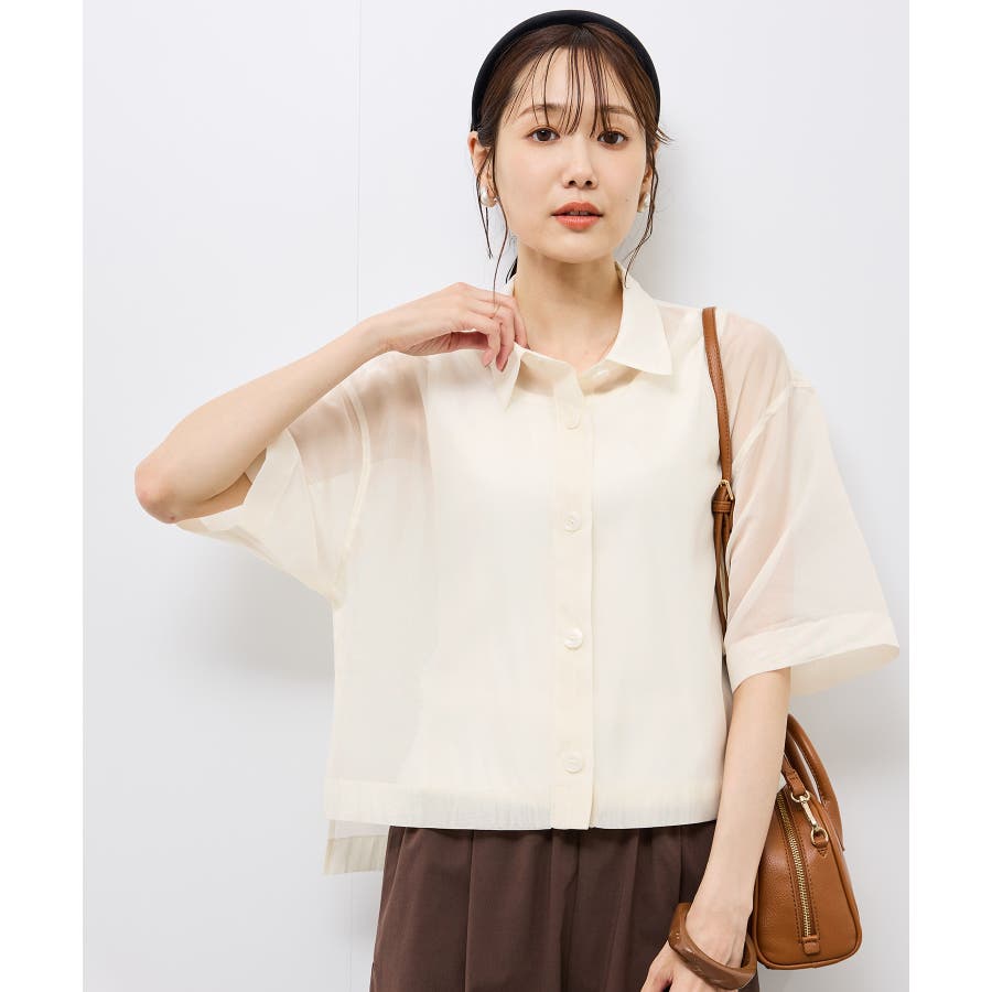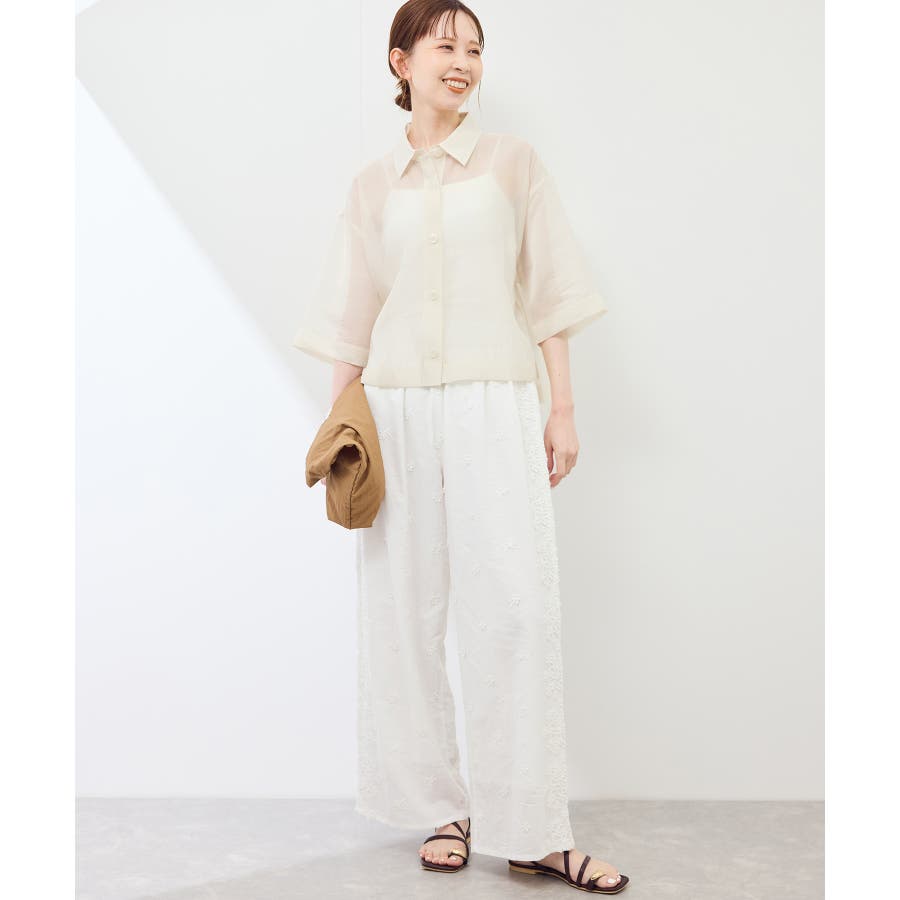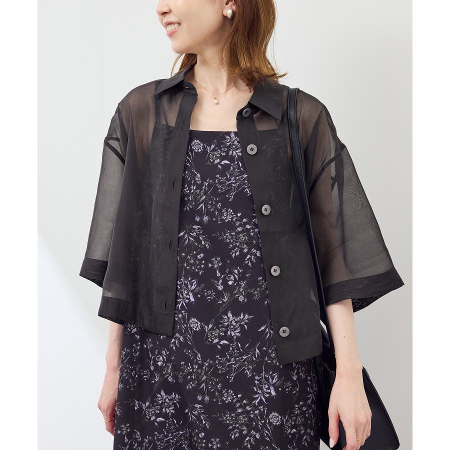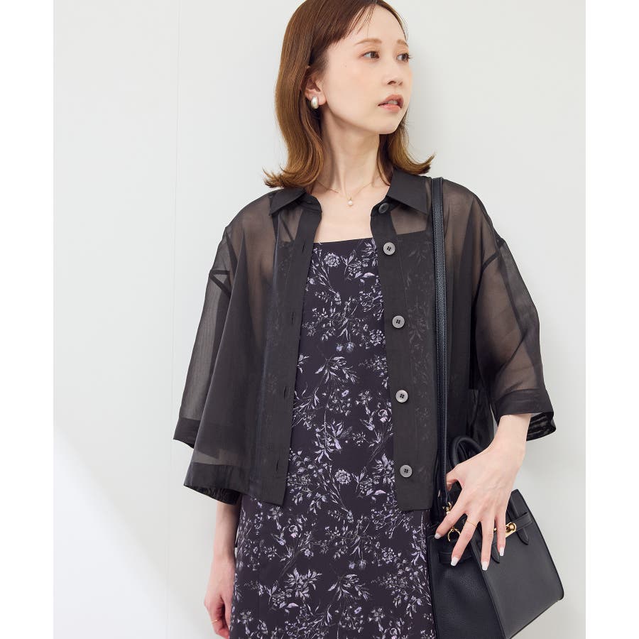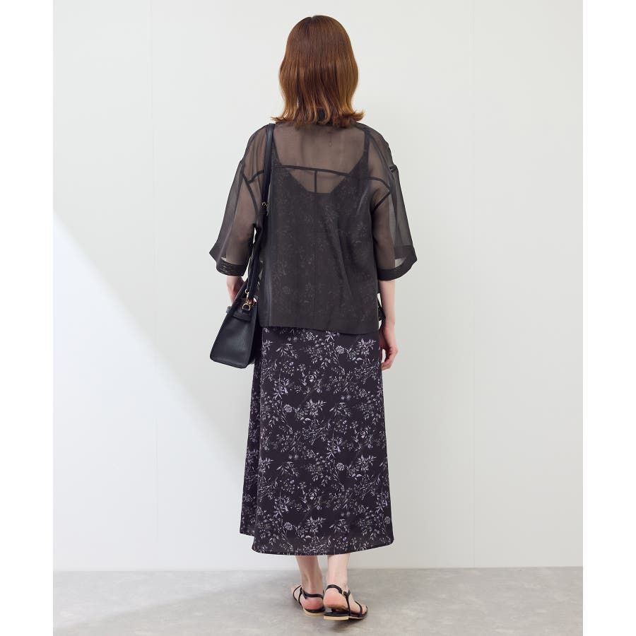 ・シアー素材&五分袖よりやや長めの袖で大胆な露出は避けながら清涼感のあるスタイルに。
