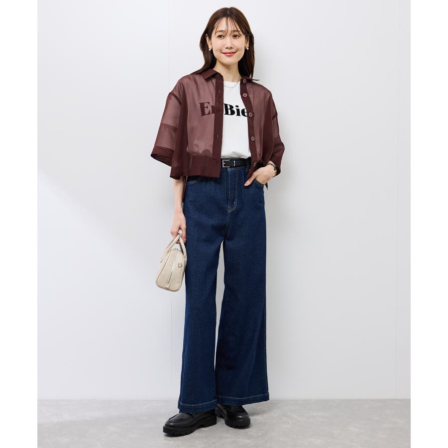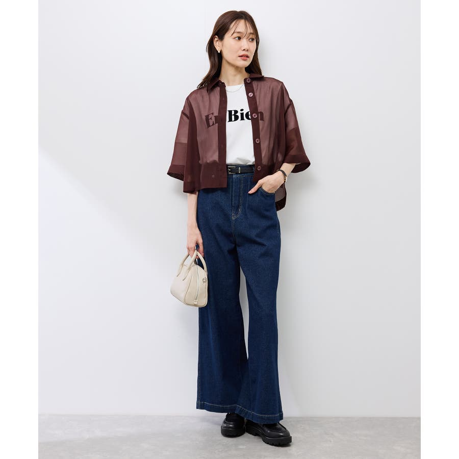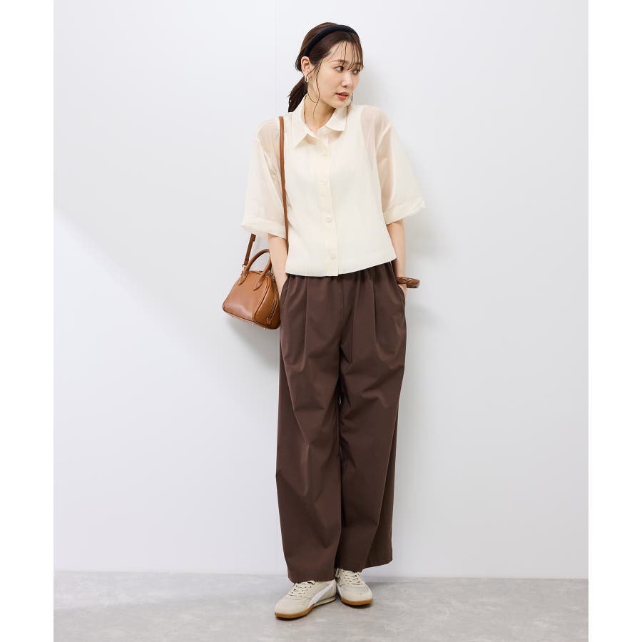 透けたトップスですが、秋口も着られるようにブラウン系を選びました。丈は短かめなので脚長効果もあります。