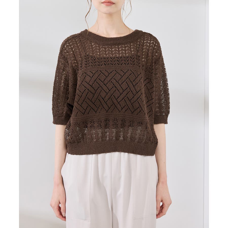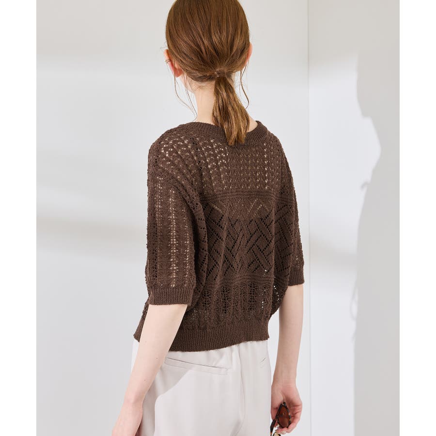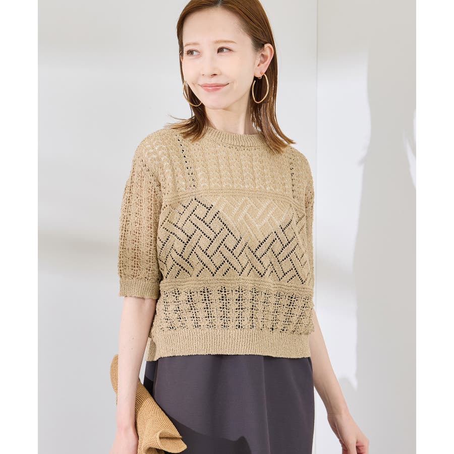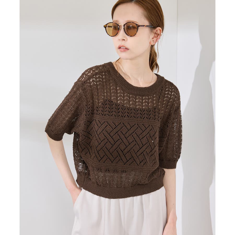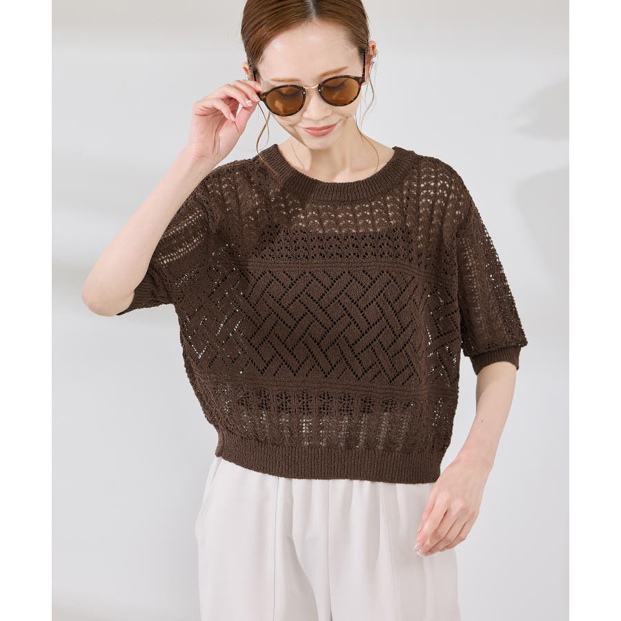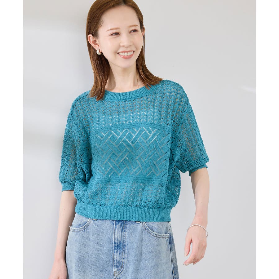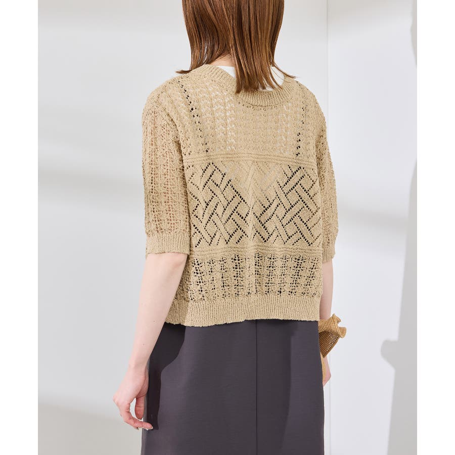 ・涼やかな透かし編みレースの半袖ニットトップス。