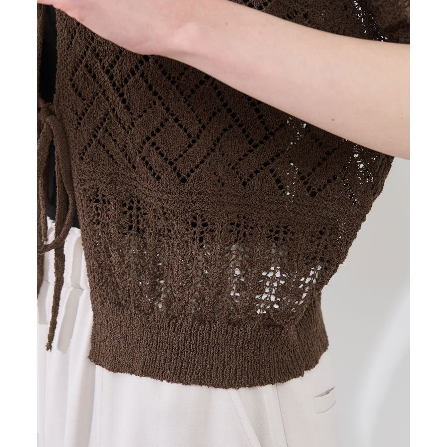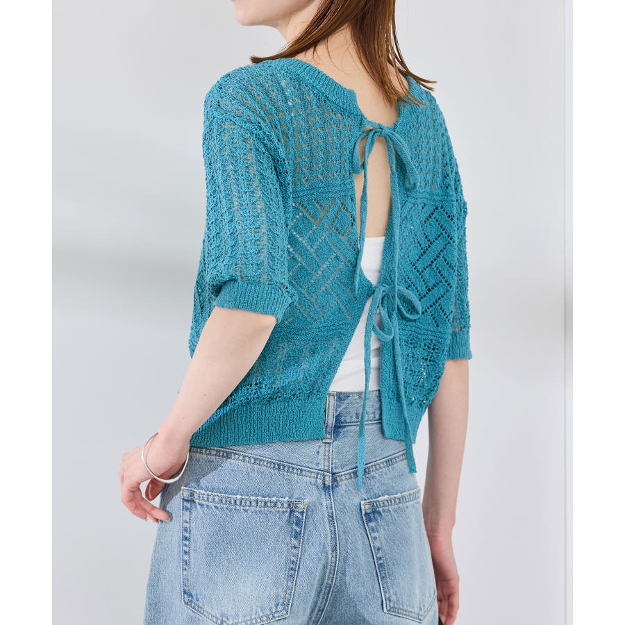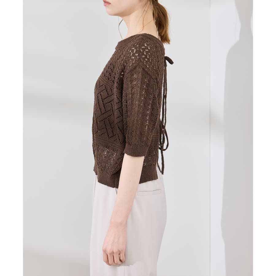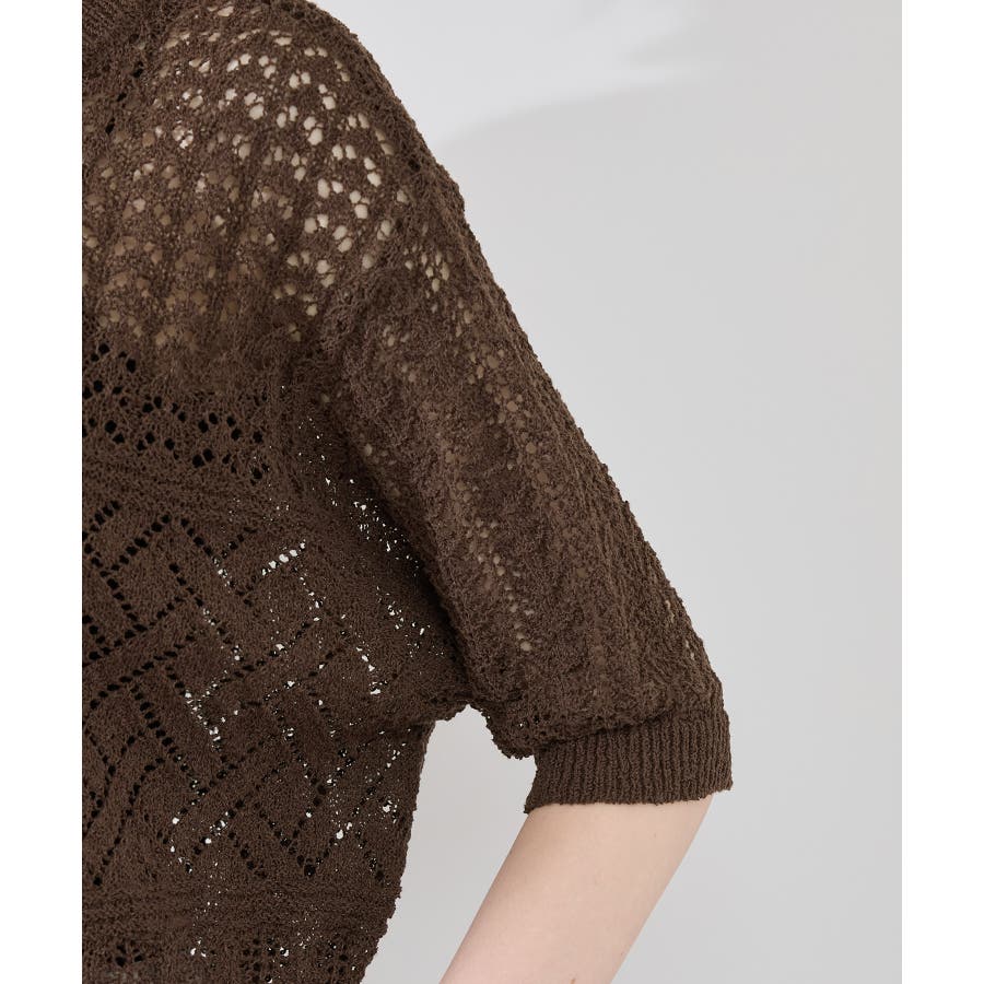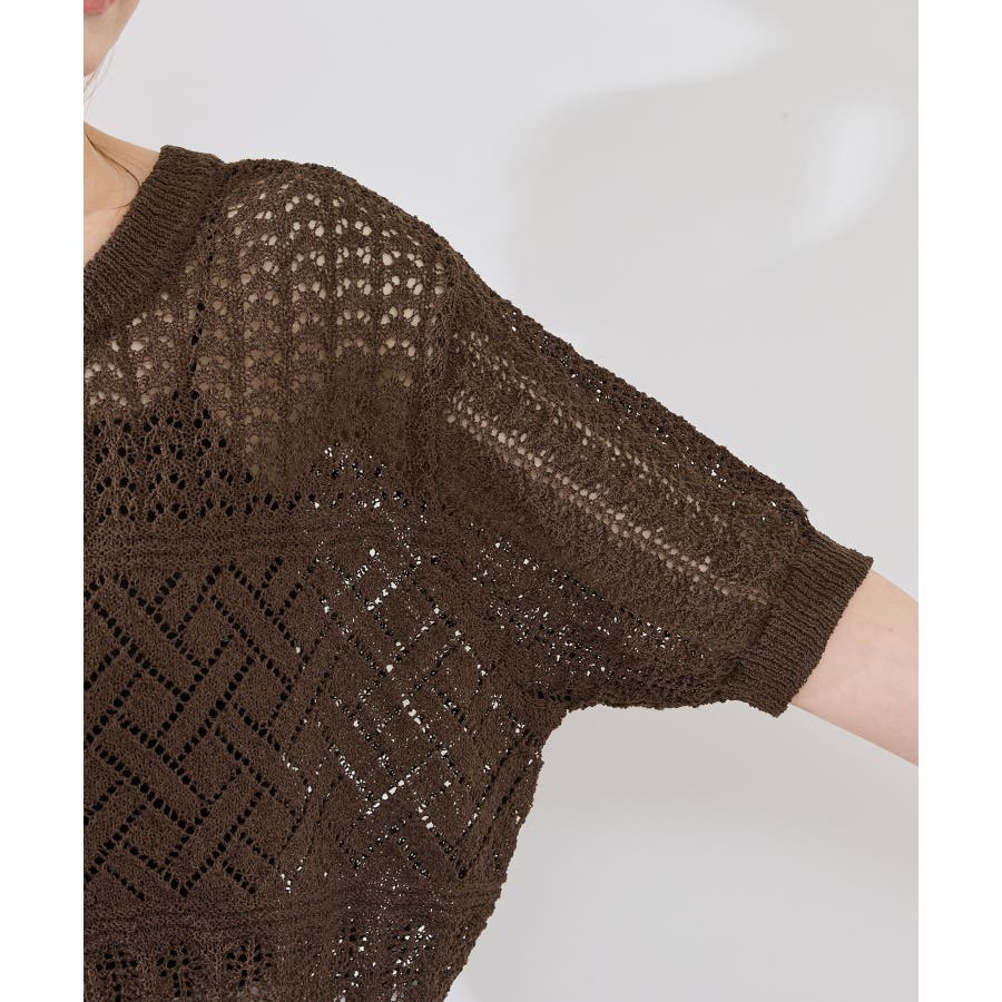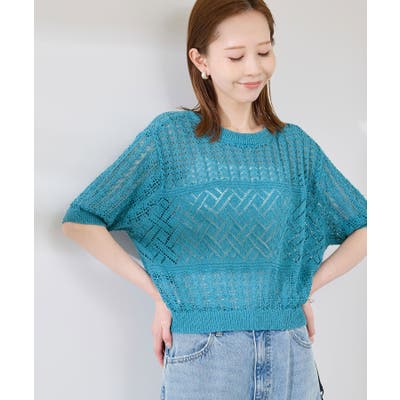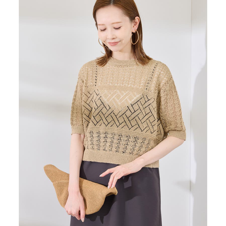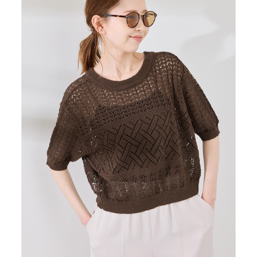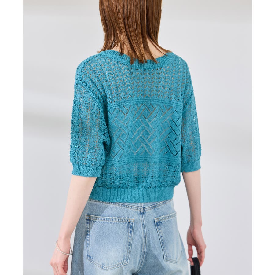 ・涼やかな透かし編みレースの半袖ニットトップス。
