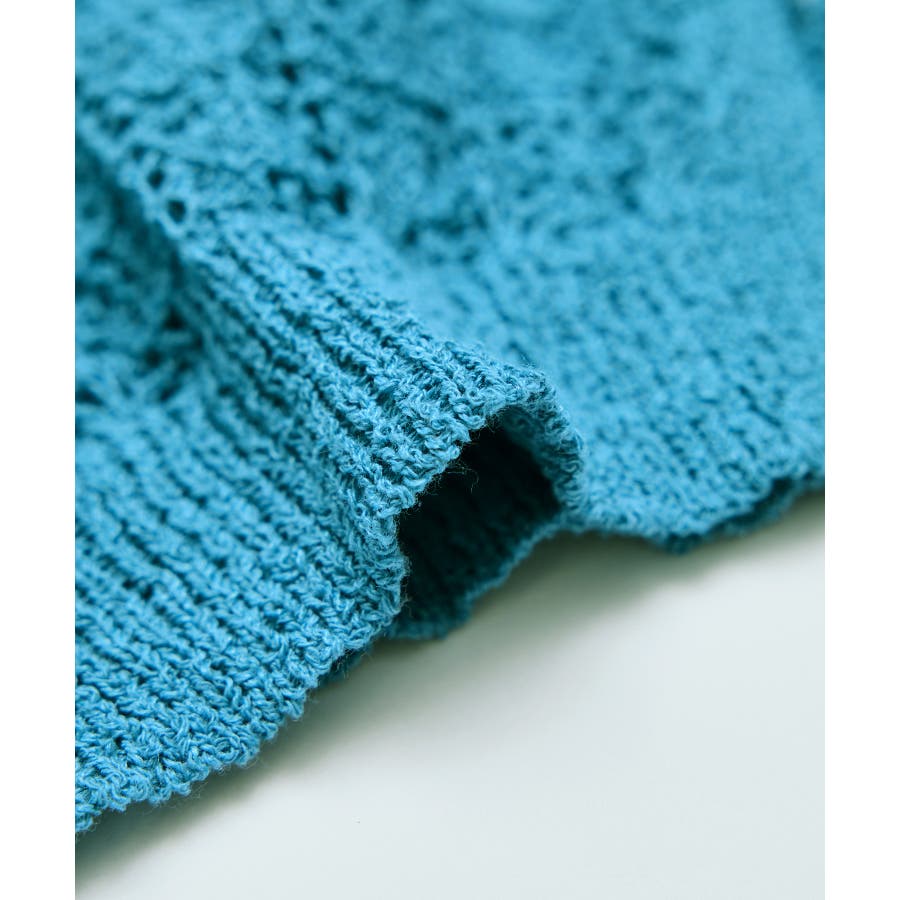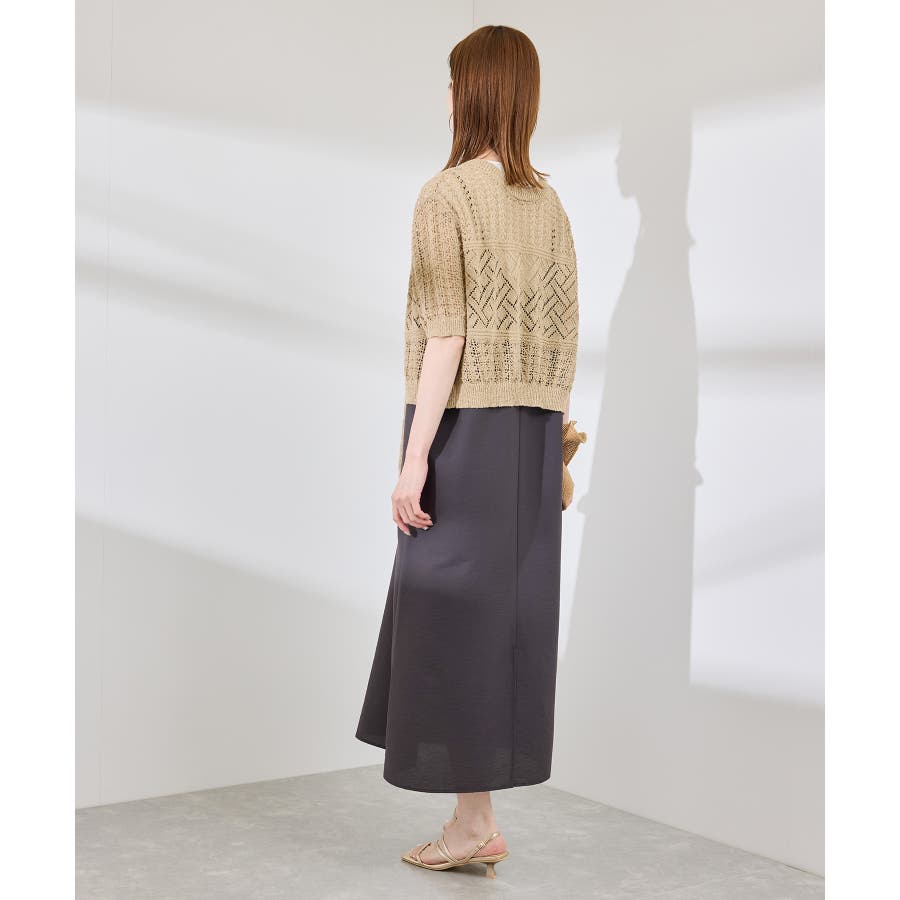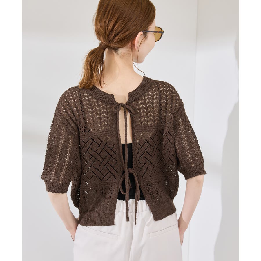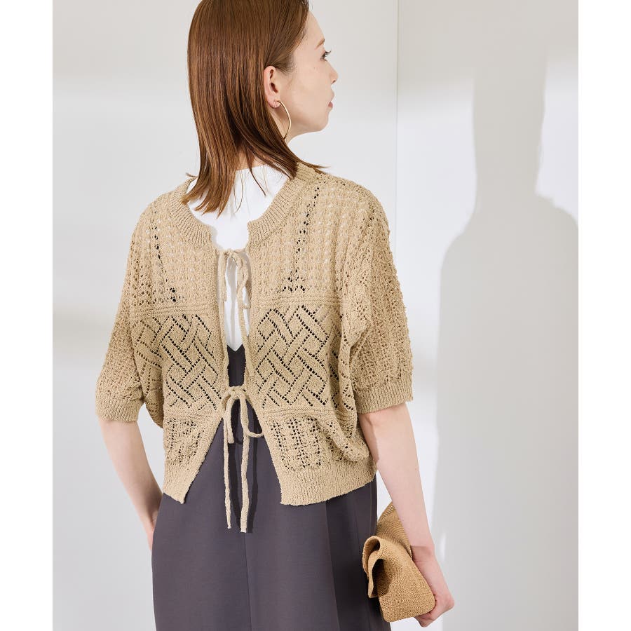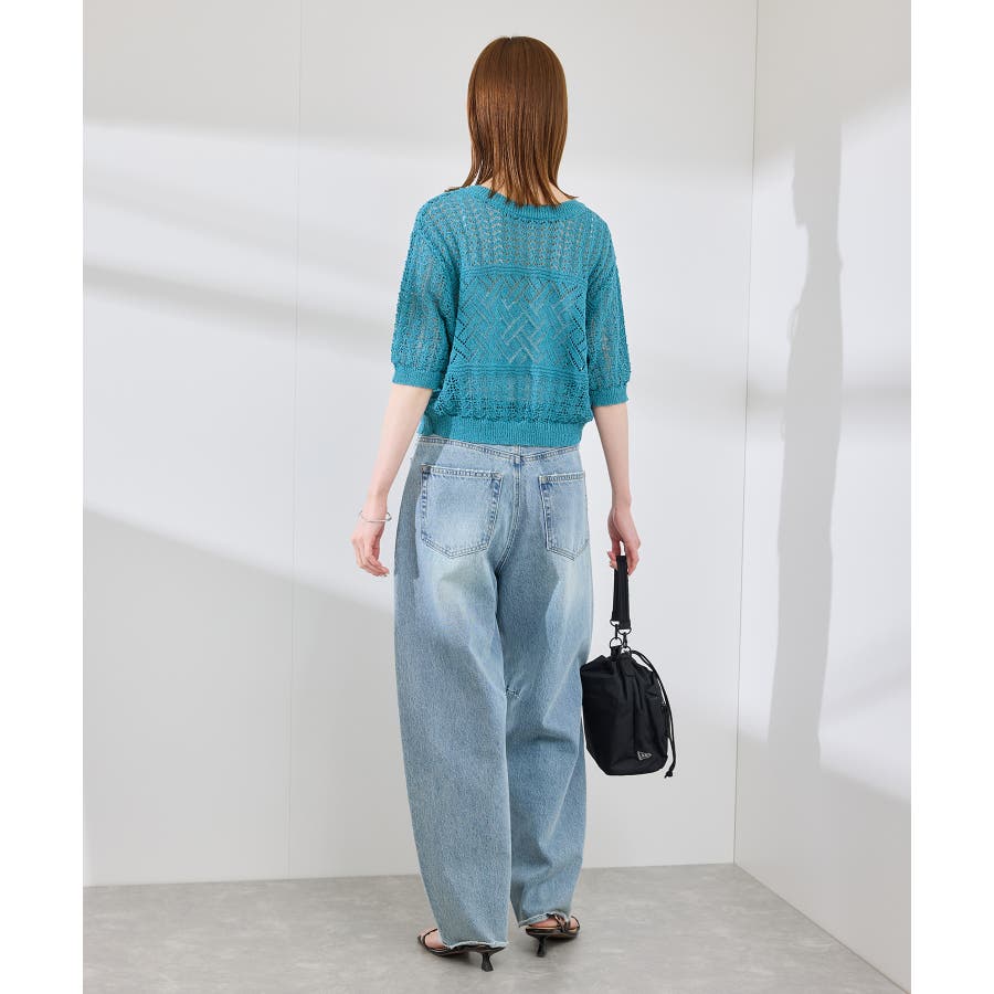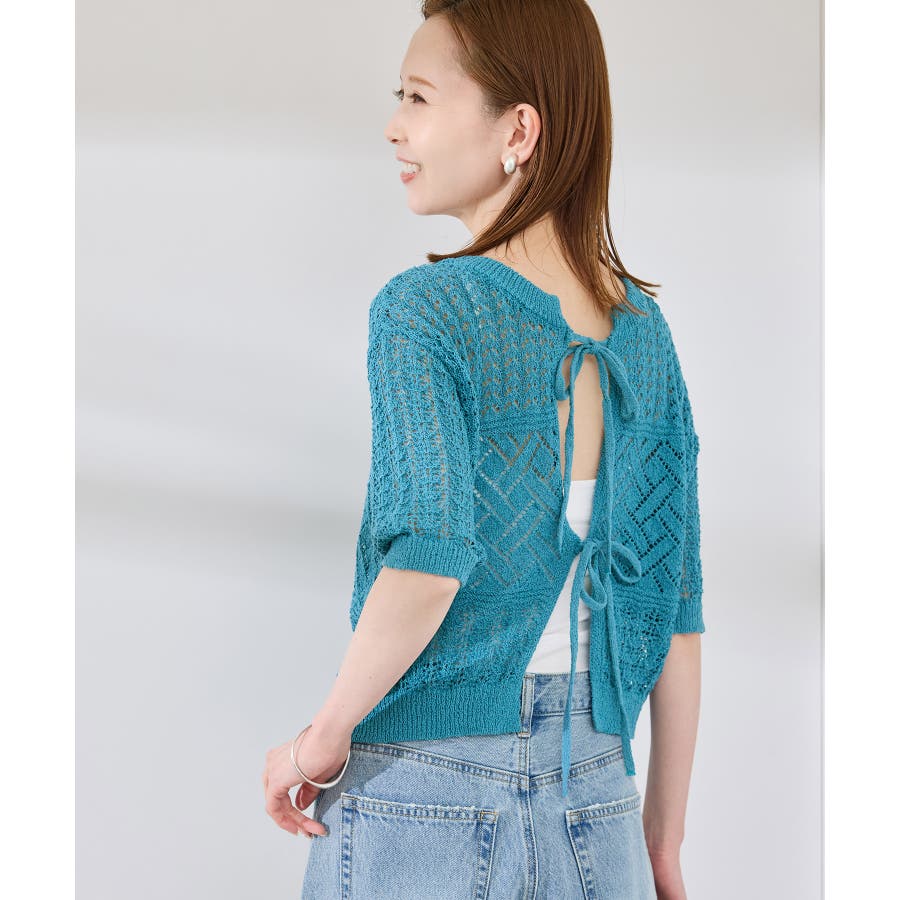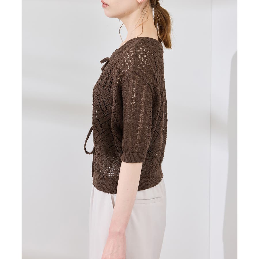 ・涼やかな透かし編みレースの半袖ニットトップス。