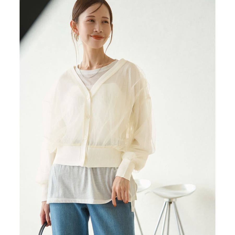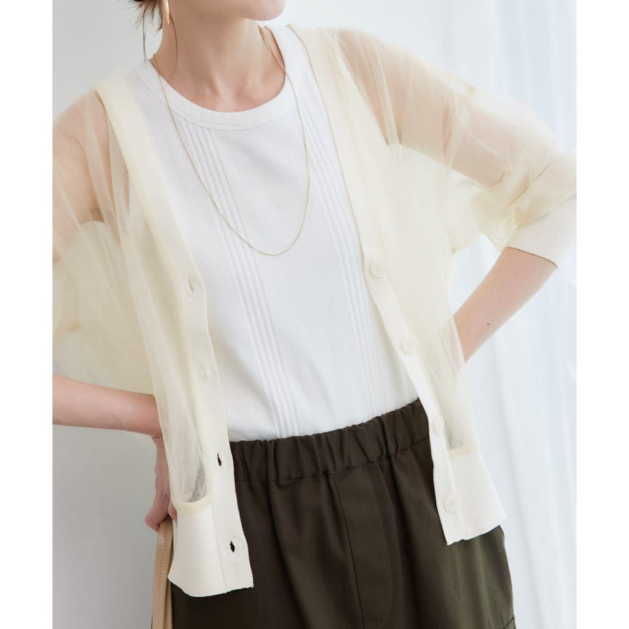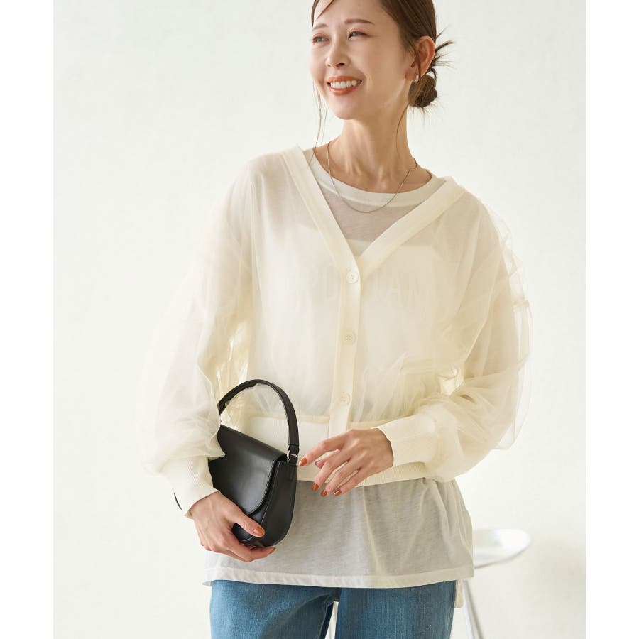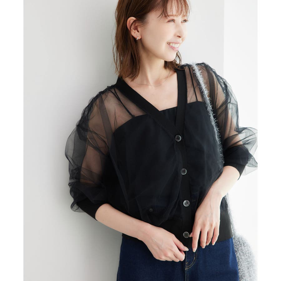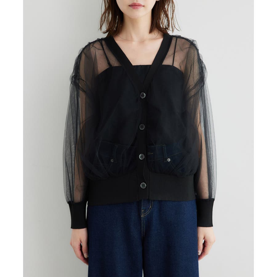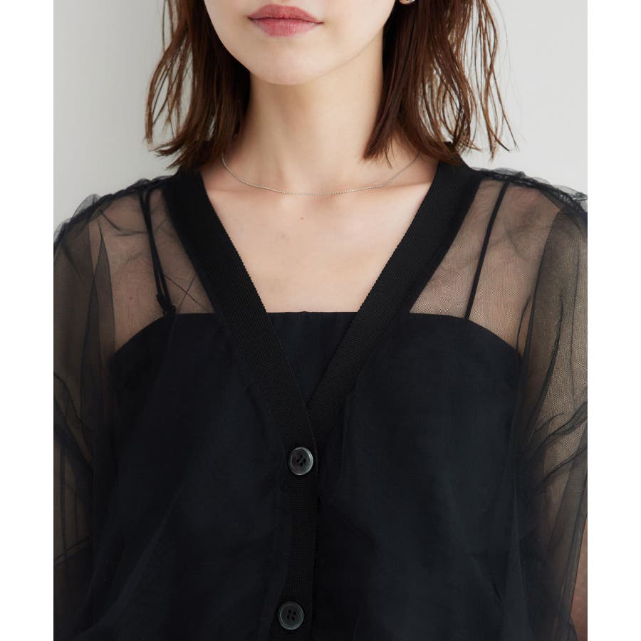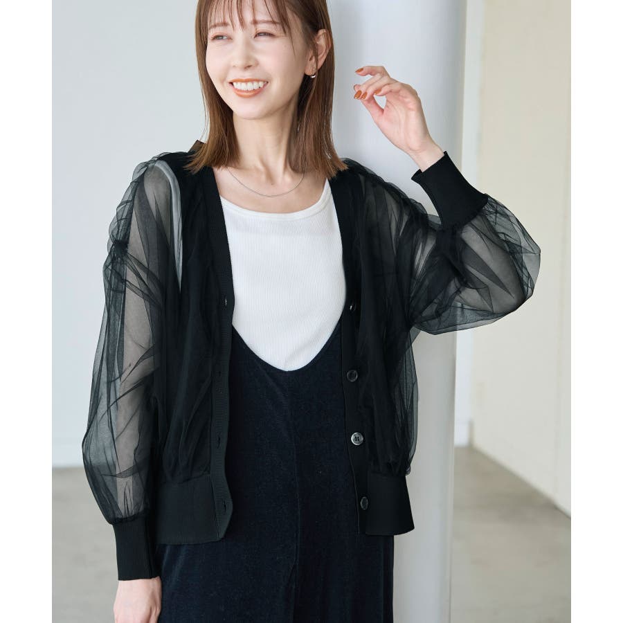 【素材感】 ・シアーなチュール素材の長袖Vネックカーディガン。 【デザイン・シルエット】 ・ふんわりとしたボリュームシルエット。 ・重ね着のしやすいVネックデザイン。 ・袖口、裾のリブ切り替えですっきり。 【カラー】 ・ブラック、アイボリーのモノクロカラーを2色展開。 【スタイリングポイント】 ・タンクトップやキャミソールにさらりと羽織って大人見え。 ・柄物ワンピースの羽織にもおすすめ。 ・カジュアルなロゴTシャツもベストマッチ。 ----------------------------- 裏地:なし 透け感:あり 伸縮性:なし 生地感・厚さ:やや薄手 ポケット:なし 季節:秋・春 ----------------------------- ※撮影時の光、お使いのモニター環境によって色の見え方が違う場合がございます。 ※モデル身長:165cm 着用サイズ:38
