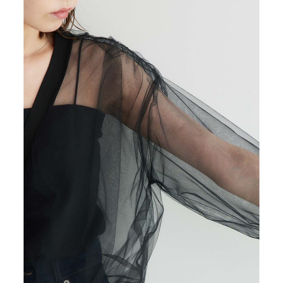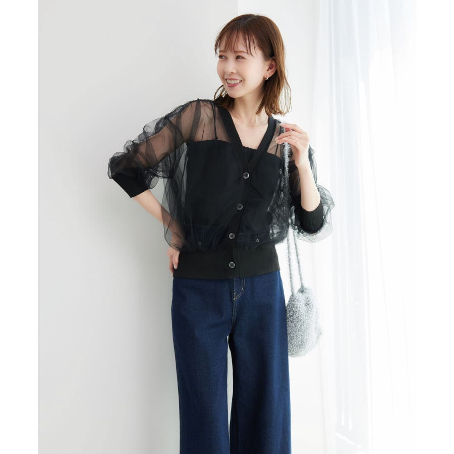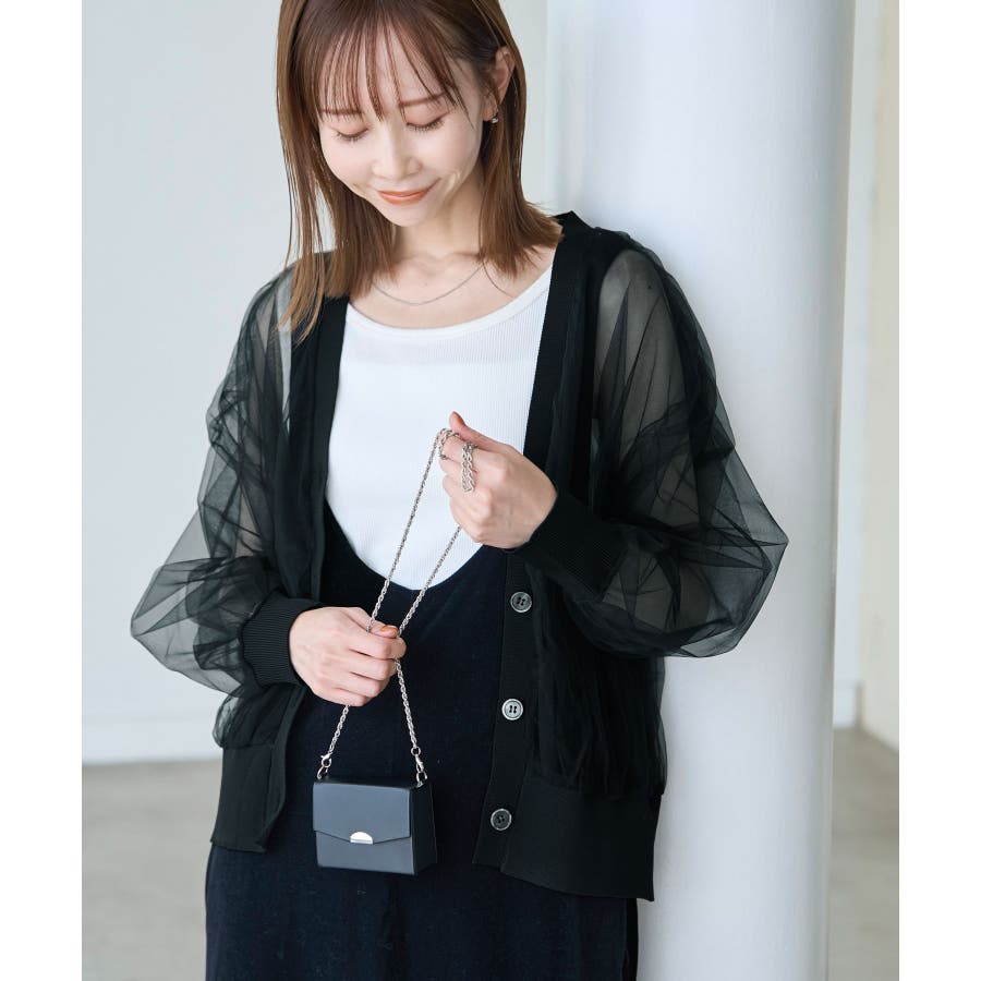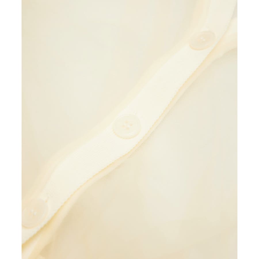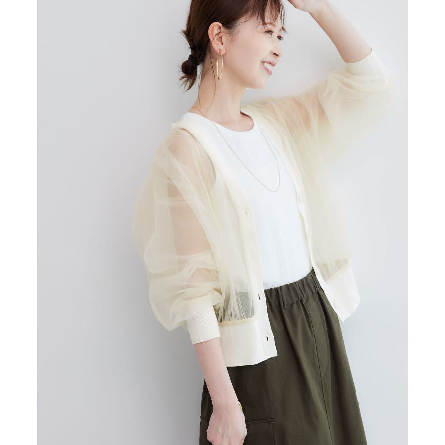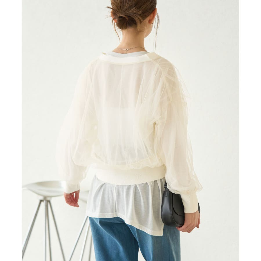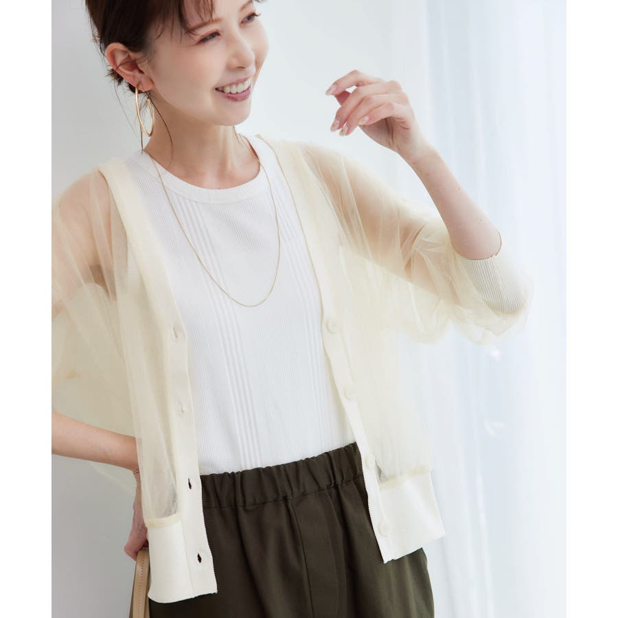 【素材感】 ・シアーなチュール素材の長袖Vネックカーディガン。 【デザイン・シルエット】 ・ふんわりとしたボリュームシルエット。 ・重ね着のしやすいVネックデザイン。 ・袖口、裾のリブ切り替えですっきり。 【カラー】 ・ブラック、アイボリーのモノクロカラーを2色展開。 【スタイリングポイント】 ・タンクトップやキャミソールにさらりと羽織って大人見え。 ・柄物ワンピースの羽織にもおすすめ。 ・カジュアルなロゴTシャツもベストマッチ。 ----------------------------- 裏地:なし 透け感:あり 伸縮性:なし 生地感・厚さ:やや薄手 ポケット:なし 季節:秋・春 ----------------------------- ※撮影時の光、お使いのモニター環境によって色の見え方が違う場合がございます。 ※モデル身長:165cm 着用サイズ:38