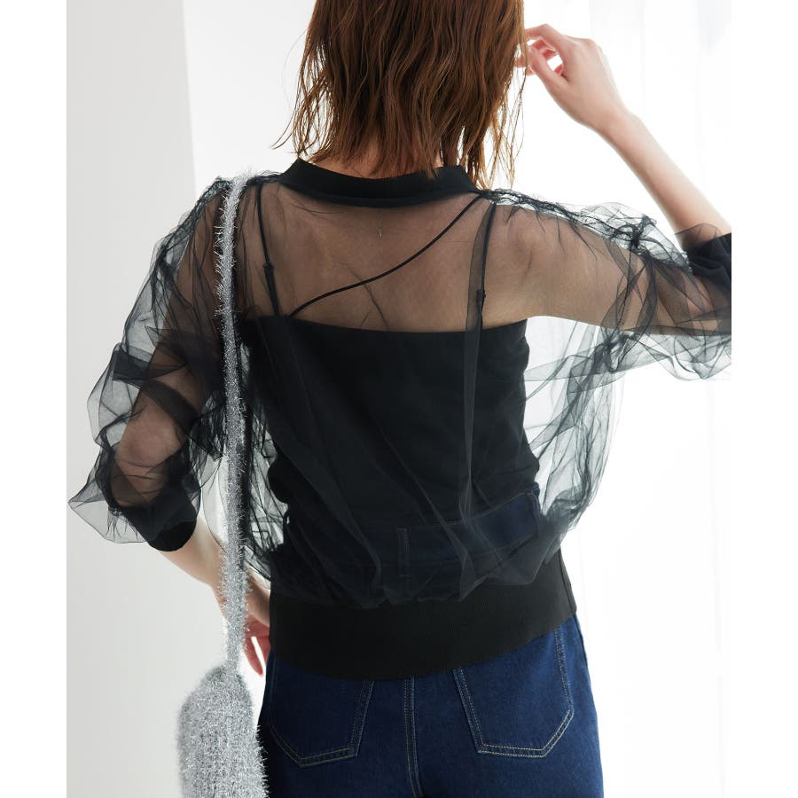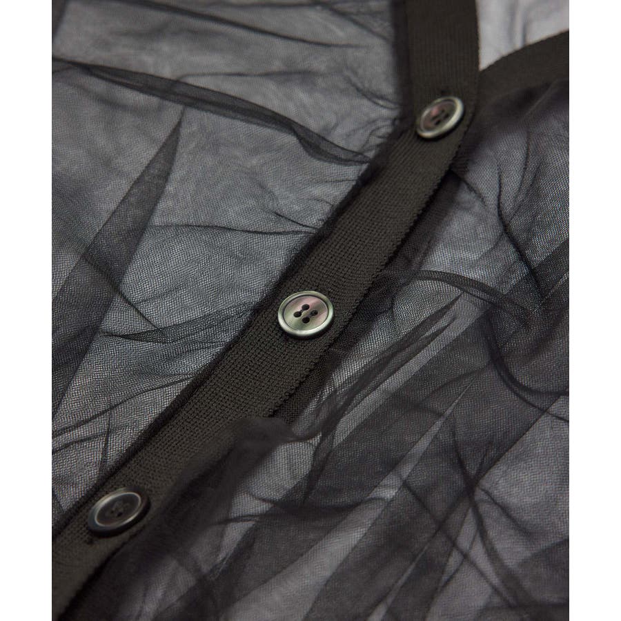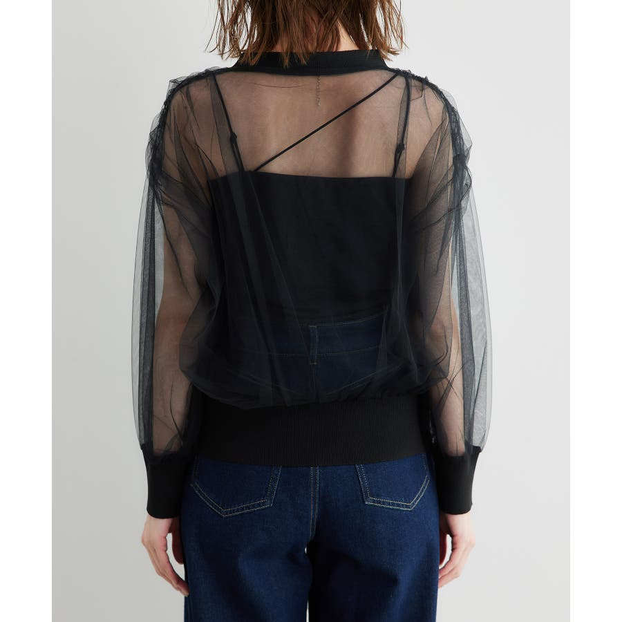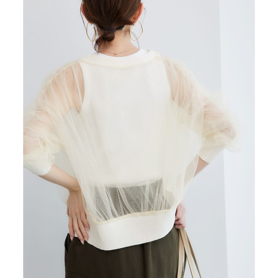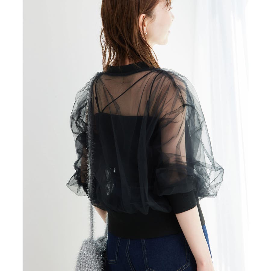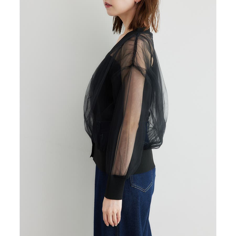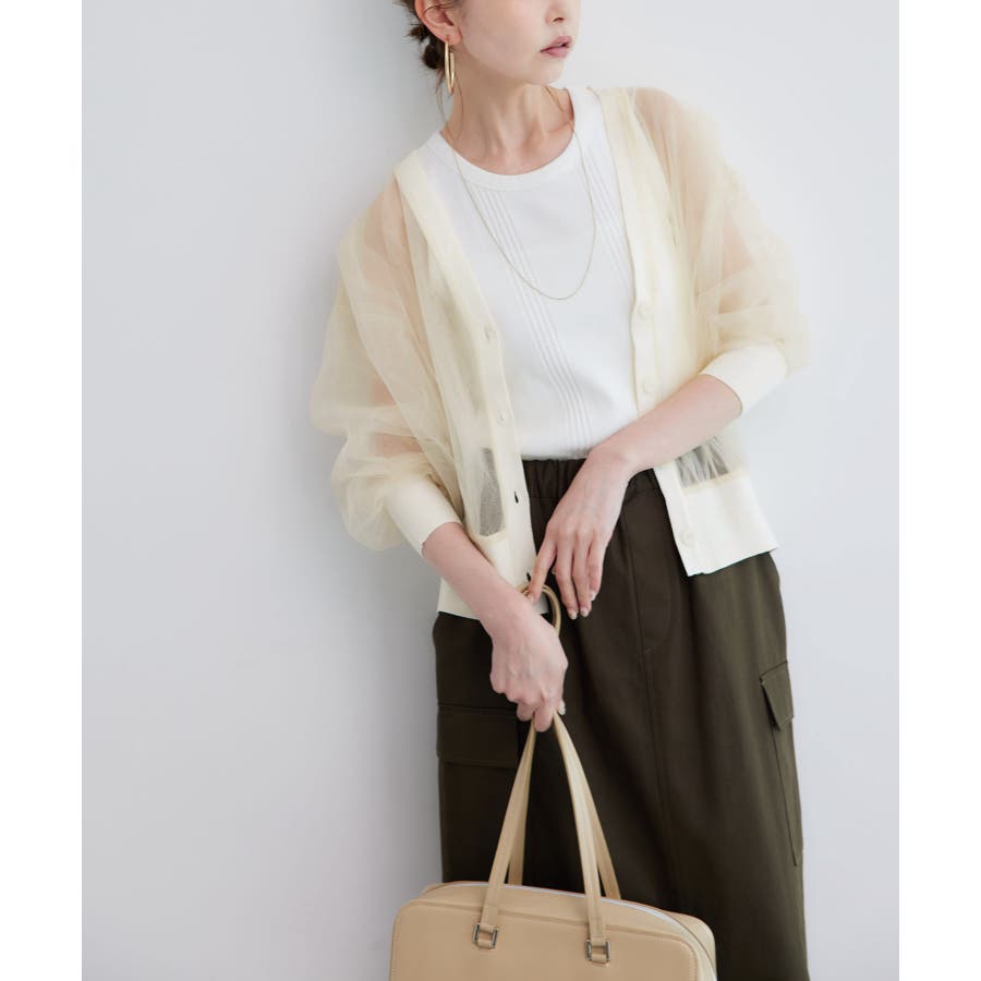 【素材感】 ・シアーなチュール素材の長袖Vネックカーディガン。 【デザイン・シルエット】 ・ふんわりとしたボリュームシルエット。 ・重ね着のしやすいVネックデザイン。 ・袖口、裾のリブ切り替えですっきり。 【カラー】 ・ブラック、アイボリーのモノクロカラーを2色展開。 【スタイリングポイント】 ・タンクトップやキャミソールにさらりと羽織って大人見え。 ・柄物ワンピースの羽織にもおすすめ。 ・カジュアルなロゴTシャツもベストマッチ。 ----------------------------- 裏地:なし 透け感:あり 伸縮性:なし 生地感・厚さ:やや薄手 ポケット:なし 季節:秋・春 ----------------------------- ※撮影時の光、お使いのモニター環境によって色の見え方が違う場合がございます。 ※モデル身長:165cm 着用サイズ:38