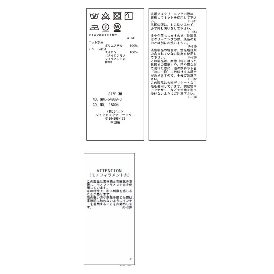 素材 | ブラック(01):(ニット部分) ポリエステル 100% (チュール部分) ナイロン 100% (ナイロンモノフィラメント糸使用)|キナリ(16):(ニット部分) ポリエステル 100% (チュール部分) ナイロン 100% (ナイロンモノフィラメント糸使用) |