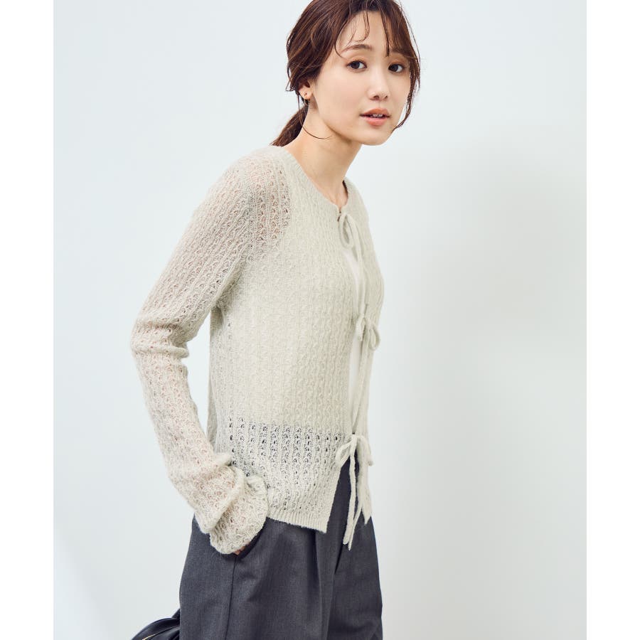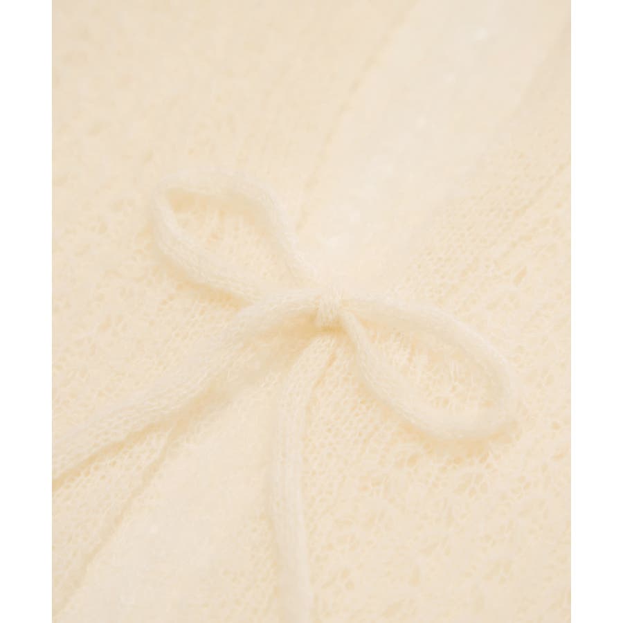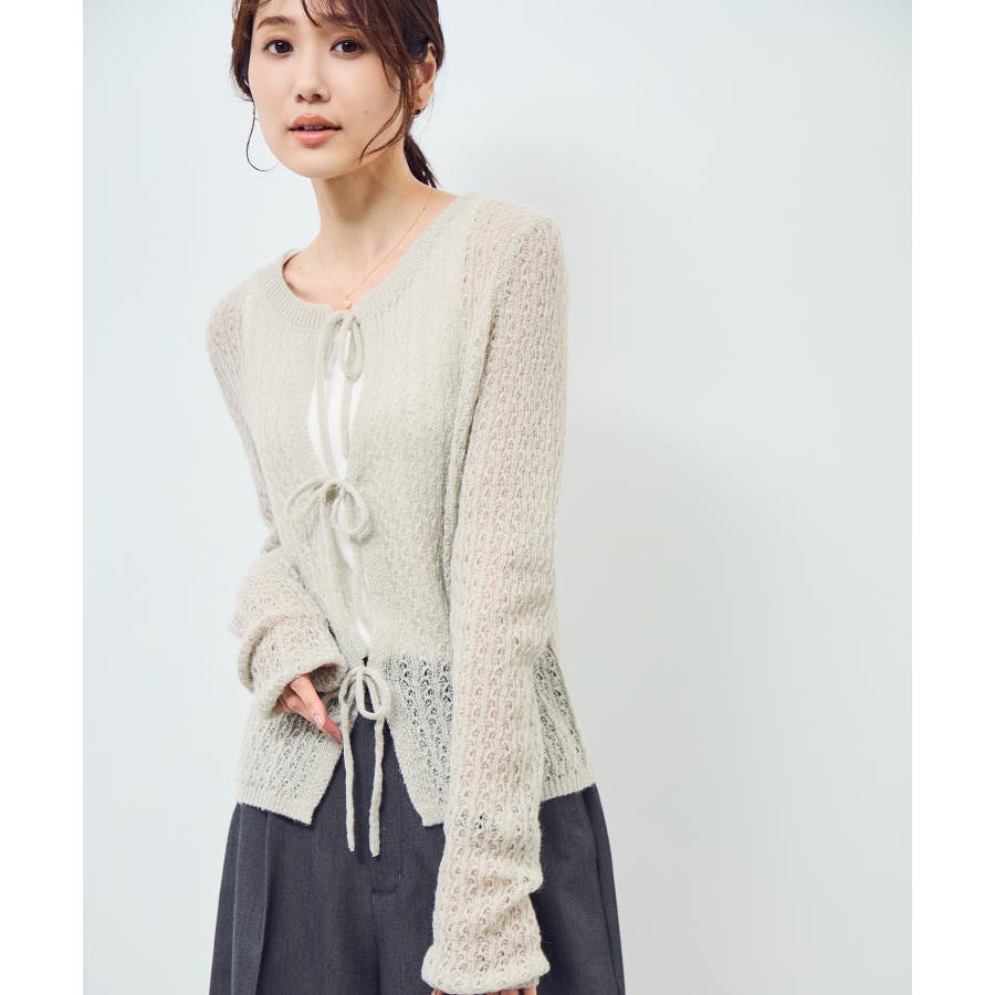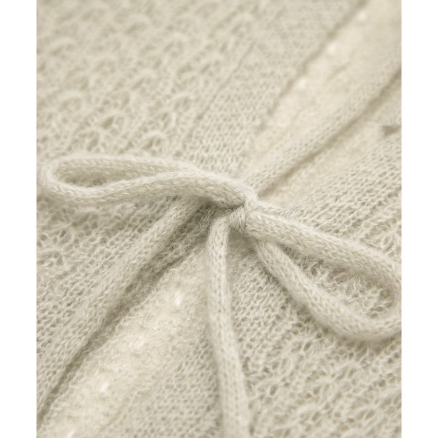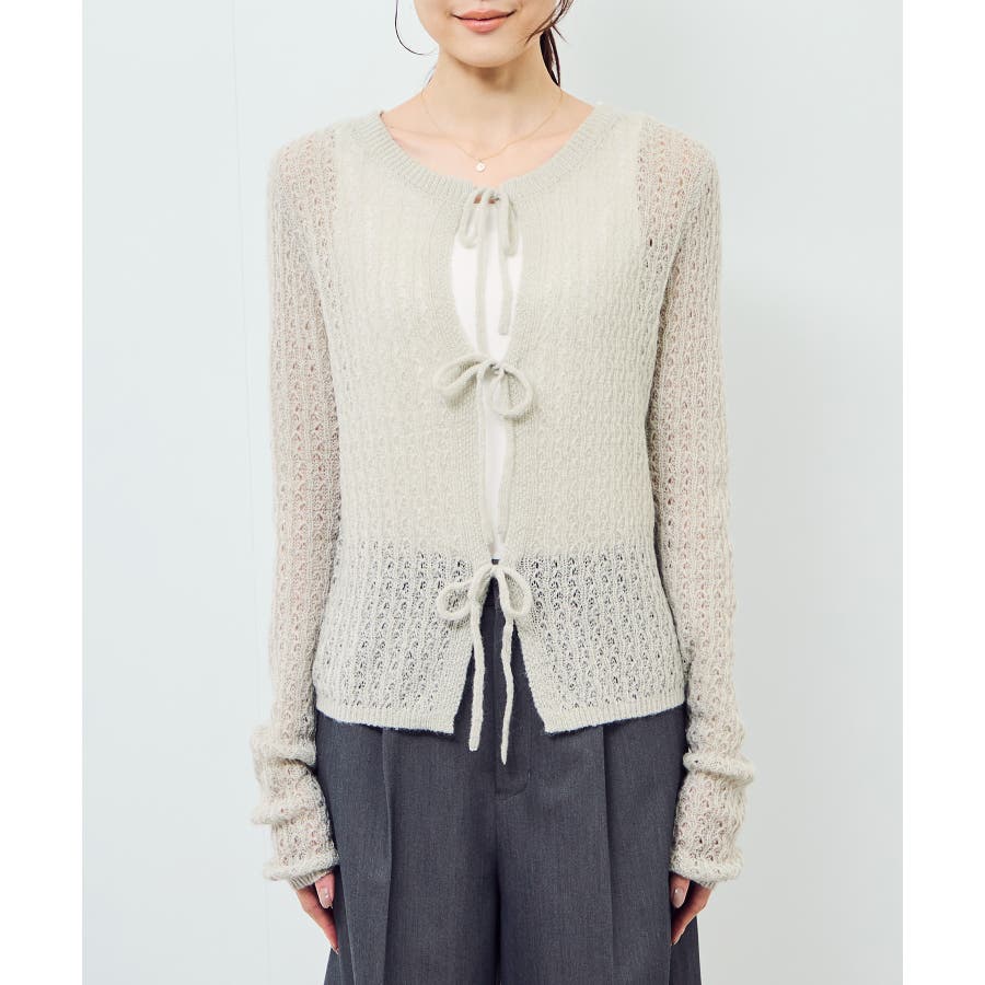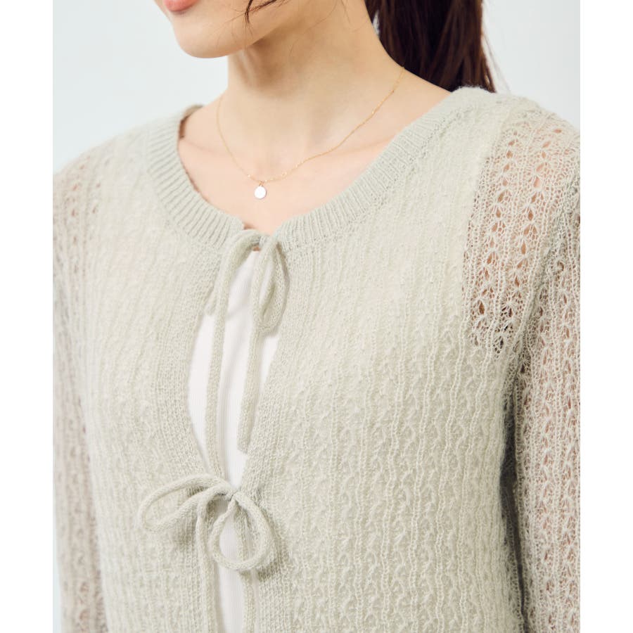 ・フロントに3つリボンが並んだ、長袖のメッシュニットカーディガン。
