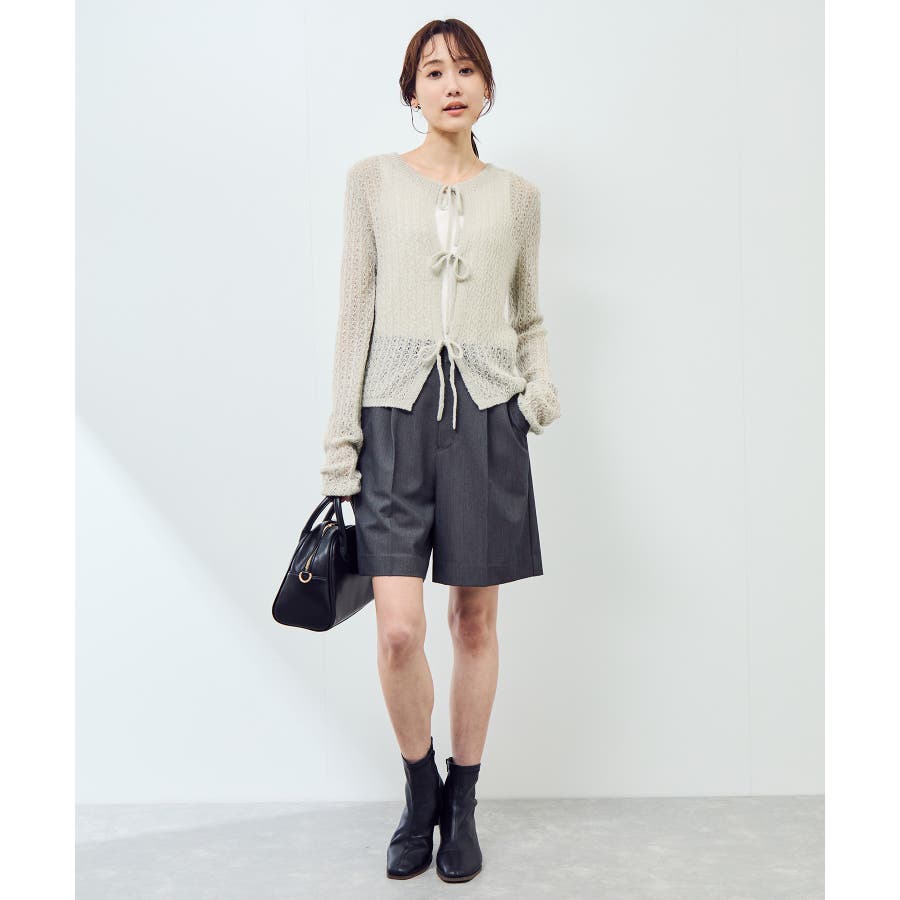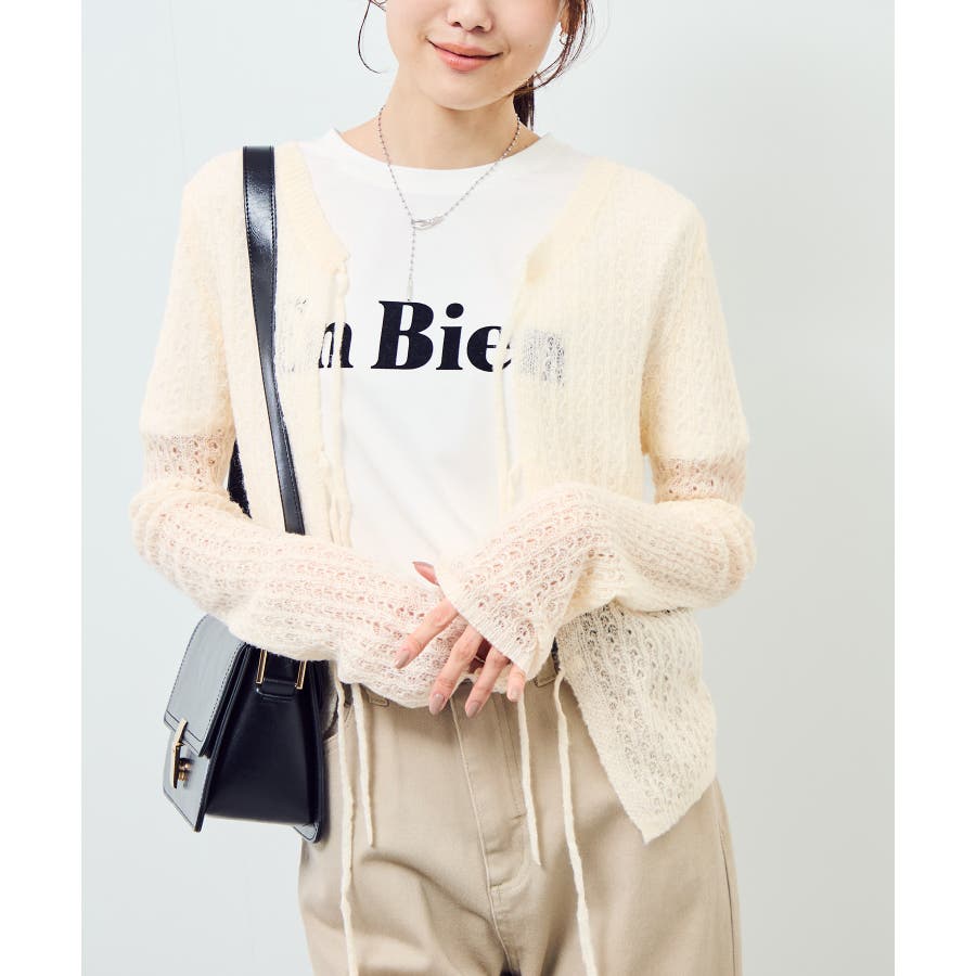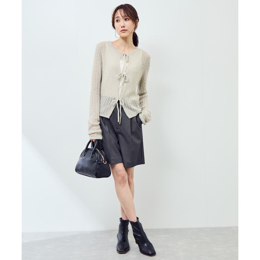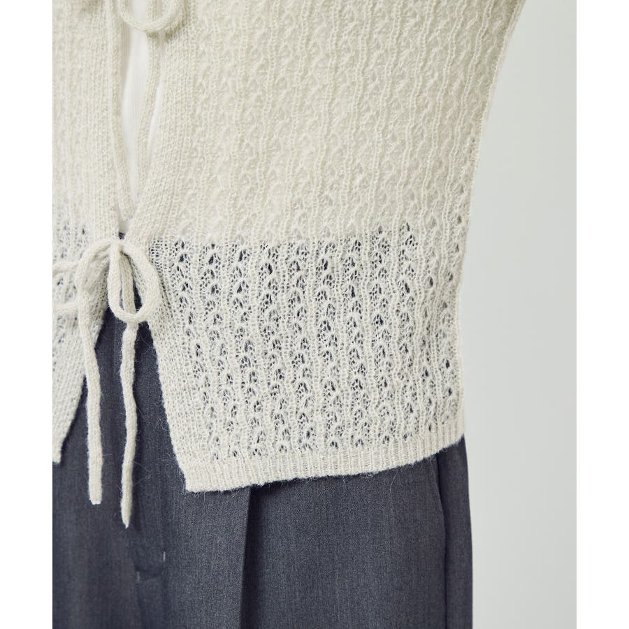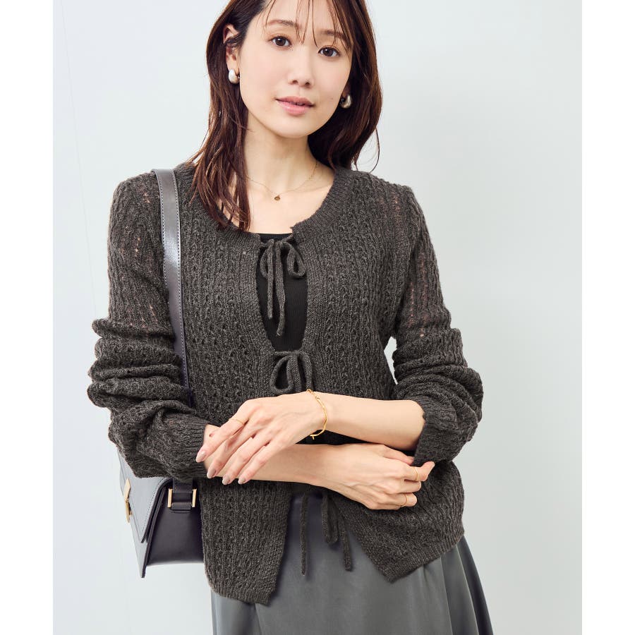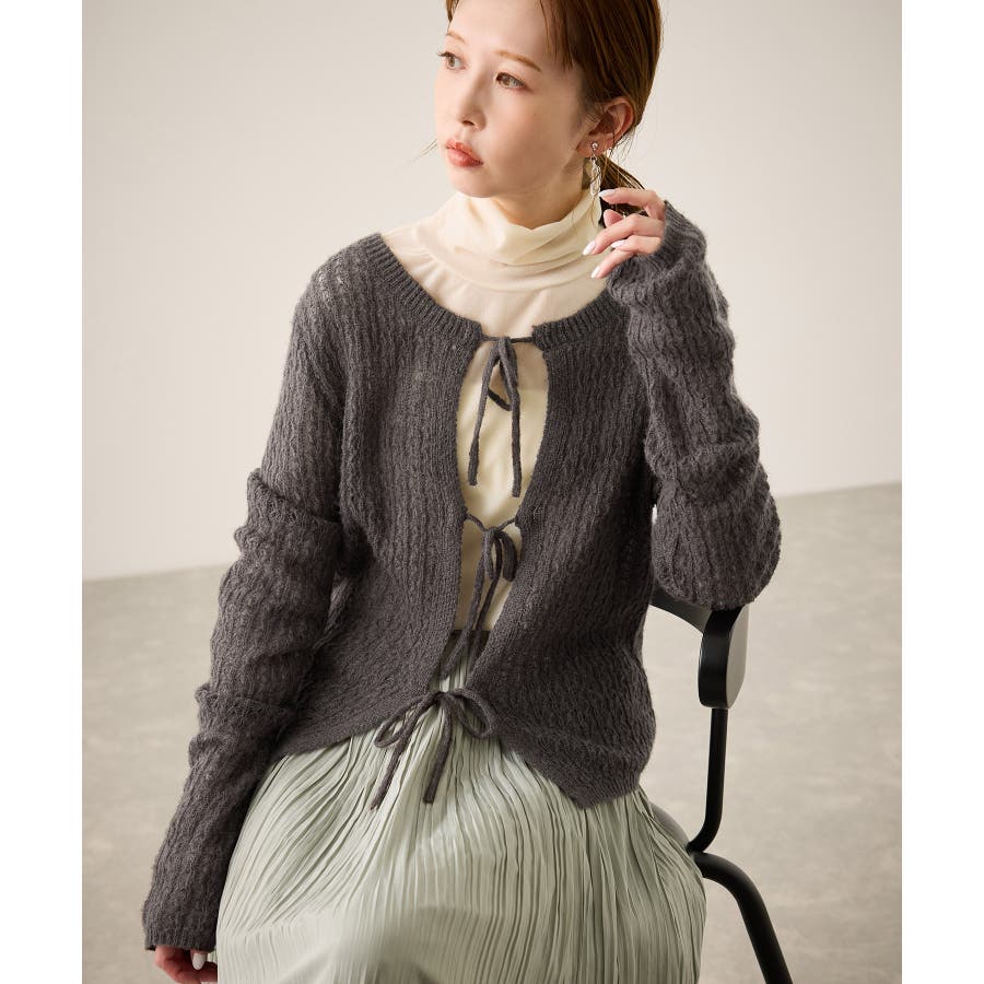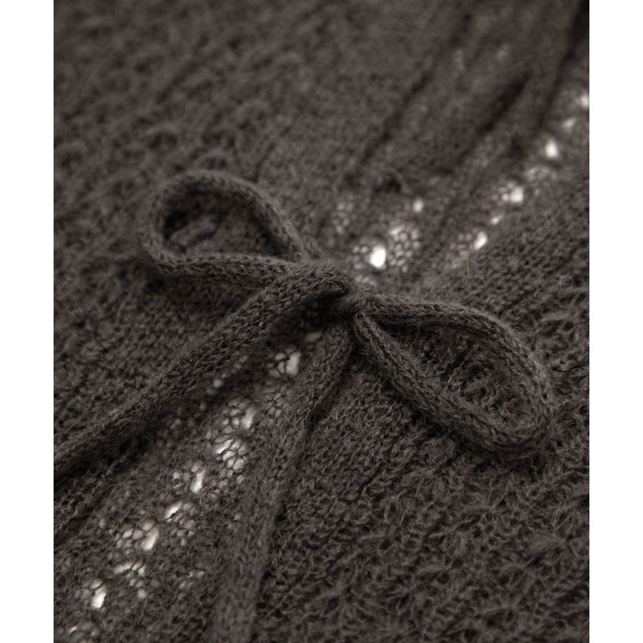 ・フロントに3つリボンが並んだ、長袖のメッシュニットカーディガン。