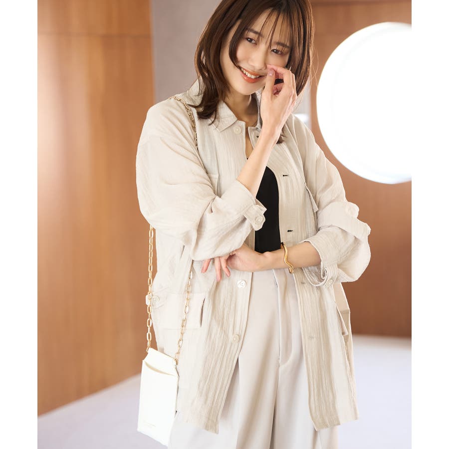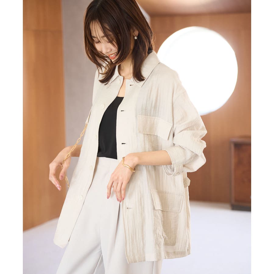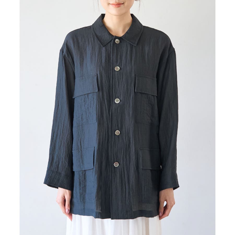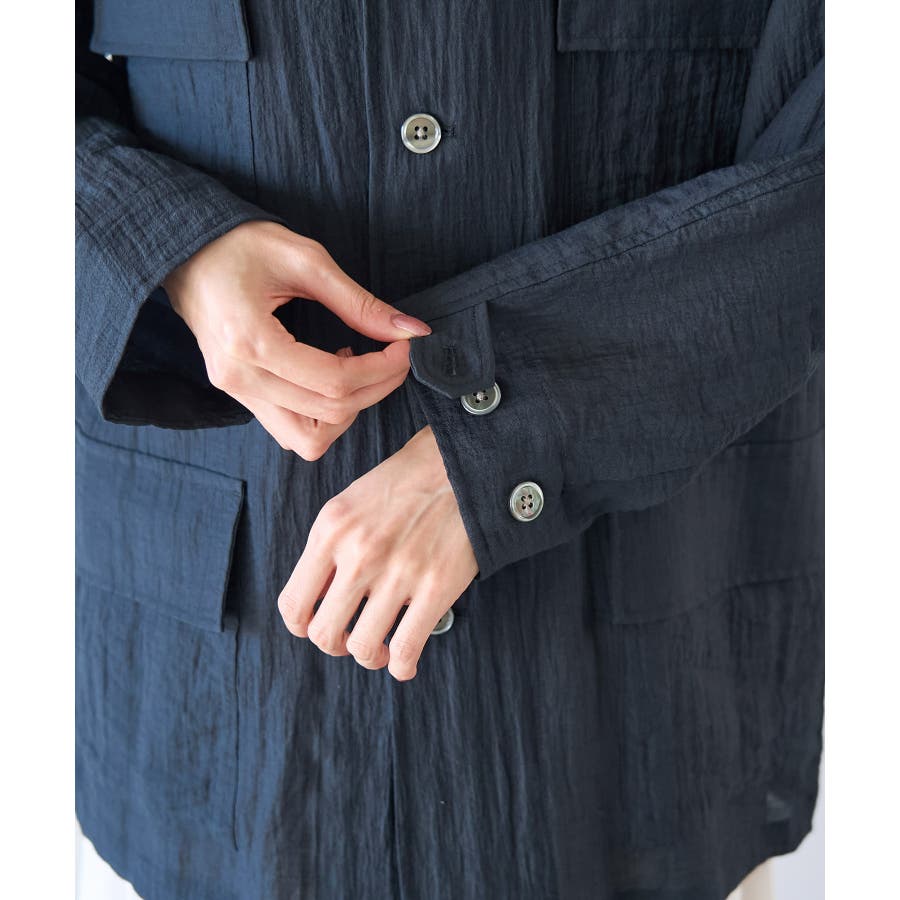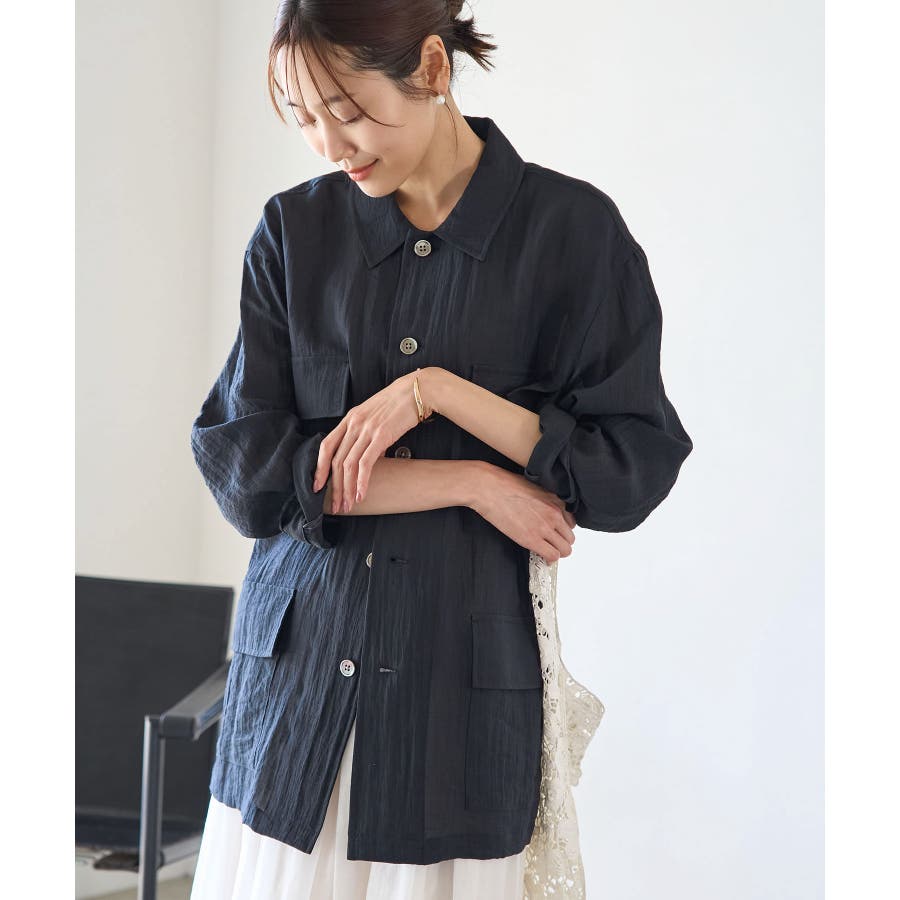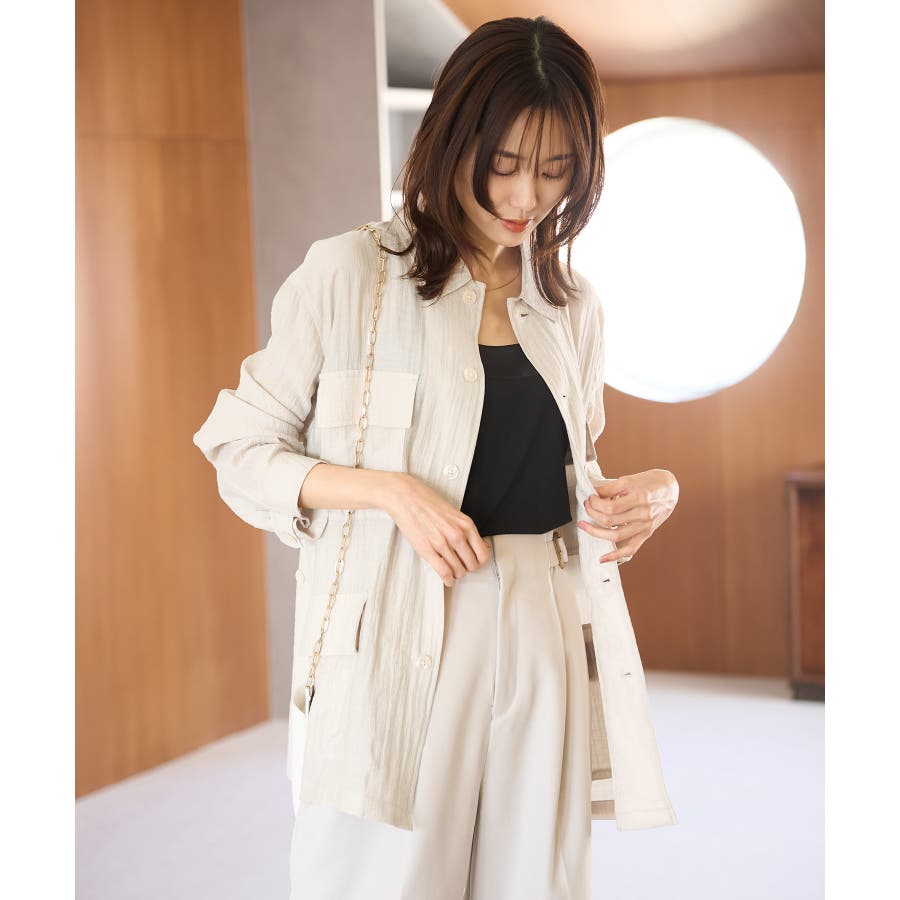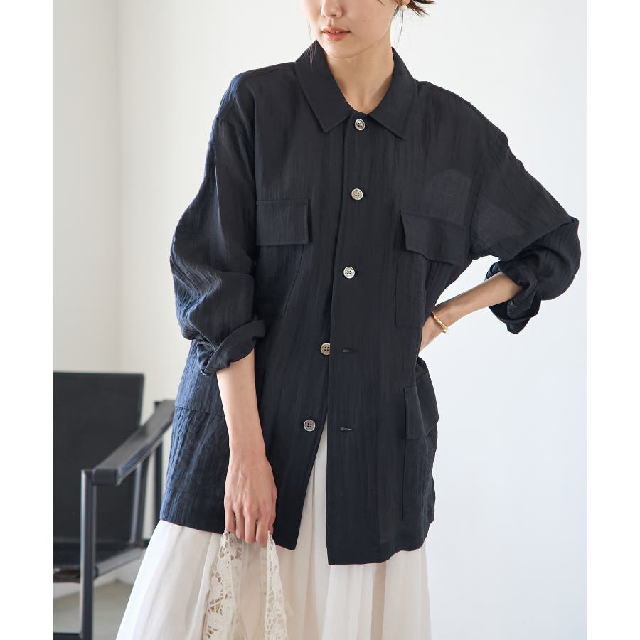 【素材感】 ・ナチュラルな光沢感、シアー感、ワッシャー感が今年っぽいミリタリーデザイン。 【デザイン・シルエット】 ・縦に2つ並んだ、4つのフラップポケットがポイント。 ・ミリタリーエッセンスが手軽に楽しめるライトブルゾン。 ・ウエストと袖口はボタンでアジャスト可能。 ・肩の切り替えを落としたリラックスフォルム。 【カラー】 ・ブラック、オフホワイト、ベージュのベーシックカラー3色展開。 【スタイリングポイント】 ・レースブラウスや、フラワープリントワンピースなど、甘めなウェアに羽織ってもおしゃれ。 ・オフホワイトは、カーキのボトムを合わせるとメリハリが出る。 ----------------------------- 裏地:なし 透け感:オフホワイト(15)、ベージュ(27)はややあり 伸縮性:なし 生地感・厚さ:やや薄手 ポケット:あり 季節:春・秋 ----------------------------- ※撮影時の光、お使いのモニター環境によって色の見え方が違う場合がございます。 ※モデル身長:165cm 着用サイズ:38