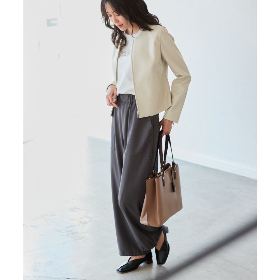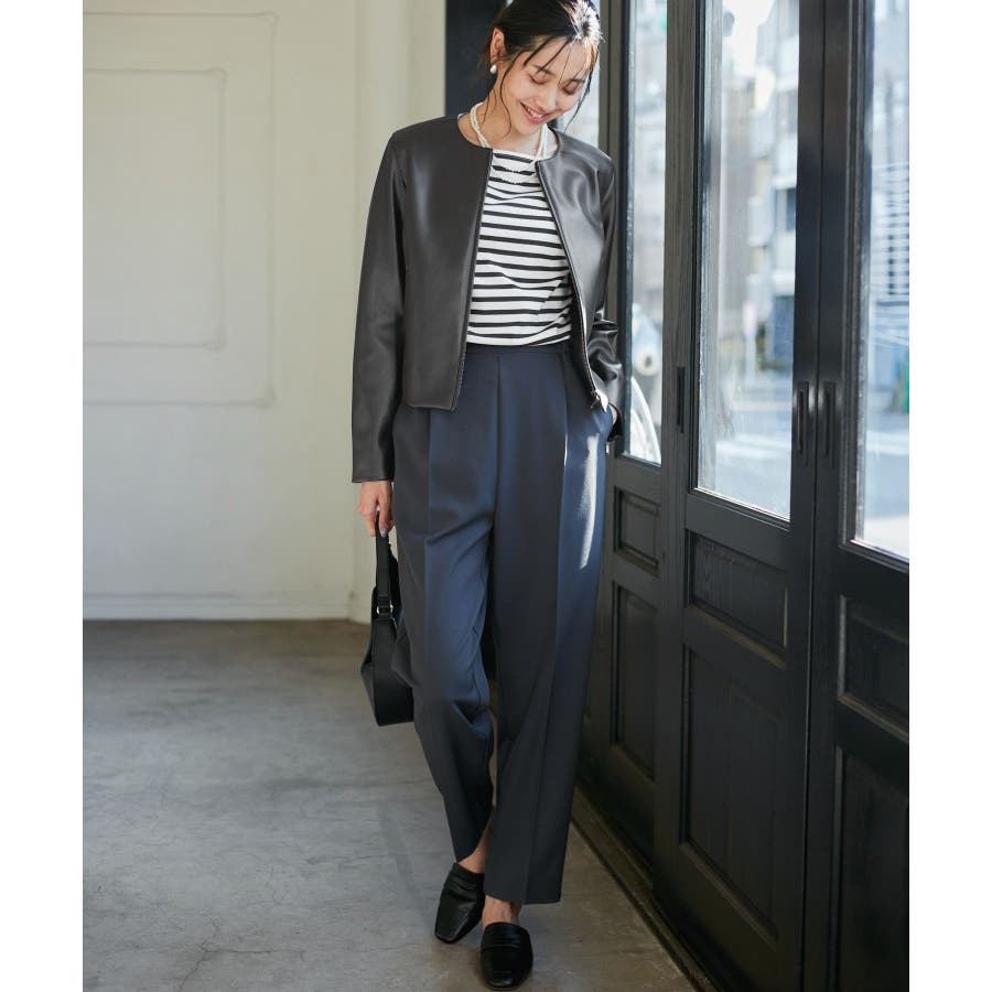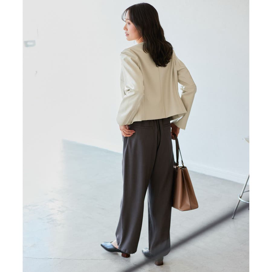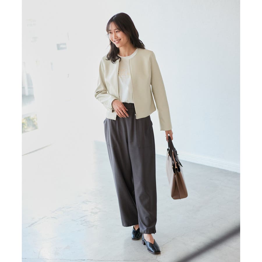 【素材感】 ・本革のようなナチュラルなツヤ感と柔らかな風合いの素材。 ・表地裏側は再生ポリエステルを使用。 ・花粉が付着しにくく、落としやすい。 【デザイン・シルエット】 ・シンプルで汎用性の高いノーカラーデザイン。 ・身頃は切り替えで、余りのでないすっきりシルエットに。 ・袖先はファスナー開閉でアレンジ可能。 【カラー】 ・ブラック、ベージュのベーシックカラー3色展開。 【スタイリングポイント】 ・寒い春先にはタートルネックニットを重ねて。 ・きれいめスカートに合わせると、お出かけや通勤にも活躍。 ・プリントスカーフを首もとに巻くとおしゃれ感がアップ。 ----------------------------- 裏地:あり 透け感:なし 伸縮性:なし 生地感・厚さ:やや厚手 ポケット:あり その他仕様:,袖口ファスナー 季節:春・秋 ----------------------------- ※撮影時の光、お使いのモニター環境によって色の見え方が違う場合がございます。 ※前回好評だったノーカラージャケット(品番:GDL54050)と同型ですが、花粉ガード素材に変更しています。 ※モデル身長:165cm 着用サイズ:38