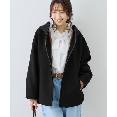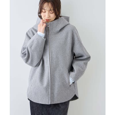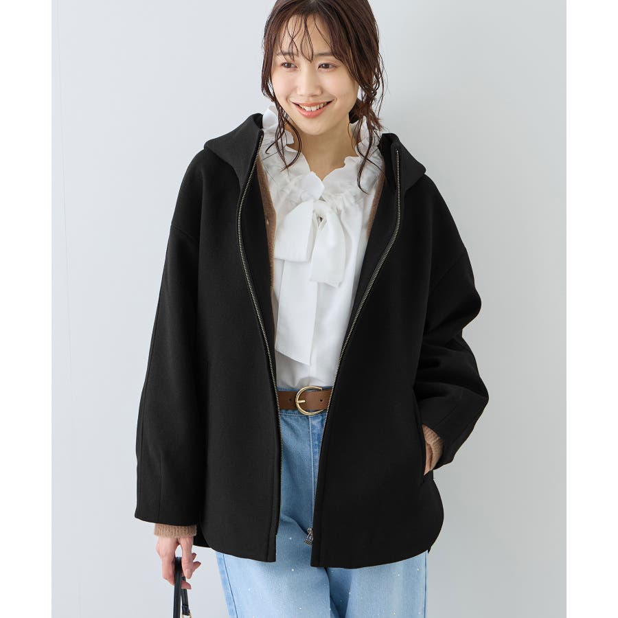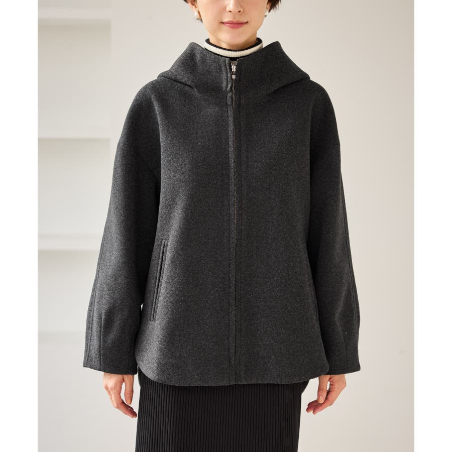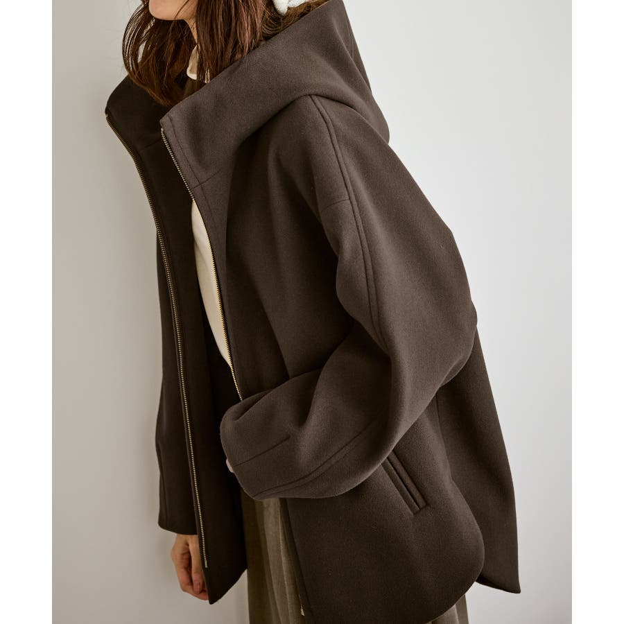 ・スタンド襟からつながる大きめなフードで小顔効果◎。