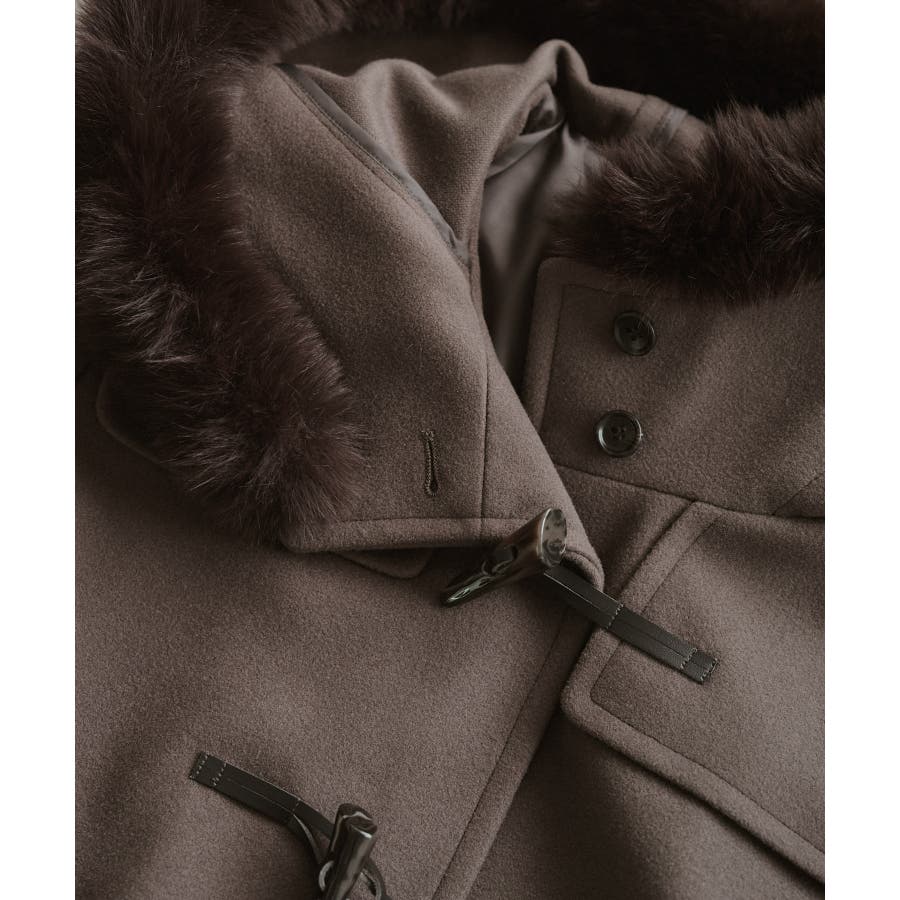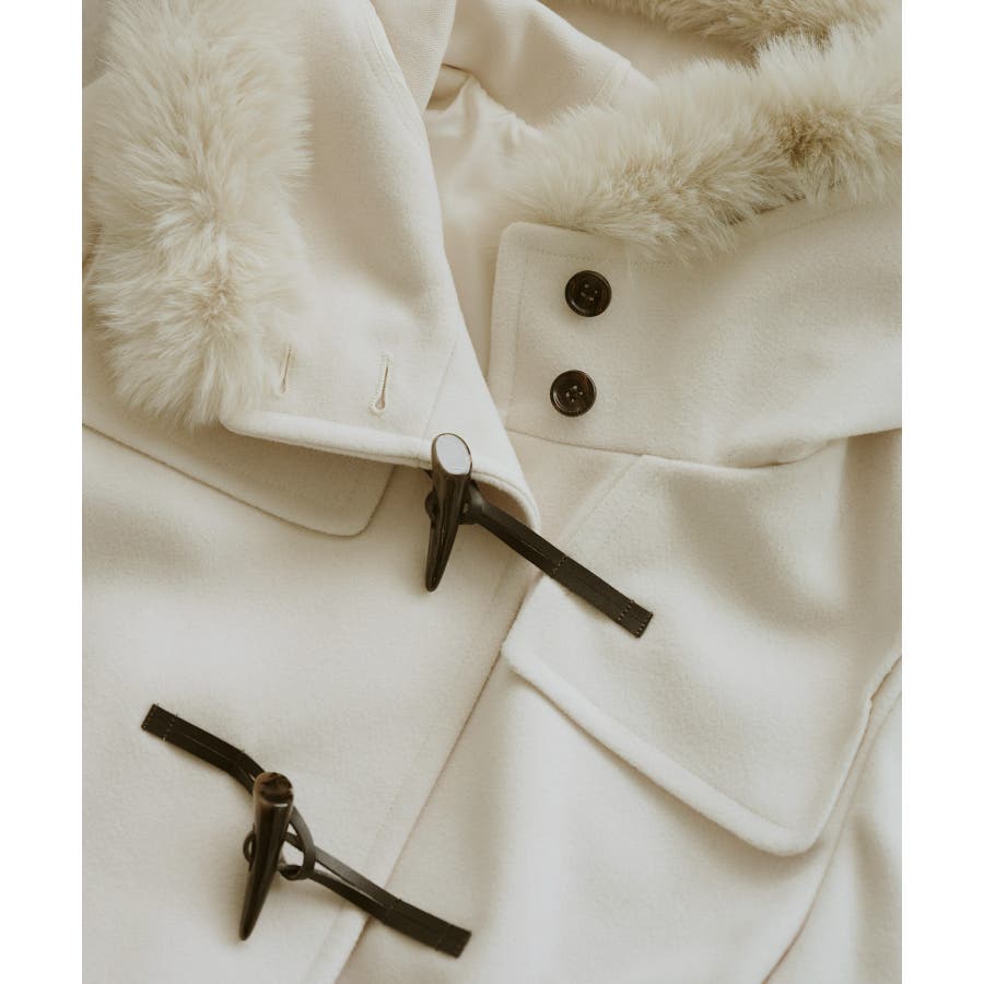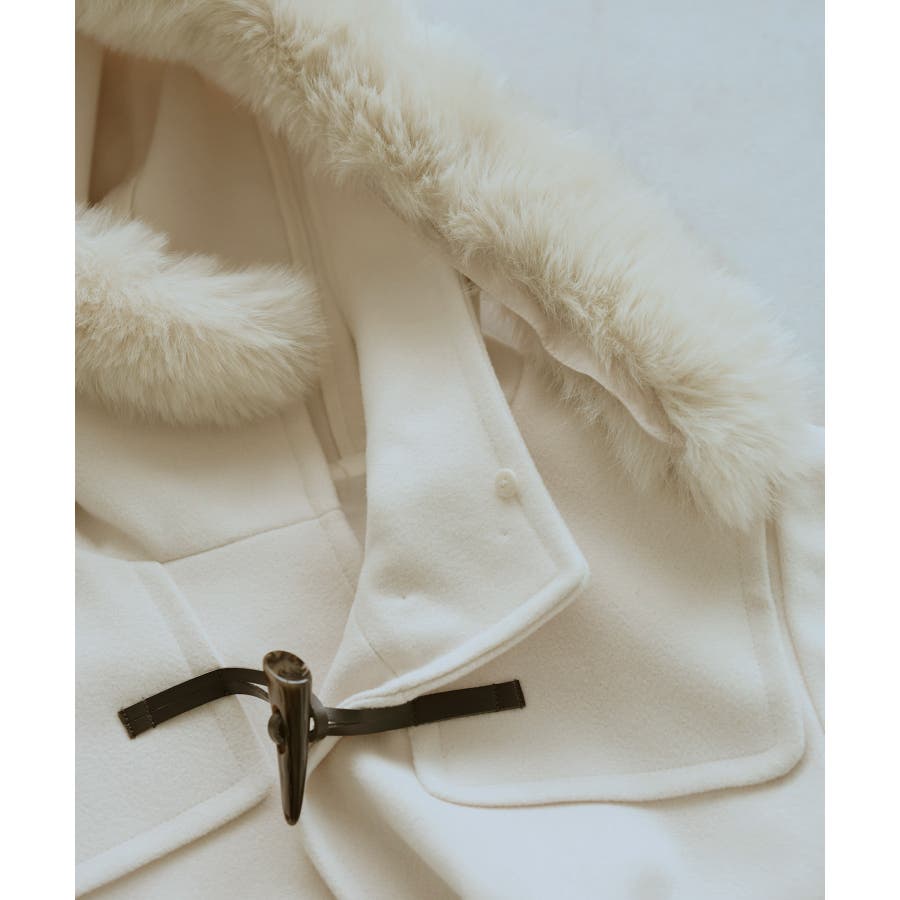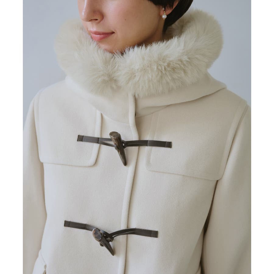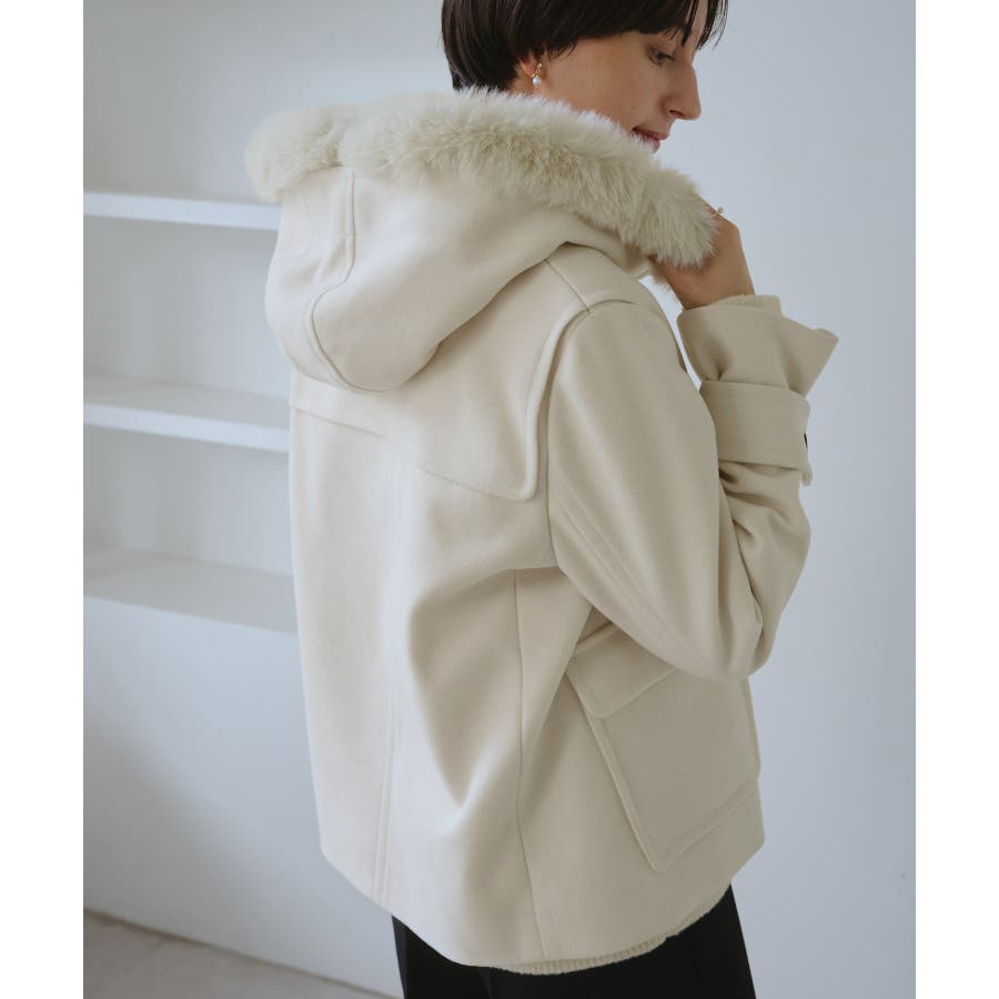 ・フードにたっぷりとファーを飾った、ショート丈のダッフルコート。