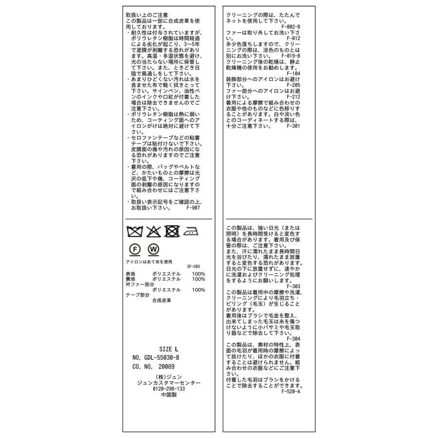 | 素材 | (表地) ポリエステル 100% (裏地) ポリエステル 100% (衿ファー部分) ポリエステル 100% (テープ部分) 合成皮革 |