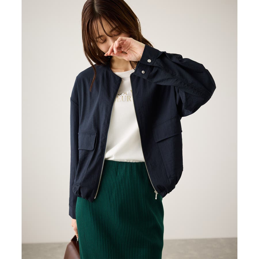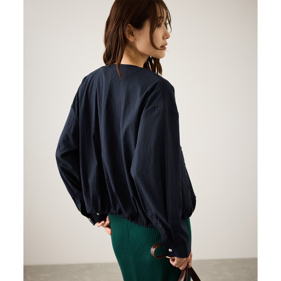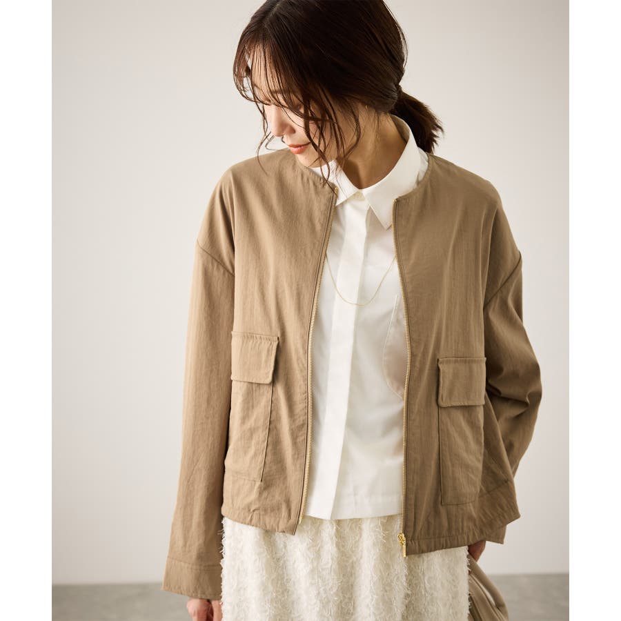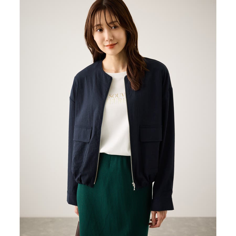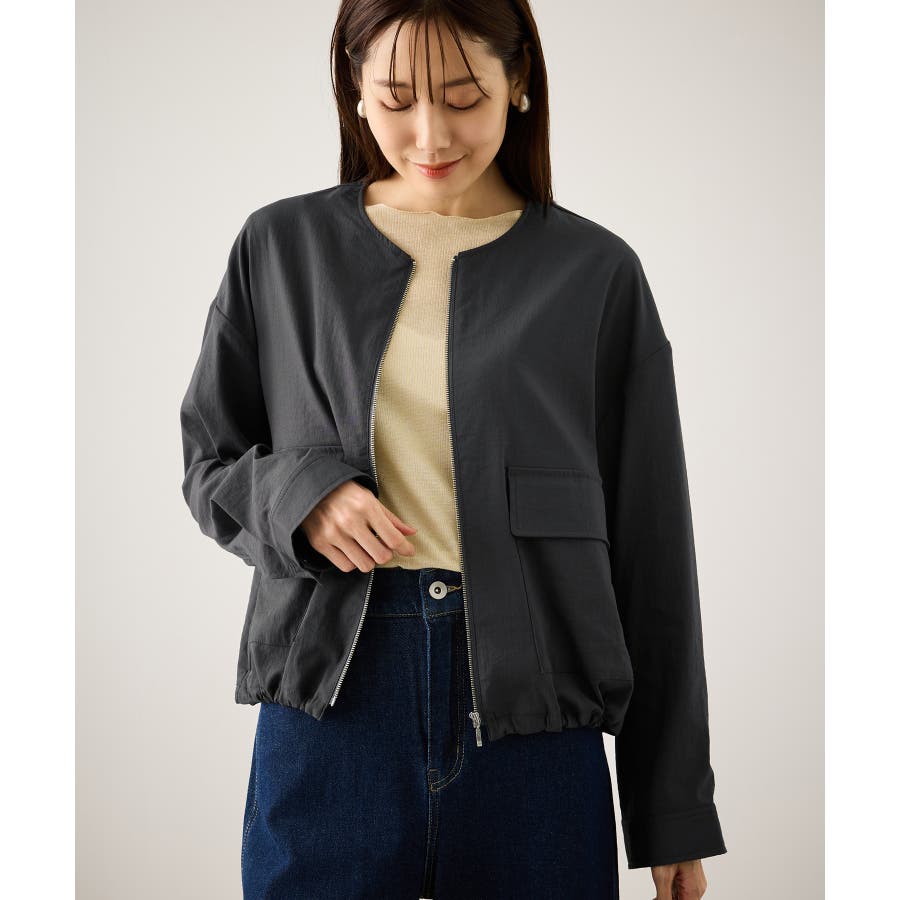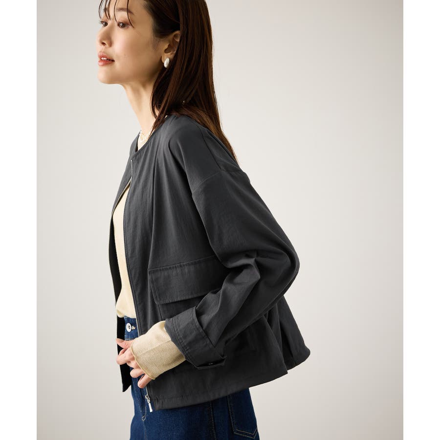 ・ノーカラーなので、カーディガン感覚で室内でも脱がずに羽織っていられるライトブルゾン。