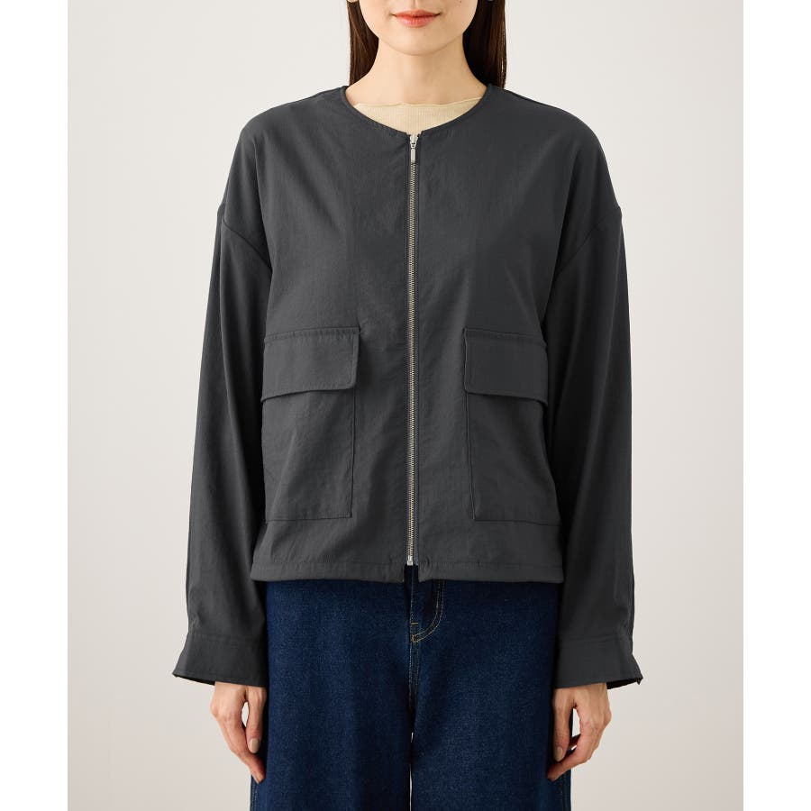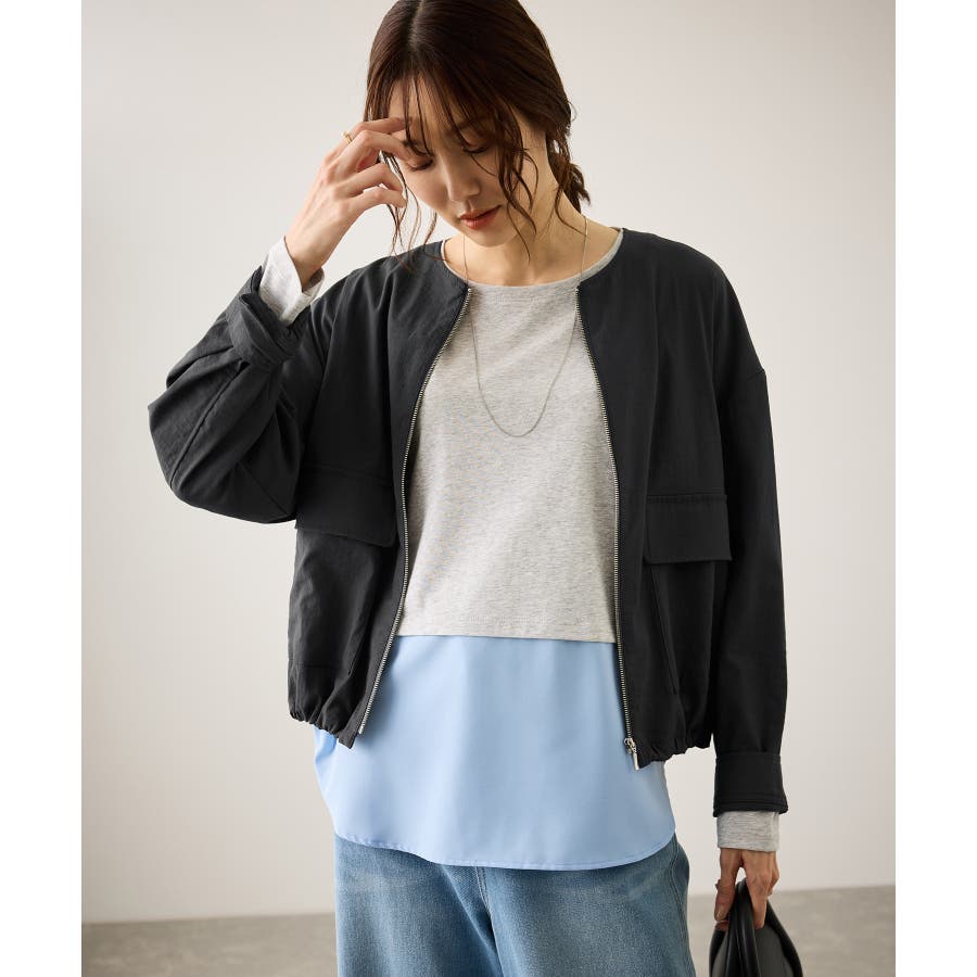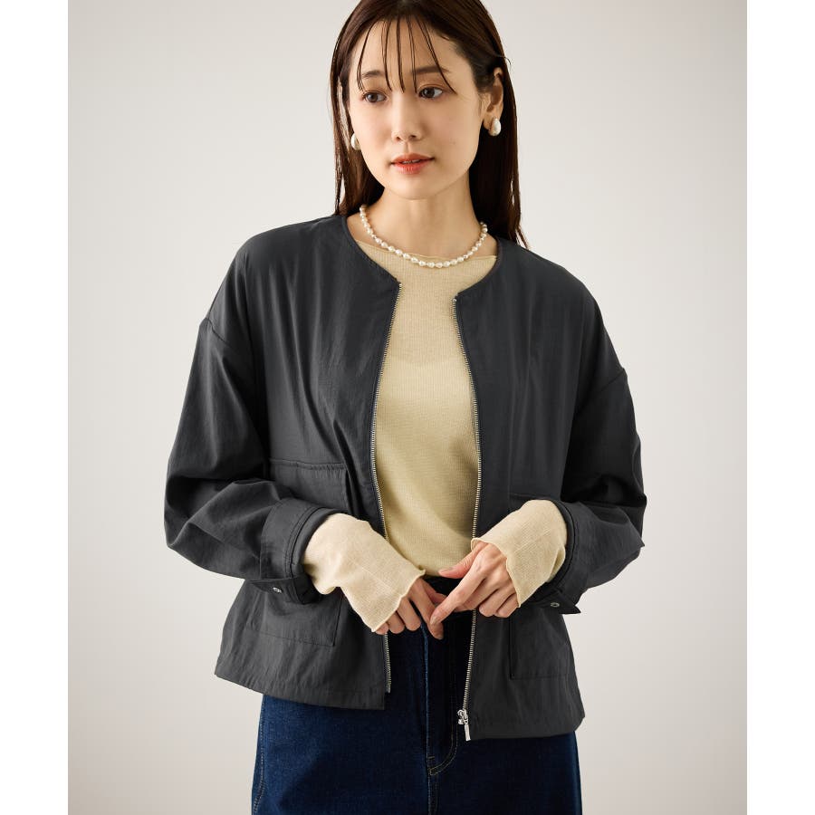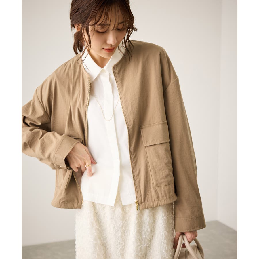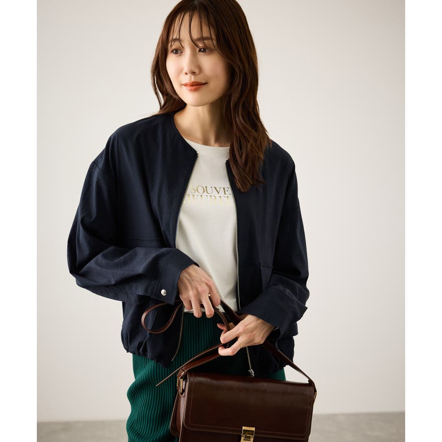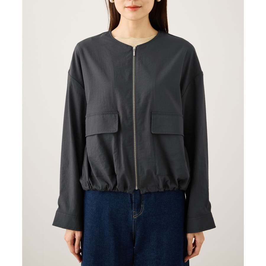 ・ノーカラーなので、カーディガン感覚で室内でも脱がずに羽織っていられるライトブルゾン。