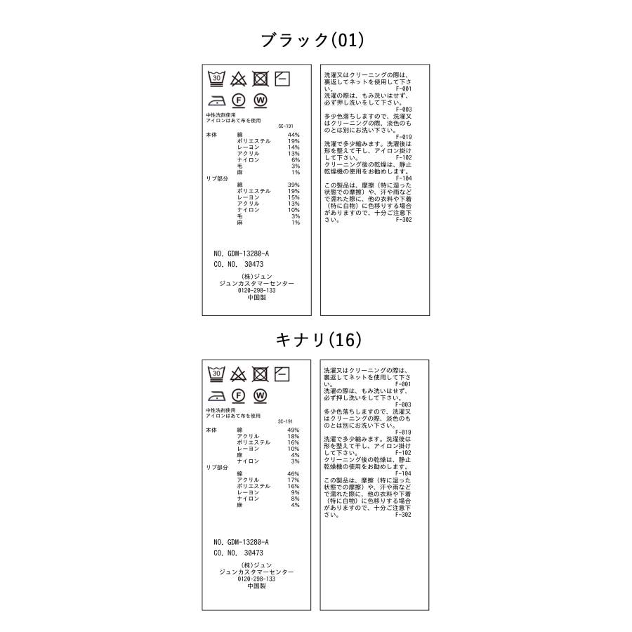 ブラック(01):綿 44% ポリエステル 19% レーヨン 14% アクリル 13% ナイロン 6% 毛 3% 麻 1%