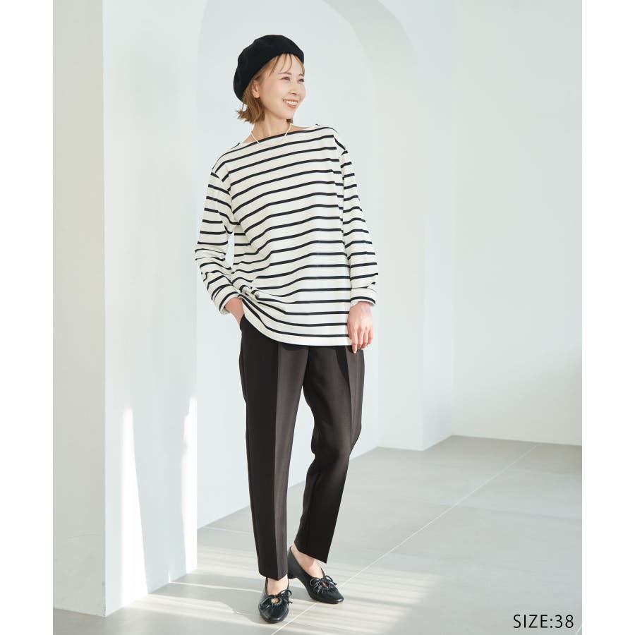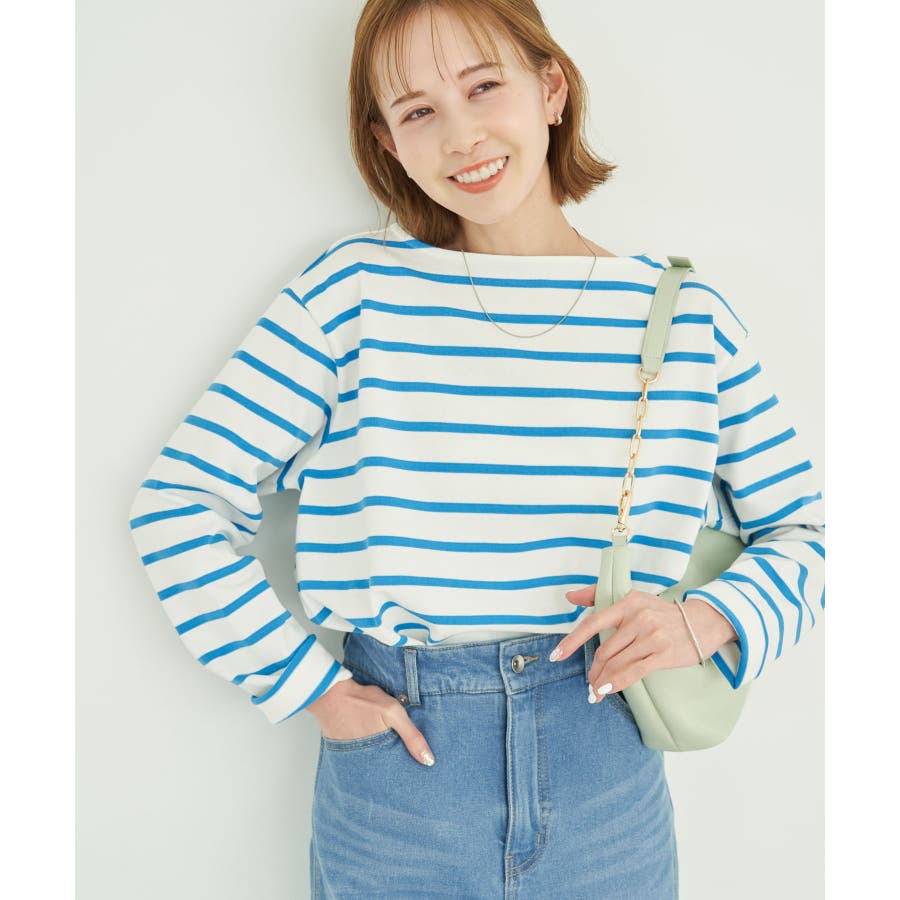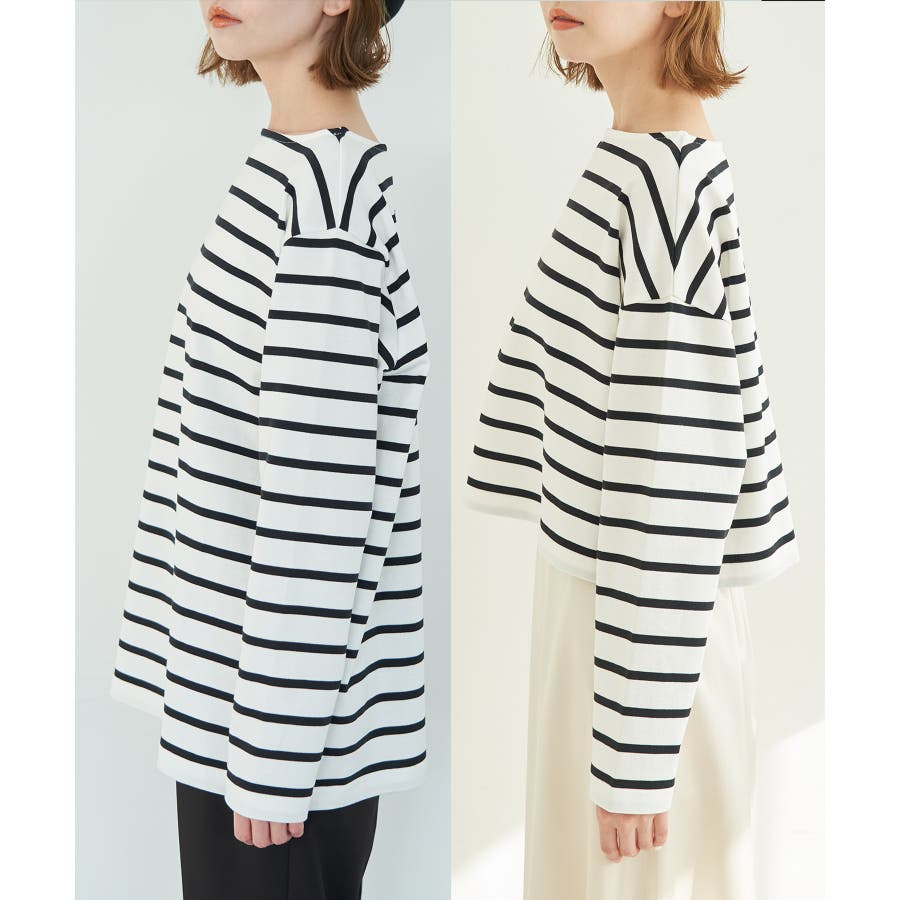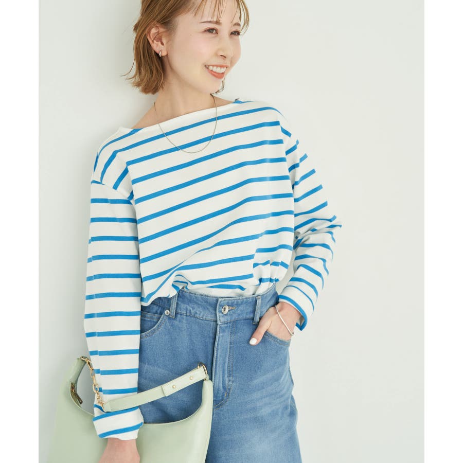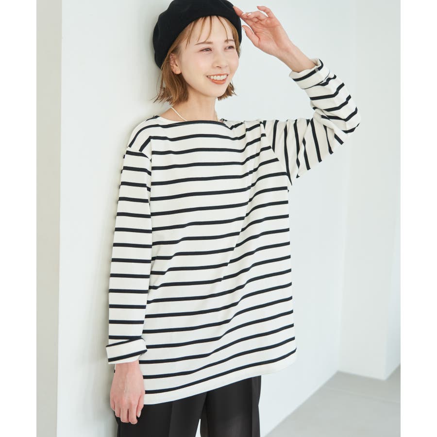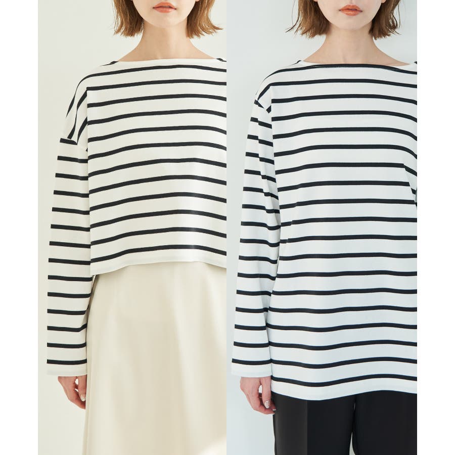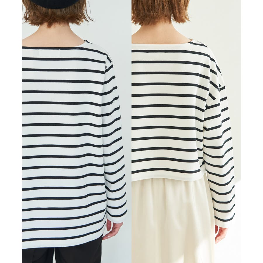 自分好みのサイズを選べる、人気の着丈が選べるシリーズ。 36サイズは38サイズより着丈が22.5cm短い。 : 【素材感】 ・着心地の良い綿100%。 【デザイン・シルエット】 ・人気の「着丈が選べる」シリーズ。 ・浅めで横開きも気にならないボートネック。 ・身頃はゆったりとしていて、幅広い体型をカバー。 【カラー】 ・キナリ系(17):オフホワイト×ブラック ・ブルー系(45):オフホワイト×ブラック ・レッド系(61):オフホワイト×ブルー 【スタイリングポイント】 ・ニットベストとのレイヤードでホリデーらしいコーディネートに。 ・デニムのサロペットも相性抜群。 ・プリントスカーフでアレンジを加えると上級者流のスタイルが完成。 ・同シリーズでKIDS(品番:GRM24010)も展開しているので、親子お揃いもおすすめ。 ----------------------------- 裏地:なし 透け感:なし 伸縮性:なし 生地感・厚さ:普通 季節:春・秋 ----------------------------- ※撮影時の光、お使いのモニター環境によって色の見え方が違う場合がございます。 ※KIDSは一部店舗限定になります。 ※モデル身長:165cm 着用サイズ:36/38