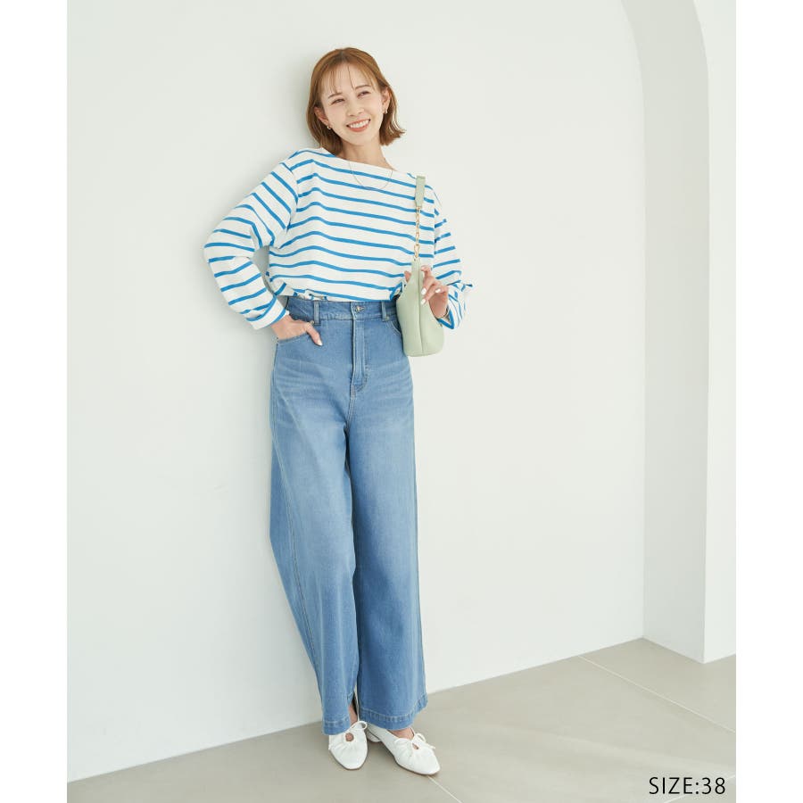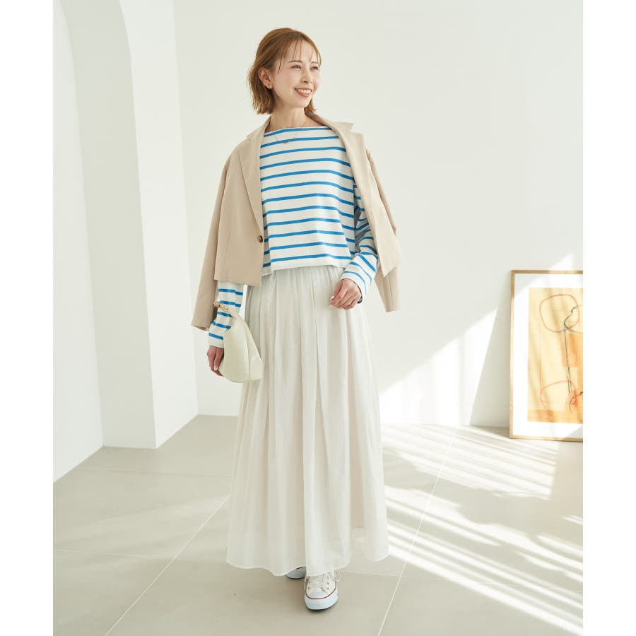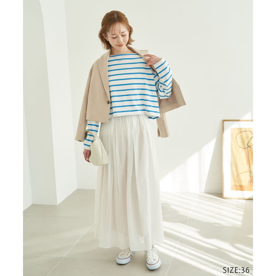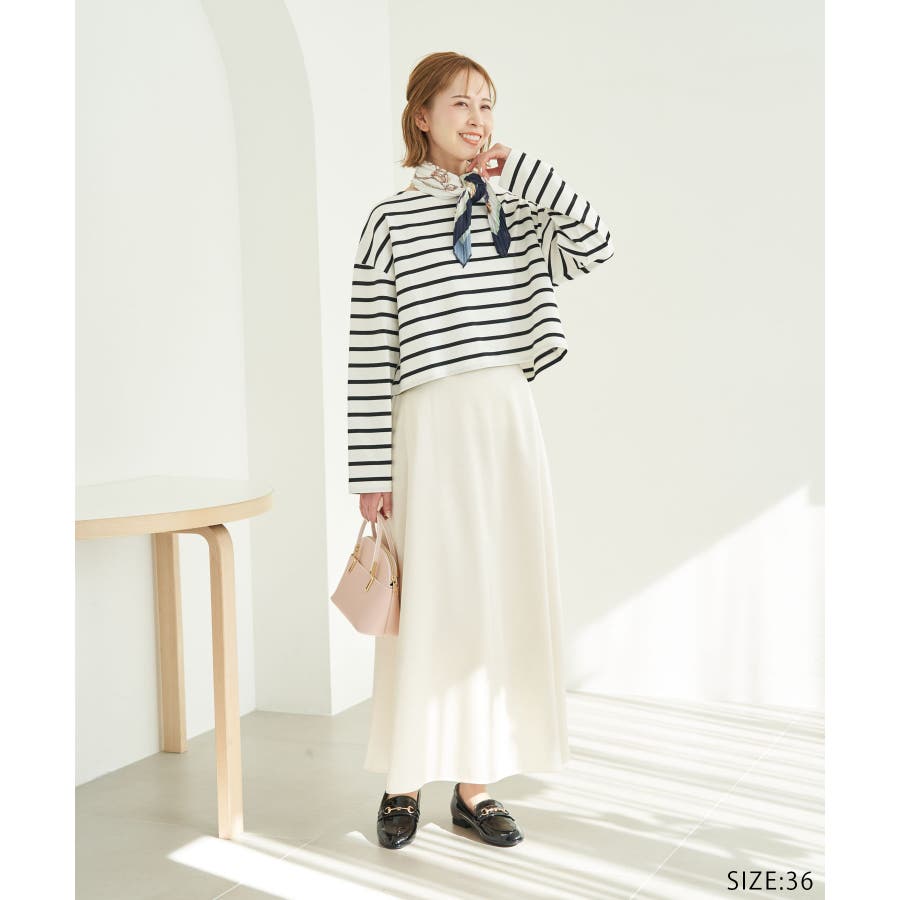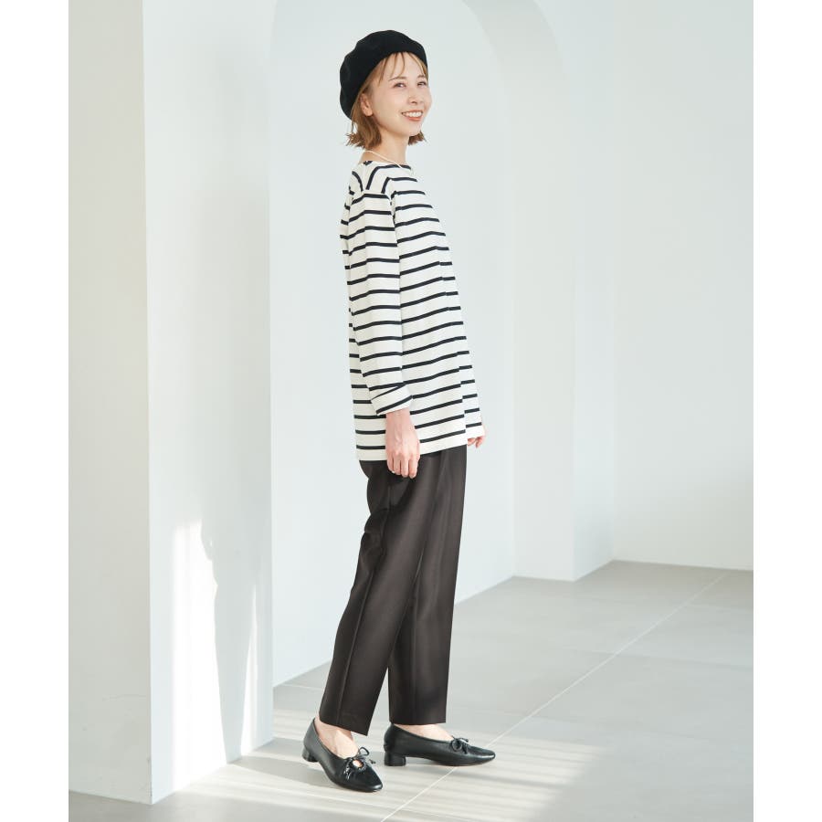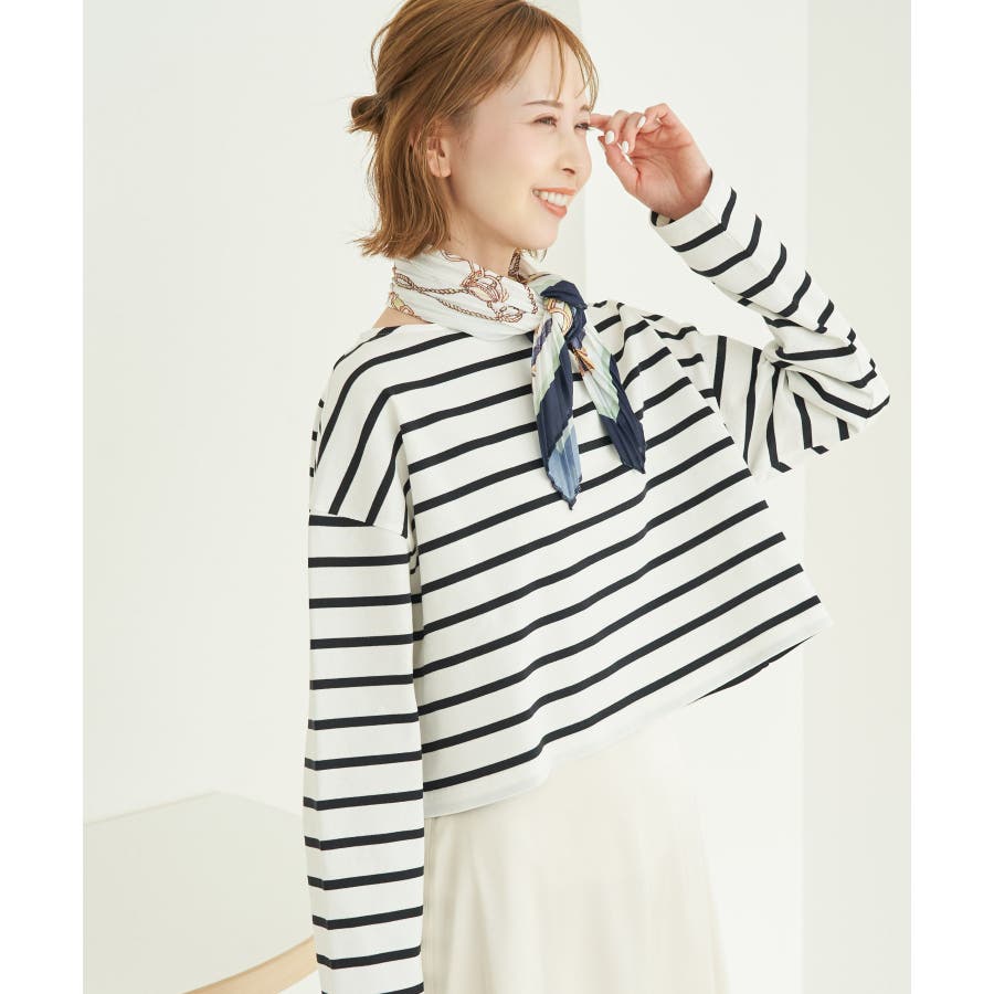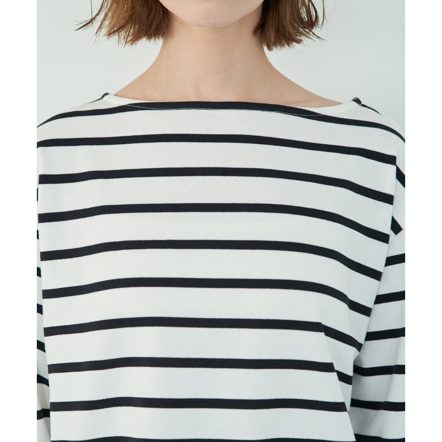自分好みのサイズを選べる、人気の着丈が選べるシリーズ。 36サイズは38サイズより着丈が22.5cm短い。 : 【素材感】 ・着心地の良い綿100%。 【デザイン・シルエット】 ・人気の「着丈が選べる」シリーズ。 ・浅めで横開きも気にならないボートネック。 ・身頃はゆったりとしていて、幅広い体型をカバー。 【カラー】 ・キナリ系(17):オフホワイト×ブラック ・ブルー系(45):オフホワイト×ブラック ・レッド系(61):オフホワイト×ブルー 【スタイリングポイント】 ・ニットベストとのレイヤードでホリデーらしいコーディネートに。 ・デニムのサロペットも相性抜群。 ・プリントスカーフでアレンジを加えると上級者流のスタイルが完成。 ・同シリーズでKIDS(品番:GRM24010)も展開しているので、親子お揃いもおすすめ。 ----------------------------- 裏地:なし 透け感:なし 伸縮性:なし 生地感・厚さ:普通 季節:春・秋 ----------------------------- ※撮影時の光、お使いのモニター環境によって色の見え方が違う場合がございます。 ※KIDSは一部店舗限定になります。 ※モデル身長:165cm 着用サイズ:36/38